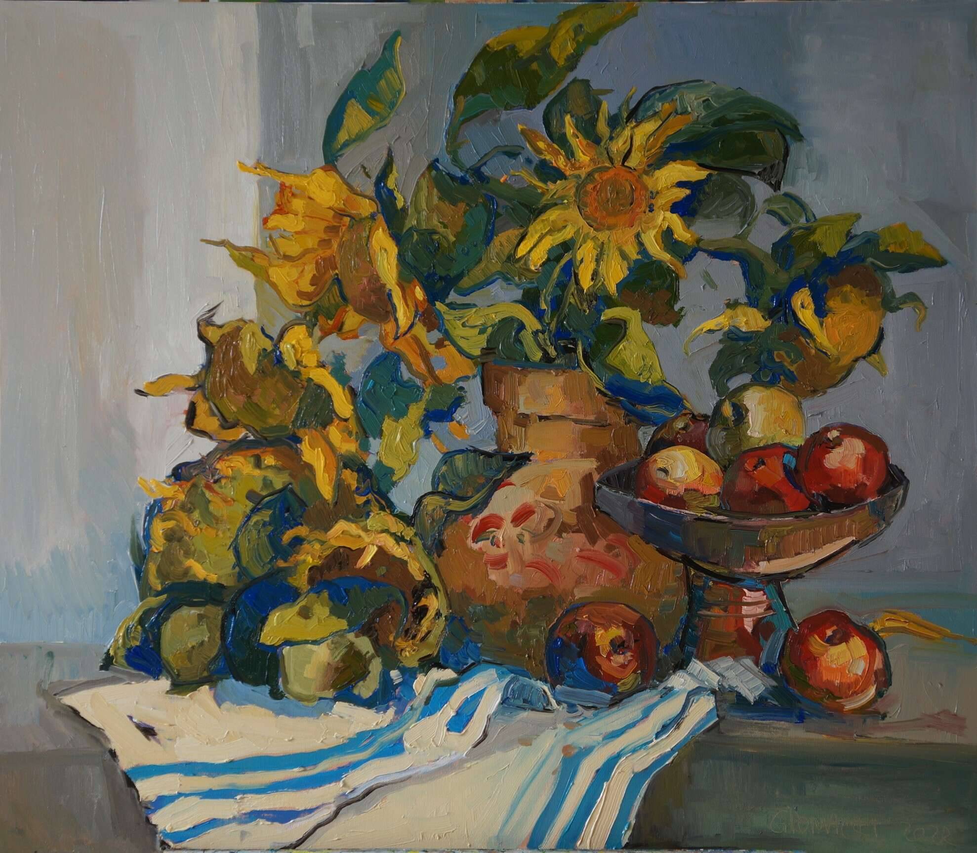 Na obrazie widać żywe kolory, które kontrastują z delikatnym, pastelowym tłem. W centrum kompozycji znajdują się słoneczniki o intensywnej żółci, które rozświetlają całość. Tajemniczość dodaje misa z czerwonymi jabłkami, które lśnią jak rubiny wśród zieleni liści. Obok, waza zdobiona kwiatowymi wzorami dodaje elegancji. Ale co to za magia! Kolory tańczą ze sobą w harmonii, tworząc pełen energii i optymizmu nastrój. Artysta zastosował technikę impasto, gdzie grube warstwy farby nadają obrazowi fakturę i trójwymiarowość. Pociągnięcia pędzla są dynamiczne, jakby artysta uchwycił chwilę twórczego uniesienia. Obraz ten przypomina mi letni dzień na wsi, gdy słońce błyszczy pełną mocą, a przyroda jest w swoim pełnym blasku. Patrząc na ten obraz, serce robi się cieplejsze. Wywołuje uczucie spokoju, ale i radości. To jak odkrywanie skrawka "happiness" w zatłoczonym świecie. Jakby ktoś krzyknął: "Zobacz, jakie piękne!" I pomimo łatwości, z jaką można by przejść obok, coś przyciąga i nie pozwala oderwać wzroku. "Mamo, te kwiaty są większe niż moje kucyki!" — mogłoby powiedzieć dziecko. Taka sztuka to prawdziwa uczta dla zmysłów.