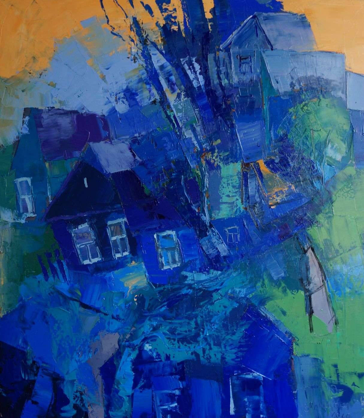 Obraz jest istną eksplozją kolorów. Dominuje intensywny niebieski, który płynnie przechodzi w soczystą zieleń, na tle zachodzącego pomarańczowego nieba. Kształty są nieco chaotyczne, przypominając kalejdoskop, w którym domy i drzewa tańczą w abstrakcyjnym rytmie. Atmosfera tego dzieła emanuje spokojem, ale i jednocześnie niepokojem, jakby coś złowrogiego wypełzało z ciemnych zakamarków. Choć na pierwszy rzut oka wszystko jest dość formalne, luźne pociągnięcia pędzlem nadają całości dynamiczności. Technika impasto, wykorzystana tutaj, dodaje fakturze obrazu głębii i charakteru. Myślę, że artysta celowo stworzył ten efekt, powodując, że odbiorca czuje się jak w wirującym labiryncie emocji. "Look, małe domki!" powiedziałoby pewnie dziecko. To trochę surrealistyczne, jakby scena z innego świata nawiedzała rzeczywistość. Wizja ta budzi refleksję nad chaosem codzienności i pięknem detali, które na ogół umykają naszym oczom.