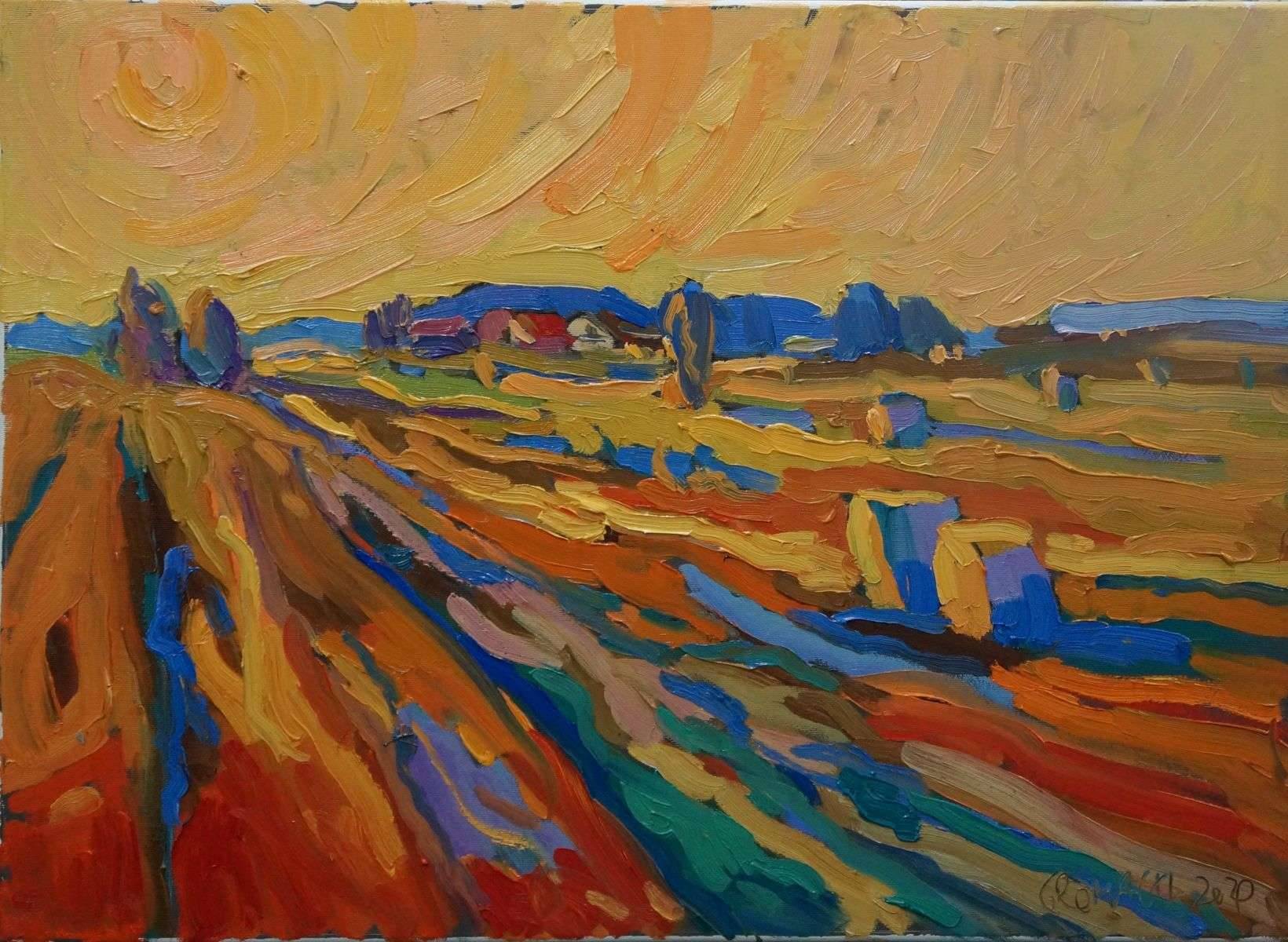 Obraz emanuje energią i ekspresją, pełen jest żywych kolorów i dynamicznych kształtów. Dominują tu ciepłe pomarańcze, żółcie oraz chłodne odcienie niebieskiego. Kompozycja jest pełna ruchu, jakby powiew wiatru układał krajobraz w niekończący się taniec. Nastrój jest jednocześnie spokojny i pełen życia, tworząc niepowtarzalną harmonię. Styl tego dzieła jest impasto, gdzie gęste pociągnięcia pędzla nadają tekstury i głębokości. Artysta używa tej techniki, by oddać intensywność chwil. Widać tu inspirację impresjonizmem, choć można dostrzec również nowoczesne akcenty. To, co mnie urzeka, to emocje - te wibracje subiektywnej radości i nostalgii. Obraz może wywoływać u widza uczucie tęsknoty za naturą. Dziecko mogłoby powiedzieć "To pole jest jak kolorowy sen!", co oddaje jego magiczny charakter. Dzieło, które mówi o pięknie chwili, chwilach, które czasem umykają. Perfect przykład na to, jak sztuka może poruszać serca i zmysły.