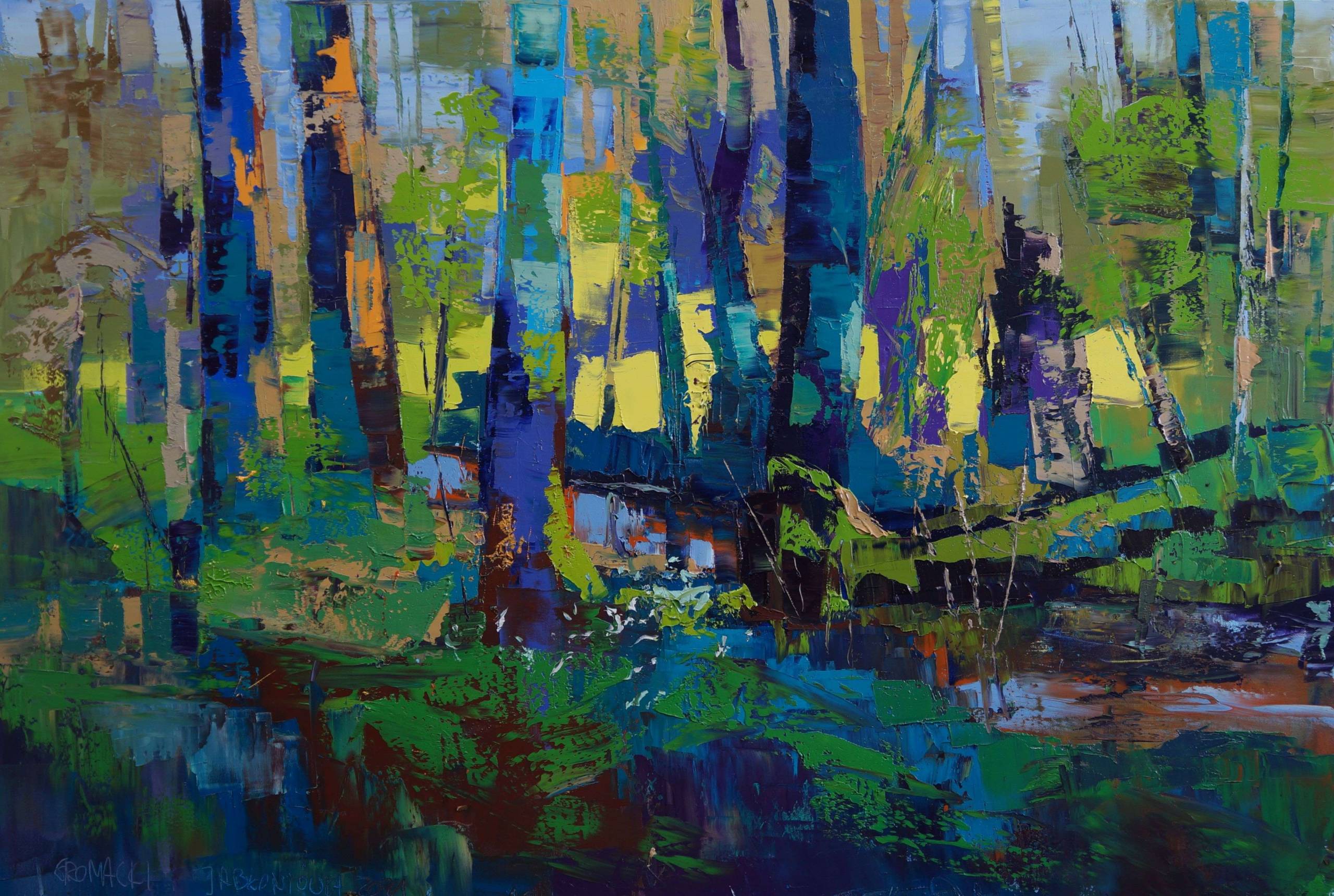 Obraz ukazuje magiczny las, w którym przeplatają się intensywne barwy: niebieskie, zielone i żółte. Drzewa są jak kolorowe słupy, delikatnie rozchwiane wiatrem. Kompozycja jest dynamiczna, z warstwami i pociągnięciami pędzla tworzącymi niemalże abstrakcyjny pejzaż. Atmosfera jest pełna życia, przypomina wiosenną przygodę w naturze, kiedy wszystko wokół wybucha eksplozją kolorów. Technika impasto, z grubymi warstwami farby, dodaje dziełu głębi. Wydaje się, jakby artysta bawił się kolorem i fakturą, aby uchwycić ulotny moment w przyrodzie. Wow, takie lasy to są super! Dla odbiorcy, obraz może wywołać poczucie spokoju, ale i ekscytacji, jakby odkrywał sekrety lasu. Może to być odzwierciedlenie harmonii z naturą i zachęta do jej odkrywania. Słowo "vibrant" idealnie opisuje ten obraz, pełen energii i siły życiowej. Czuć tu emocje, jakby natura odciskała swoje piętno na każdego, kto spojrzy na to dzieło. Wyobrażam sobie, że to miejsce, gdzie czas się zatrzymał, a my możemy oddychać pełną piersią, zatracając się w kolorach i kształtach tego wyjątkowego krajobrazu.