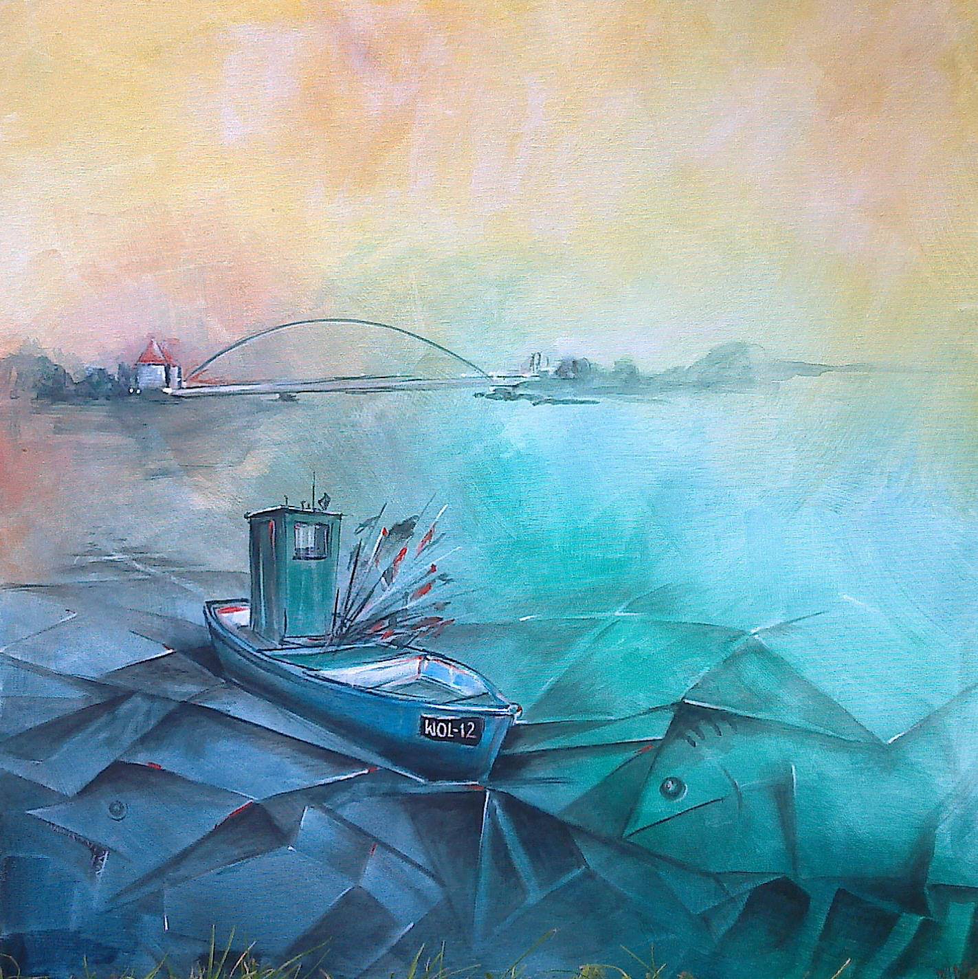 Obraz emanuje spokojem, ukazując małą łódź na nieruchomej wodzie, otoczona delikatnymi barwami błękitu i morskiej piany. Łódź z numerem "WOL-12" wydaje się dryfować na wielkiej rybie, jakby muzyka morza ją prowadziła. Tło pokrywa subtelna mgiełka żółci i różu, rozciągająca się aż po horyzont, gdzie cienki most łączy brzegi. Naprawdę, ten obraz to gdzieś pomiędzy snem a jawą, jedną stopą na ziemi, drugą w chmurach. Kompozycja pełna geometrii i delikatnych prześwitów, gdzie każda linia to pewnie świadome pociągnięcie pędzlem. Wygląda jak mieszanka impresjonizmu i modernistycznego twistu. Mamo, ale wielka ryba! Wywołuje to uczucie nostalgii, jakby po zachodzie słońca zatrzymać czas i po prostu być. Te kolory, tak łagodne i harmonijne, przenoszą w inną rzeczywistość. "Dreamlike," mógłby ktoś powiedzieć. Trochę to wszystko przypomina mi własne wspomnienia z wakacji nad jeziorem, gdzie cisza mówiła więcej niż słowa.