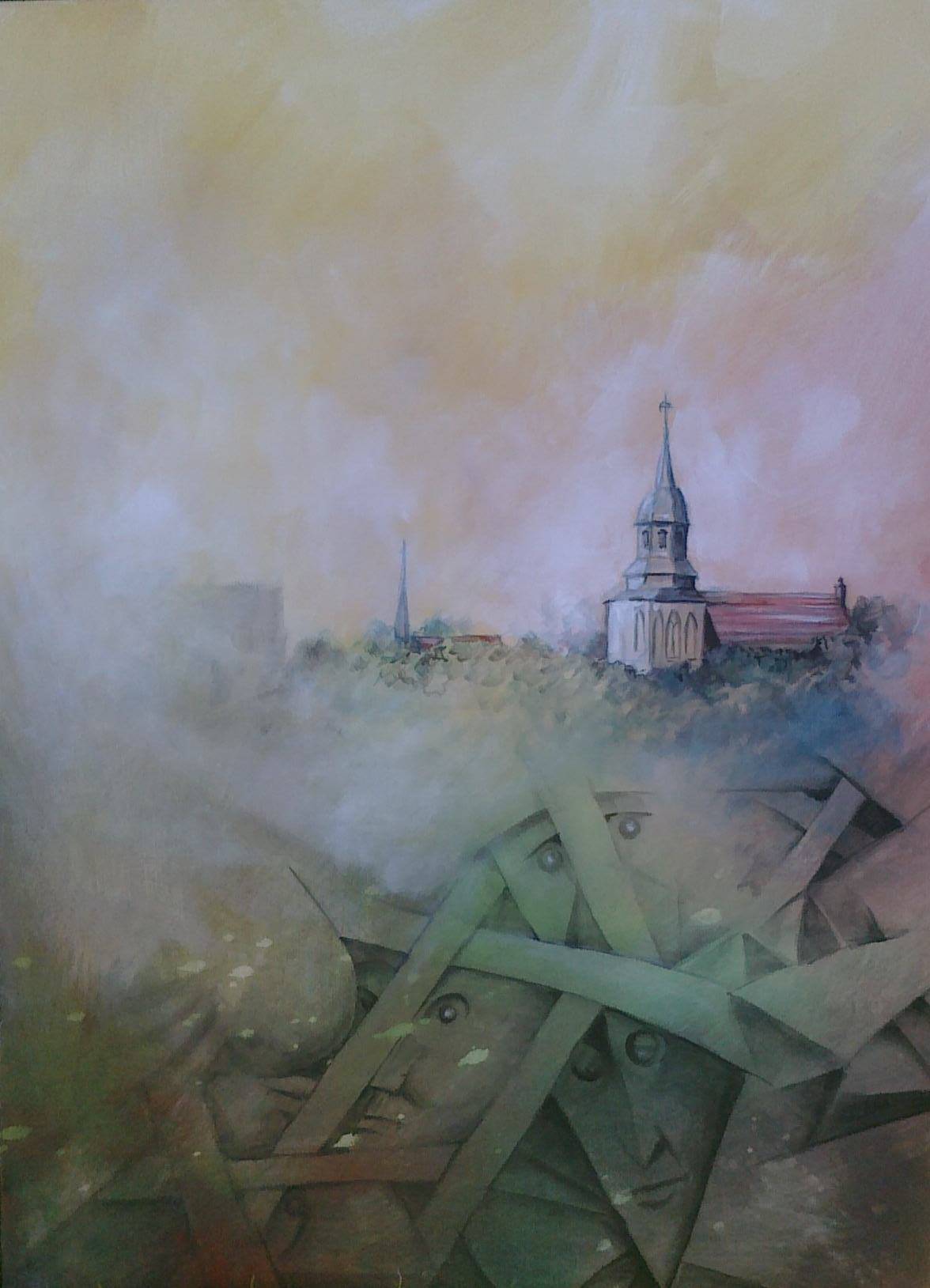 Obraz przedstawia subtelne zestawienie naturalnych elementów z geometrycznymi formami. Jasne, pastelowe kolory nieba zlewają się w delikatnych odcieniach żółci, pomarańczy i szarości, tworząc spokojny, niemal senny nastrój. Na horyzoncie dostrzegamy kościół, którego wieże wyraźnie odcinają się od reszty kompozycji. Budynek zdaje się unosić nad mgłą, jakby był wspomnieniem dawnych czasów. W dolnej części obrazu widzimy intrygujące kształty twarzy ukryte w geometrycznych, przecinających się liniach, które mogą symbolizować zacierające się wspomnienia. Atmosfera tego dzieła jest pełna refleksji i tajemnicy, skłaniająca do zadumy. Artystyczna technika, z pewną nonszalancją łącząca realizm z abstrakcją, sprawia, że obraz wydaje się jak sen z pogranicza jawy. From my perspective, ta mieszanka daje wrażenie nieuchwytności, coś na kształt wspomnień, które znikają, gdy próbujemy je uchwycić. Patrząc na to dzieło, można odczuć pewną nostalgię, a może nawet lekkie zagubienie. Czy te twarze mają coś wyrazić, czy raczej skrywają swe własne historie w ramach, które są dla nas niewidzialne? Małe dziecko, patrząc na to, mogłoby powiedzieć: „To jest dziwne, ale fajne”. I może w tej prostocie tkwi część magicznej mocy tego obrazu.
