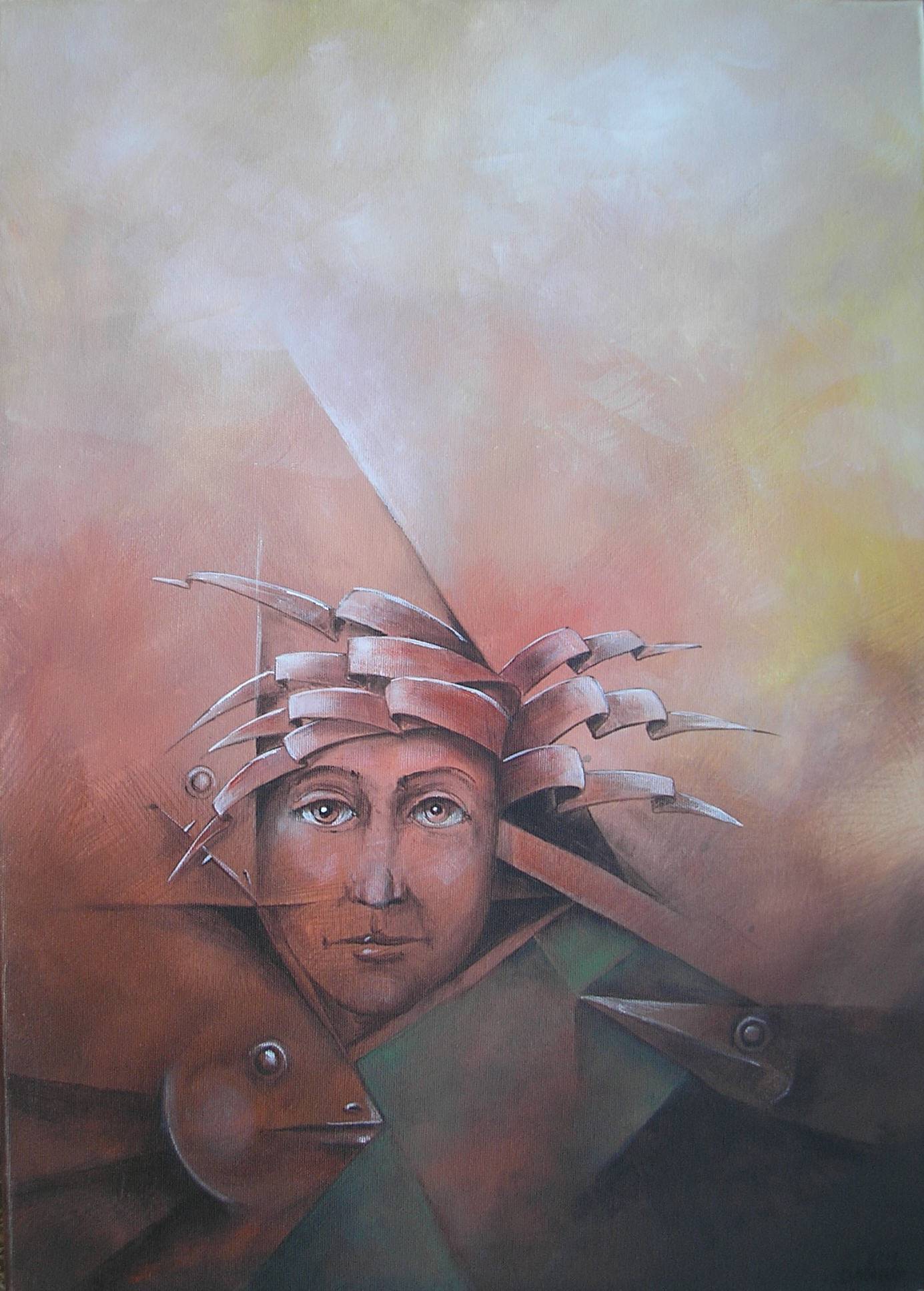 Obraz emanuje subtelnymi odcieniami brązu i pomarańczu, które stapiają się z pastelowym tłem. Główna postać z wyrazistymi oczami dominuje w centrum kompozycji, otoczona przez abstrakcyjne formy przypominające płytki ułożone na głowie niczym korona. Moim zdaniem jej spojrzenie jest pełne tajemnicy, jakby próbowało przekazać niewypowiedzianą opowieść. Atmosfera obrazu jest spokojna, ale zarazem nieco niepokojąca przez nietypowe kształty i struktury otaczające postać. Styl artystyczny zdaje się łączyć surrealizm z kubizmem, tworząc dynamiczne linie i formy, które pobudzają wyobraźnię. Obraz może wzbudzać ciekawość i zastanowienie nad złożonością ludzkiej psychiki. Jakby artysta chciał powiedzieć coś więcej niż widać na pierwszy rzut oka. Simply amazing! Techniki użyte przez artystę, jak gra cieni i światła, dodają głębi i trójwymiarowości. Patrząc na dzieło, mogę zanurzyć się w refleksjach nad tym, co kryje się w umysłach innych. Wow, ta przestrzenność! Dziecko mogłoby powiedzieć: ten obraz jest jak z bajki o dziwnych stworach! To połączenie awangardy z elementami zagadki może zainspirować do własnych przemyśleń i poszukiwań.
