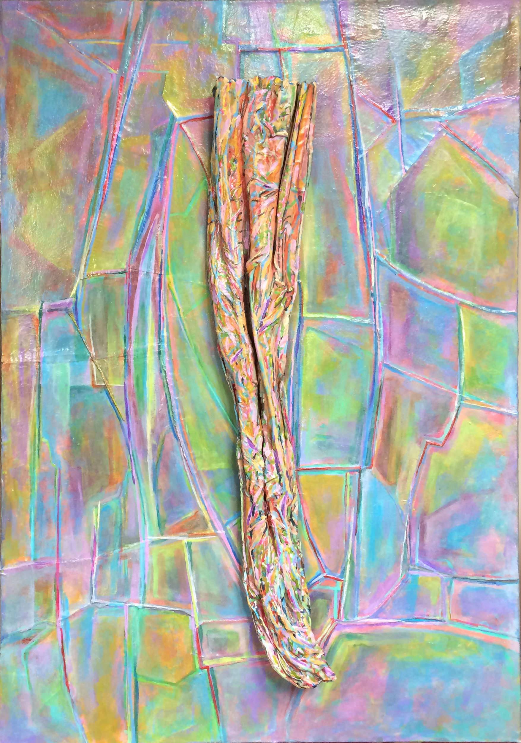 Delikatne kolory : róż , zieleń , niebieski . prawidłowo przyklejane fragmenty naturalnych skór , malowany farbą akrylową , werniksowany . Istnieje element dekoracyjny zawieszany dodatkowo lub samodzielnie na żyłce nylonowej obok obrazu a wykonany z lnu , bawełny , usztywniony klejem naturalnym .