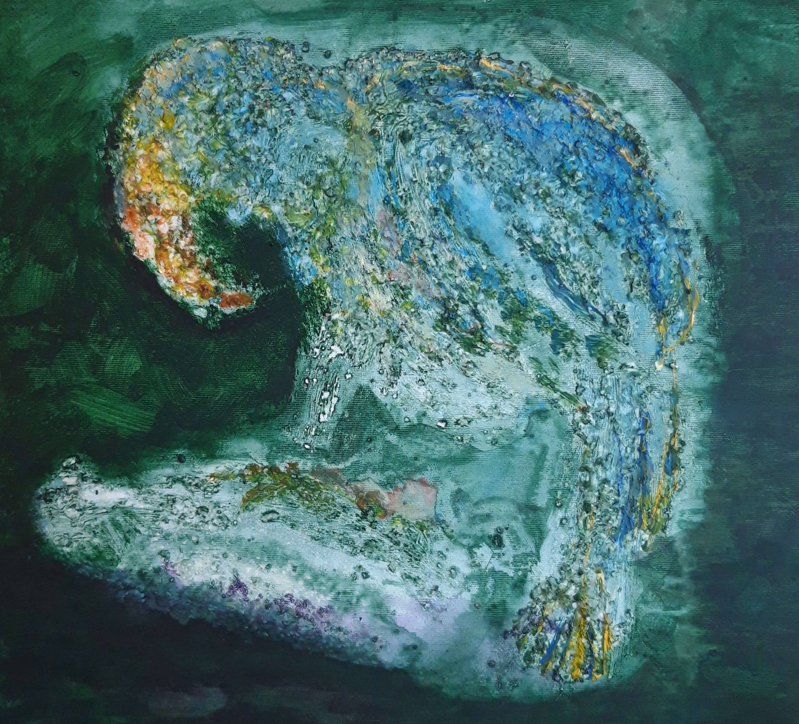 Na tym obrazie dominują ciemnozielone tony, które tworzą tajemnicze tło dla kształtu przypominającego postać. To, co zwraca uwagę, to eksplozja koloru: niebieskie, pomarańczowe i białe plamy, które zdają się skrzyć, angażują wzrok na dłużej. Cała scena przypomina trochę impresjonistyczny chaos, ale jest w tym swoisty ład. Artysta zastosował technikę impasto, dzięki czemu faktura jest wyraźna, a farba nakłada się grubo, tworząc niemal trójwymiarowy efekt. Atmosfera jest pełna melancholii i refleksji, coś jak "hmm, czy ja to rozumiem, czy nie". Styl obrazu jest trochę jak z innego świata. Może to jakaś chimera albo metafora zagubienia. Zresztą, kto wie. Siedmiolatek powiedziałby: "To wygląda jak kosmita z lodów". Przy pierwszym spojrzeniu czuje się pewien niepokój, ale z czasem ten chaos przeradza się w fascynację. Dreamlike wizja zachęca do zagłębienia się w myśli i własne interpretacje. Czy to ptak, czy człowiek, każdy zobaczy coś innego. Obraz przyciąga, wciąga i każe się zastanowić nad życiem.