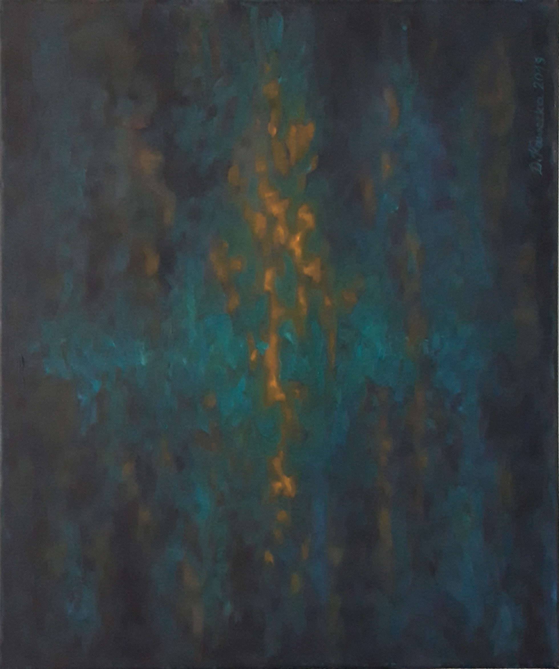 Obraz to wyjątkowa mieszanka ciemnych, chłodnych tonów oraz ciepłych, złocistych przebłysków światła. Dominują tu odcienie głębokiego błękitu i zieleni, które zdają się otulać wibrujące pomarańczowe kontrasty. Kompozycja jest nieco abstrakcyjna, pełna zamglonych kształtów i dynamicznych pociągnięć pędzla. Artysta zastosował technikę impastu, co dodaje dziełu tekstury i głębi. Patrząc na ten obraz, czujemy jakbyśmy zanurzali się w tajemniczy świat, pełen sekretnych opowieści i emocji. Atmosfera obrazu jest jednocześnie spokój i niepokojąca. Te kontrastowe barwy wprowadzają aurę intrygi. Może jeden z tych obrazów, których sens jest ukryty gdzieś poza zasięgiem wzroku. Człowiek nie wie, czy to dzień, czy może noc. Technika artystyczna skomplikowana, ale efekt wow. Widz odczuwa swego rodzaju nostalgię, może mały smutek, ale też fascynację. Wygląda jak tajemnicza komnata pod wodą. "To trochę straszne i super cool!" - jakby powiedziało dziecko. Ta dzieło sztuki pozwala widzowi na wiele różnych interpretacji. Może symbolizować wewnętrzną walkę czy poszukiwanie światła w ciemności. Używając słowa mystery, artysta otwiera drzwi do refleksji, porusza coś, co wydawało się wcześniej nieuchwytne. Oglądając ten obraz, czujemy, jakbyśmy stali na progu czegoś wielkiego i jednocześnie niedostępnego. Taki jest właśnie sekret piękna sztuki, która potrafi mówić, nie używając ani jednego słowa.