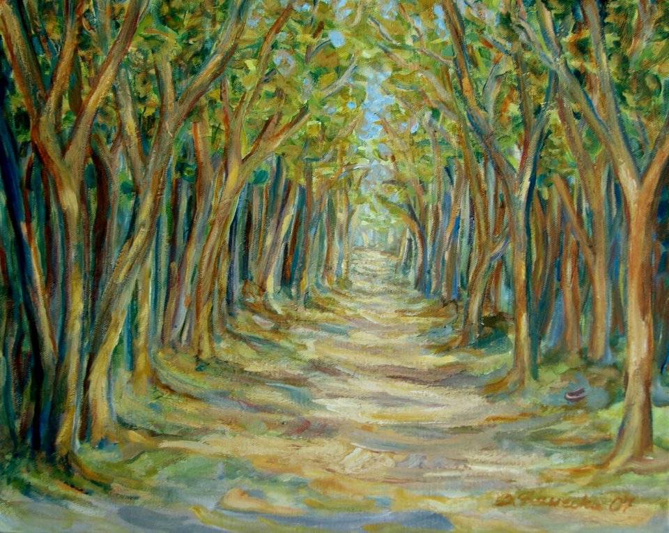 Na obrazie widzimy urokliwą leśną ścieżkę, która zdaje się ciągnąć aż po horyzont. Drzewa o smukłych pniach, malowane w zielono-brązowych tonacjach, tworzą tunel, przez który prześwituje delikatne światło. Ciepłe barwy mieszają się z chłodniejszymi, co nadaje kompozycji dynamicznego charakteru. Pociągnięcia pędzla są wyraziste, przypominają efekt impresjonistyczny, z wyraźnymi plamami kolorów. Artysta wykorzystał technikę chyba olejową, co dodaje głębi i tekstury. Atmosfera emanuje spokojem, przeplatając się z lekkim niepokojem – coś jak dream, który zbliża nas do przyrody. Odczuwam harmonię i zacisze tego miejsca. Czuję, że to las, w którym mógłbym się snuć godzinami, gubiąc czas i myśli. Może to miejsce, gdzie spotkałbym wróbelka? Słowa same płyną, gdy patrzę na ten obraz – nostalgia za czymś znanym i nieznanym naraz. Dzieło wzbudza refleksje nad ulotnością chwil, nad pięknem natury, które tak łatwo przegapić w codziennym biegu. Czy kiedykolwiek spacerowałeś po takim lesie? Każda linia, każdy kolor zdaje się szeptać własną opowieść, a ja, widząc to wszystko, po prostu odpływam.