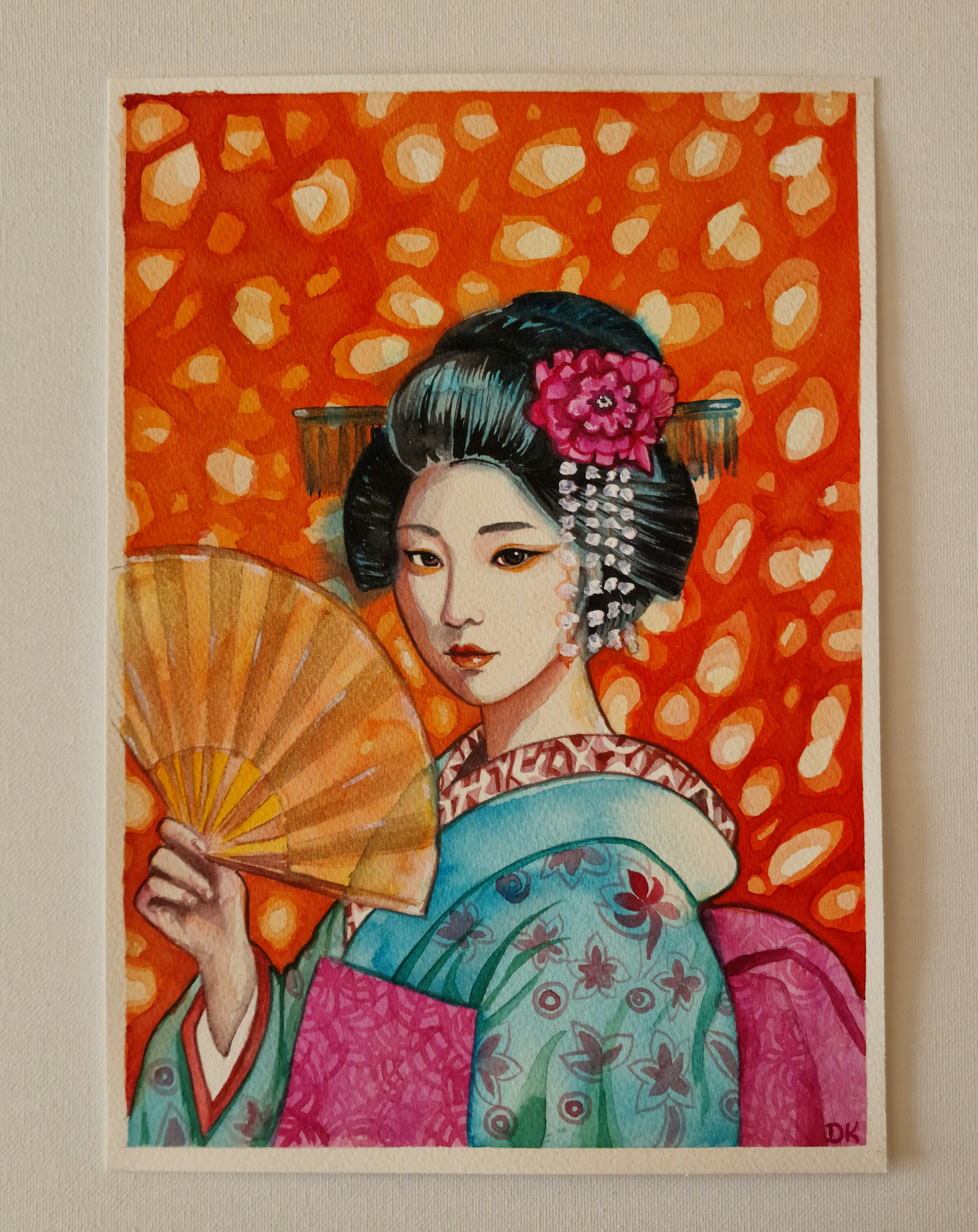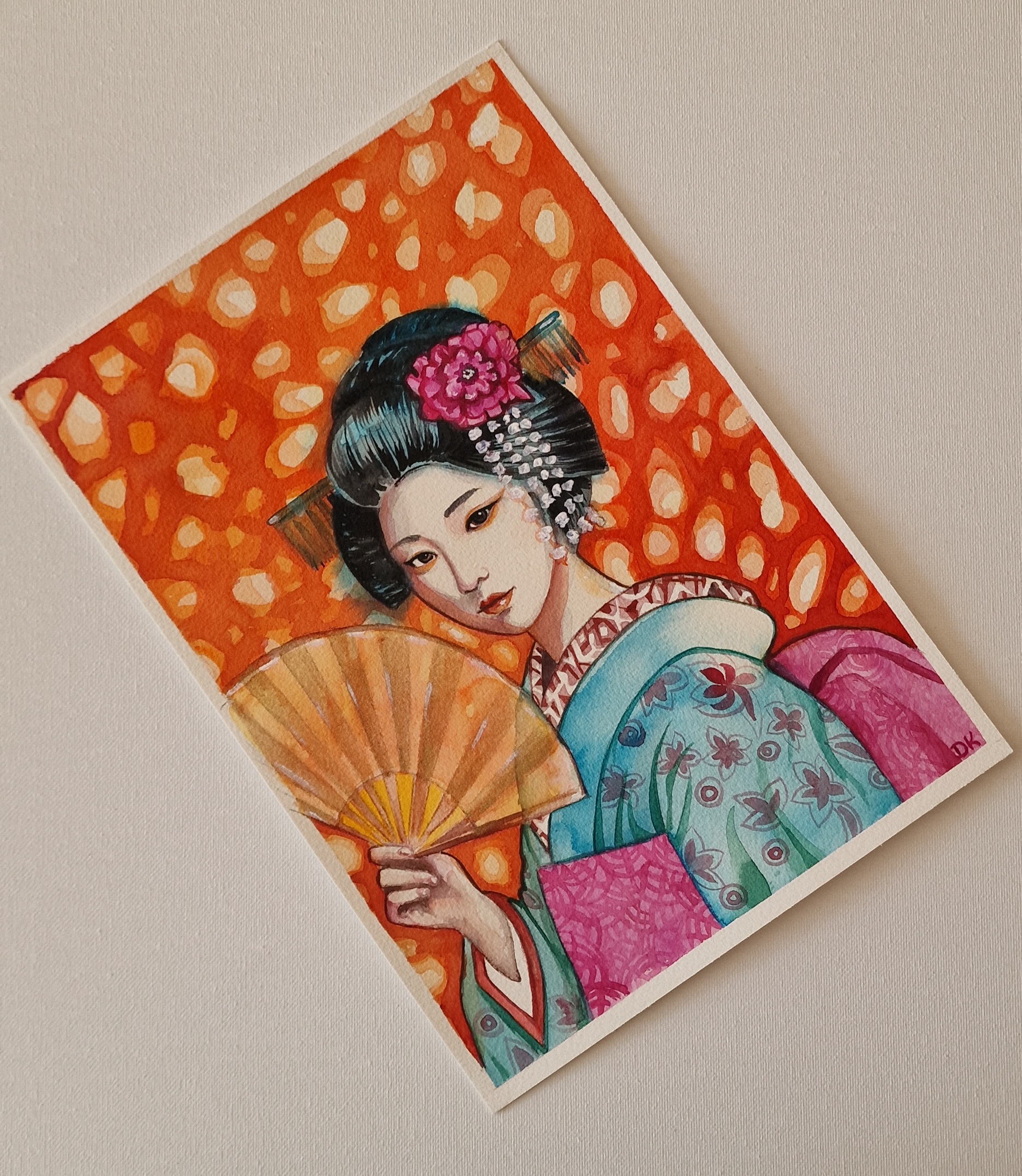 Na obrazie widzimy elegancką kobietę w tradycyjnym stroju japońskim, z wachlarzem w dłoni. Kolory są tu naprawdę intensywne - dominuje soczysty pomarańcz tła, który przypomina delikatne plamy światła latem. Kontrastuje on z subtelnymi odcieniami niebieskiego i różowego na kimono, które jest dekorowane kwiecistymi wzorami. Kompozycja jest spokojna, a mimo to pełna życia. Styl artystki zdaje się być inspirowany tradycyjnymi technikami japońskimi, ale z odrobiną nowoczesności. A emocje? Obraz jest melancholijny, ale jednocześnie z nutą tajemnicy. Może trochę smutny. Czuję jakby postać miała swoje ukryte historie, które aż proszą się o odkrycie. To dzieło przypomina mi moją dziecięcą zabawę w przebieranki, gdzie każda sukienka kryła nową przygodę. Urok i prostota tego dzieła sprawiają, że chciałoby się być na chwilę w tym fantastycznym świecie. Przedstawiona praca to oryginalna akwarela w formacie A4 (21 x 29,7 cm), namalowana na wysokiej jakości, grubym papierze akwarelowym, wykonanym w 100% z bawełny. Praca jest nieoprawiona. Wysokiej jakości papier bawełniany zapewnia trwałość i doskonałe nasycenie kolorów.