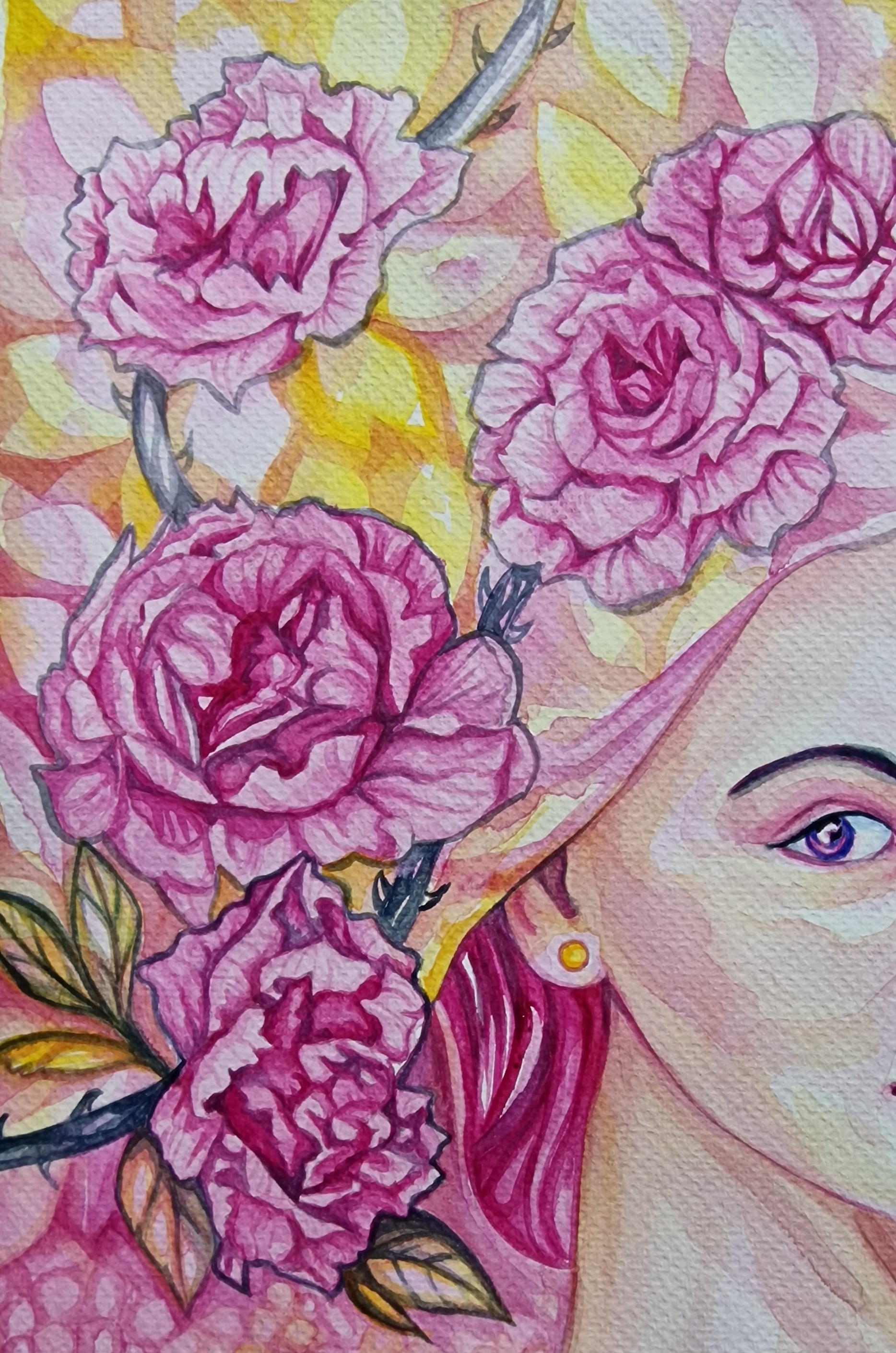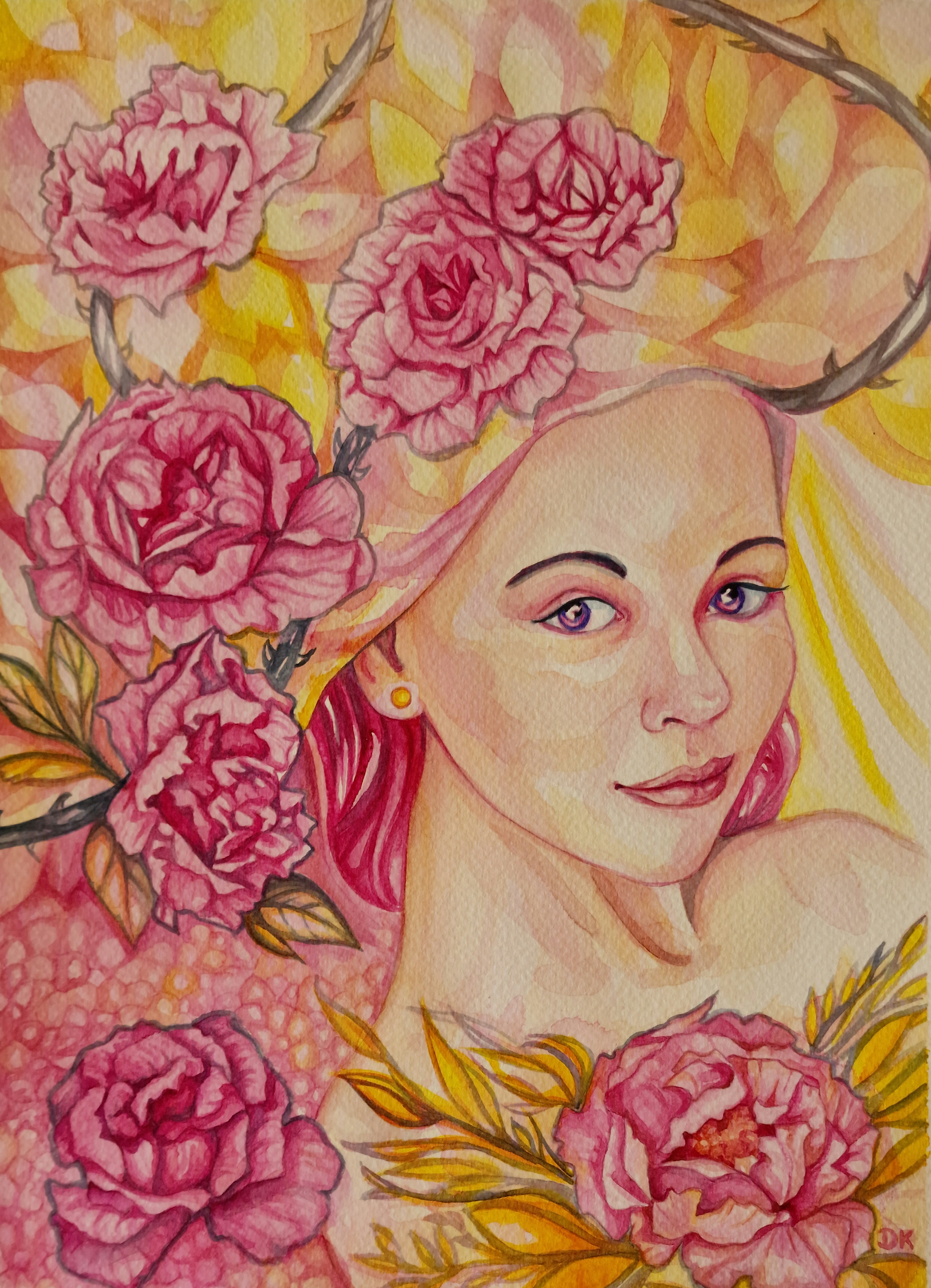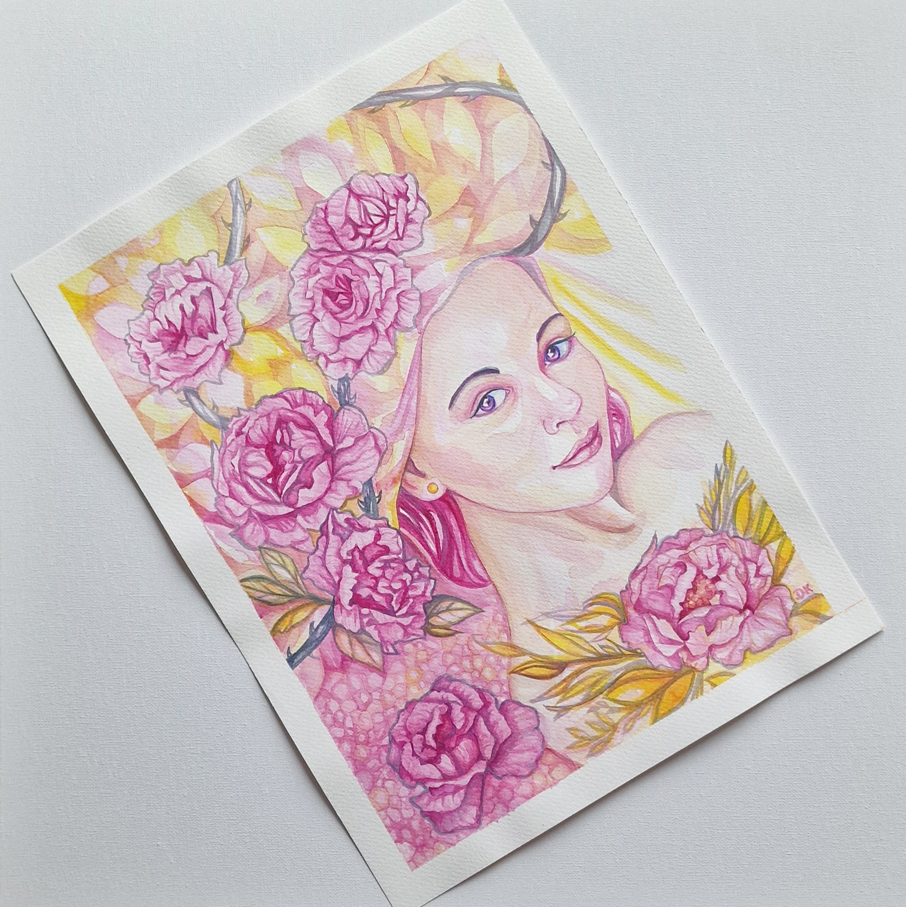 Ten obraz to subtelna i poetycka kompozycja wykonana techniką akwareli, która emanuje delikatnością i emocjonalną głębią. Centralną postacią jest kobieta spoglądająca spokojnie i bezpośrednio na widza. Jej twarz promienieje miękkim światłem, a drobny żółty kolczyk dodaje subtelnego akcentu. Otoczona bujnymi, różowymi kwiatami postać zdaje się być częścią natury, niemal z nią zespolona. Kwiaty oplatają jej głowę i ramiona, wtapiając się w tło pełne ciepłych odcieni żółci i różu. Całość tworzy atmosferę marzenia, jakby scena rozgrywała się w świecie między jawą a snem. Kolory są miękkie, rozmyte, typowe dla akwareli, a jednocześnie intensywne i pełne życia. To dzieło można odczytać jako metaforę duchowego związku z naturą, pięknem i delikatnością. Tytuł „Poślubiona róży” sugeruje głęboką więź – może z uczuciem, może z samą ideą piękna. Obraz został namalowany na papierze do akwareli o gramaturze 300, wymaga oprawy.