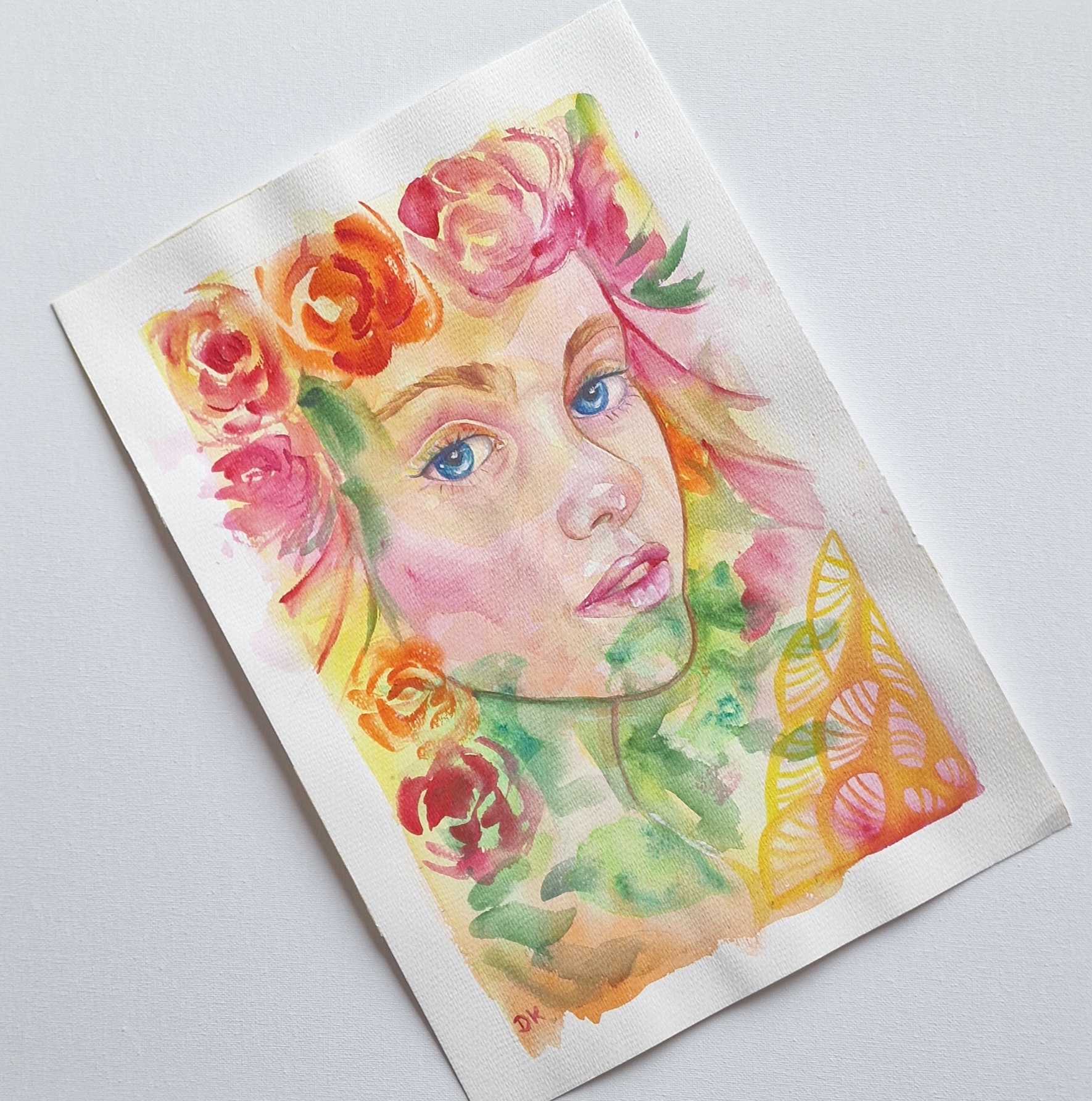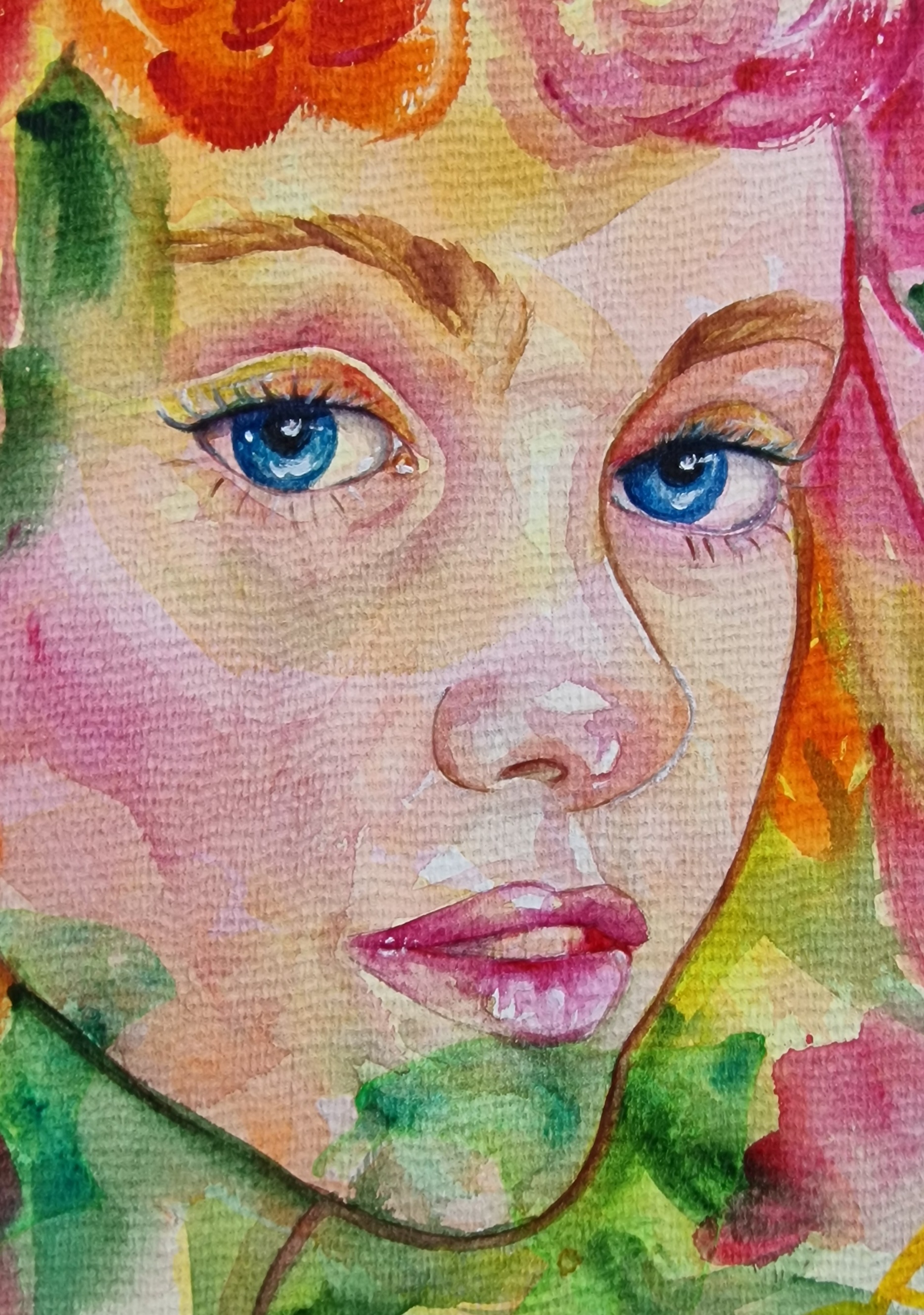 Obraz ukazuje twarz młodej dziewczyny otoczonej feerią barw i kształtów przypominających kwiaty. Dominują ciepłe kolory, jak róż, pomarańcz i żółć, przeplatające się z plamami zieleni. Za pomocą delikatnych pociągnięć pędzla, artysta stworzył subtelny chaos, który emanuje świeżością i lekkością. Nastrój tego dzieła jest jak letnie popołudnie, kiedy niebo jest czyste, a powietrze pełne zapachów kwiatów. Styl przypomina impresjonizm z nutką surrealizmu, gdzie rzeczywistość miesza się ze snem. Technika akwareli dodaje mu pewnej ulotności i dynamiczności. Emocje, jakie wywołuje, mogą być różnorodne. Dla mnie jest to przede wszystkim spokój połączony z pewną nieuchwytnością. Ta twarz, skoncentrowana i zamyślona, zdaje się żyć własnym życiem. Wzrok dziewczyny sugeruje delikatne zagubienie w pięknie świata. To magiczne połączenie na pewno przyciąga uwagę i zachęca do refleksji nad pięknem natury.