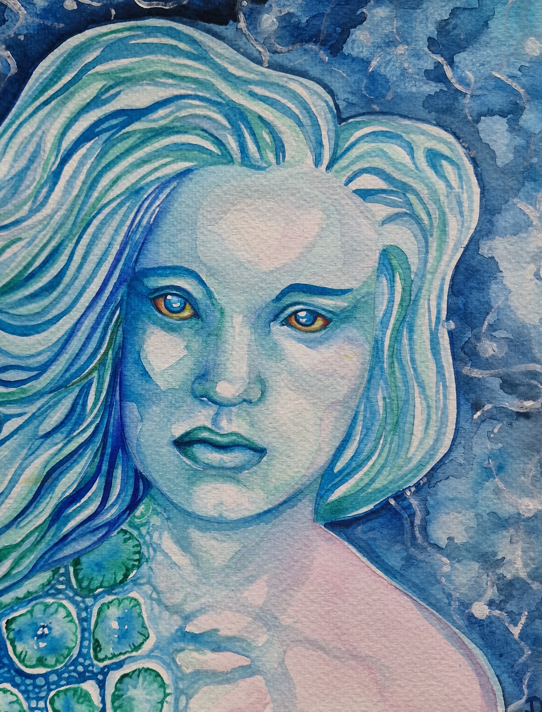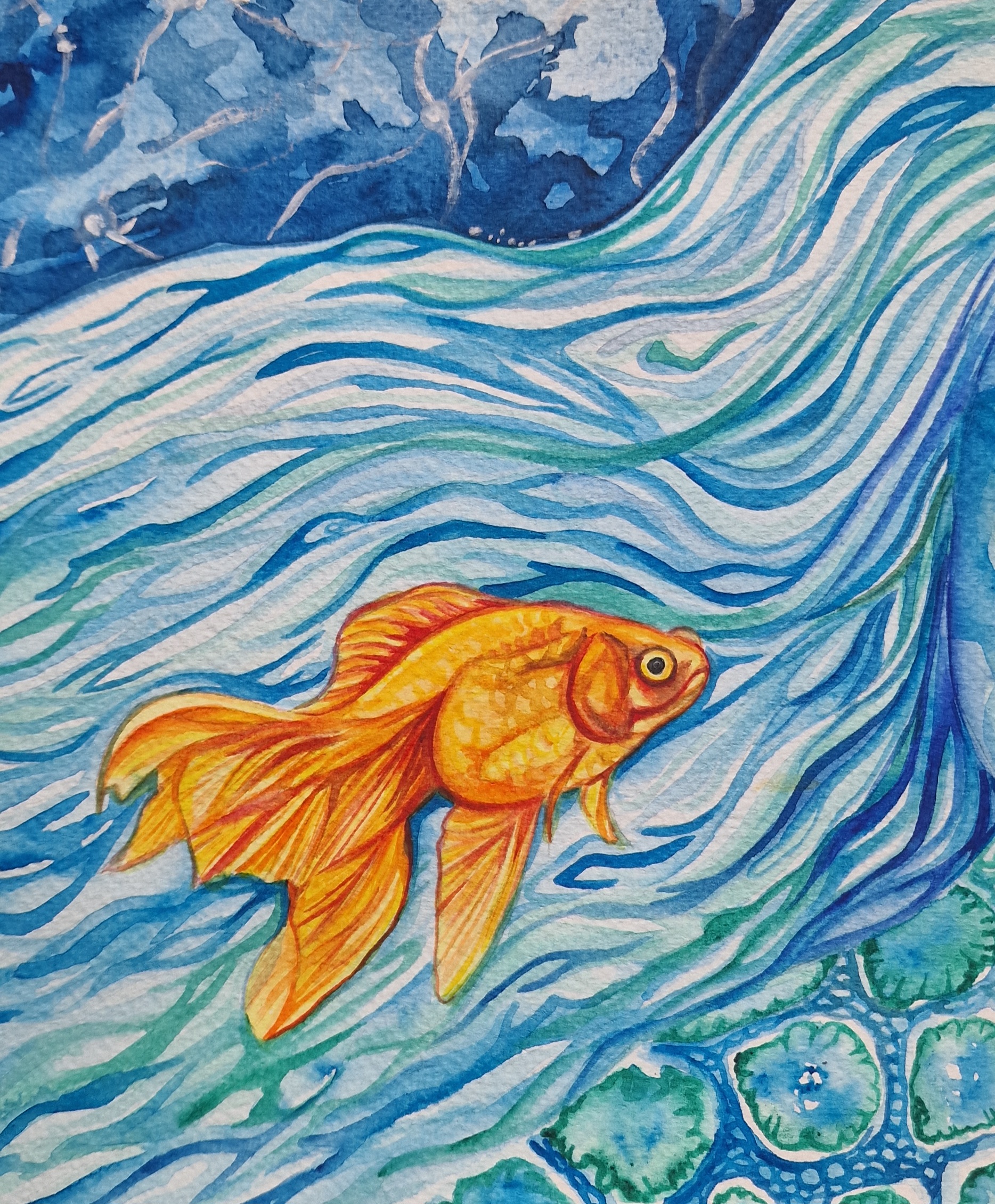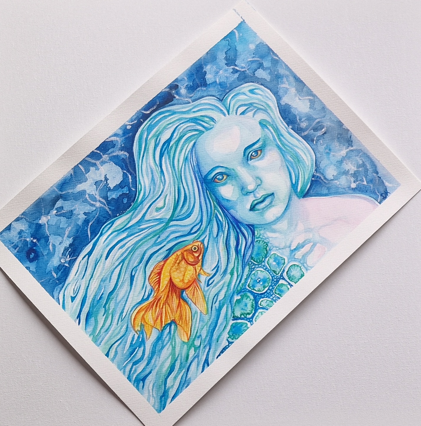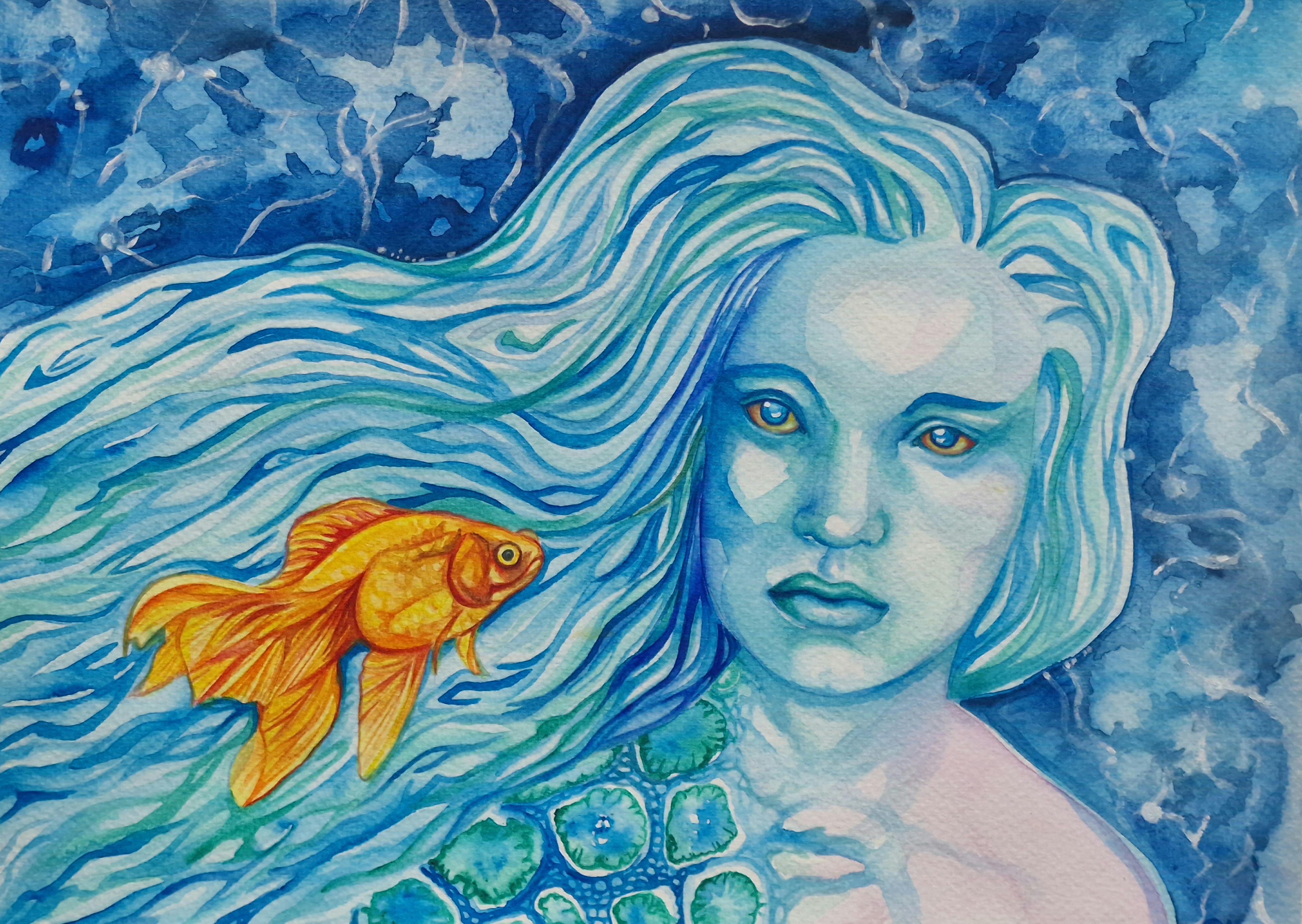 Ten nastrojowy obraz, wykonany techniką akwareli, jest plastyczną interpretacją ballady Adama Mickiewicza "Rybka". Dzieło przedstawia fantastyczną scenę rozgrywającą się pod wodą, w której centrum znajduje się tajemnicza, kobieca postać oraz złota rybka. Kompozycja jest zdominowana przez postać o nienaturalnie bladej, błękitnej skórze i przenikliwym spojrzeniu złotych oczu, skierowanym wprost na widza. Jej twarz wyraża mieszankę smutku, zadumy i być może chłodu, co doskonale oddaje tragiczną historię bohaterki ballady. Najbardziej dynamicznym elementem obrazu są jej długie, falujące włosy, które płynnie przechodzą w otaczającą ją wodę, tworząc z nią jedność. W palecie barw dominują odcienie błękitu, granatu i turkusu, które budują wodny, nieco oniryczny świat. Na ramieniu postaci widoczne są zielonkawe wzory przypominające łuski, co podkreśla jej przemianę w istotę wodną. Mocnym akcentem kolorystycznym, który przyciąga wzrok, jest tytułowa złota rybka. Jej intensywna, pomarańczowo-złota barwa stanowi silny kontrast dla chłodnego tła i bladej postaci. Rybka, namalowana z dużą dbałością o detale, wydaje się być bezpiecznie wtulona w fale włosów wodnej pani. Użycie akwareli pozwoliło artystce na uzyskanie efektu lekkości, przezroczystości i płynnych przejść tonalnych, co idealnie pasuje do przedstawienia wodnego środowiska. Świetliste refleksy na powierzchni wody i we włosach postaci dodają kompozycji głębi i dynamiki. Całość tworzy obraz pełen melancholii i romantycznej tajemnicy, który jest nie tylko ilustracją, ale także głęboką emocjonalną interpretacją tragicznej historii opowiedzianej przez Adama Mickiewicza.