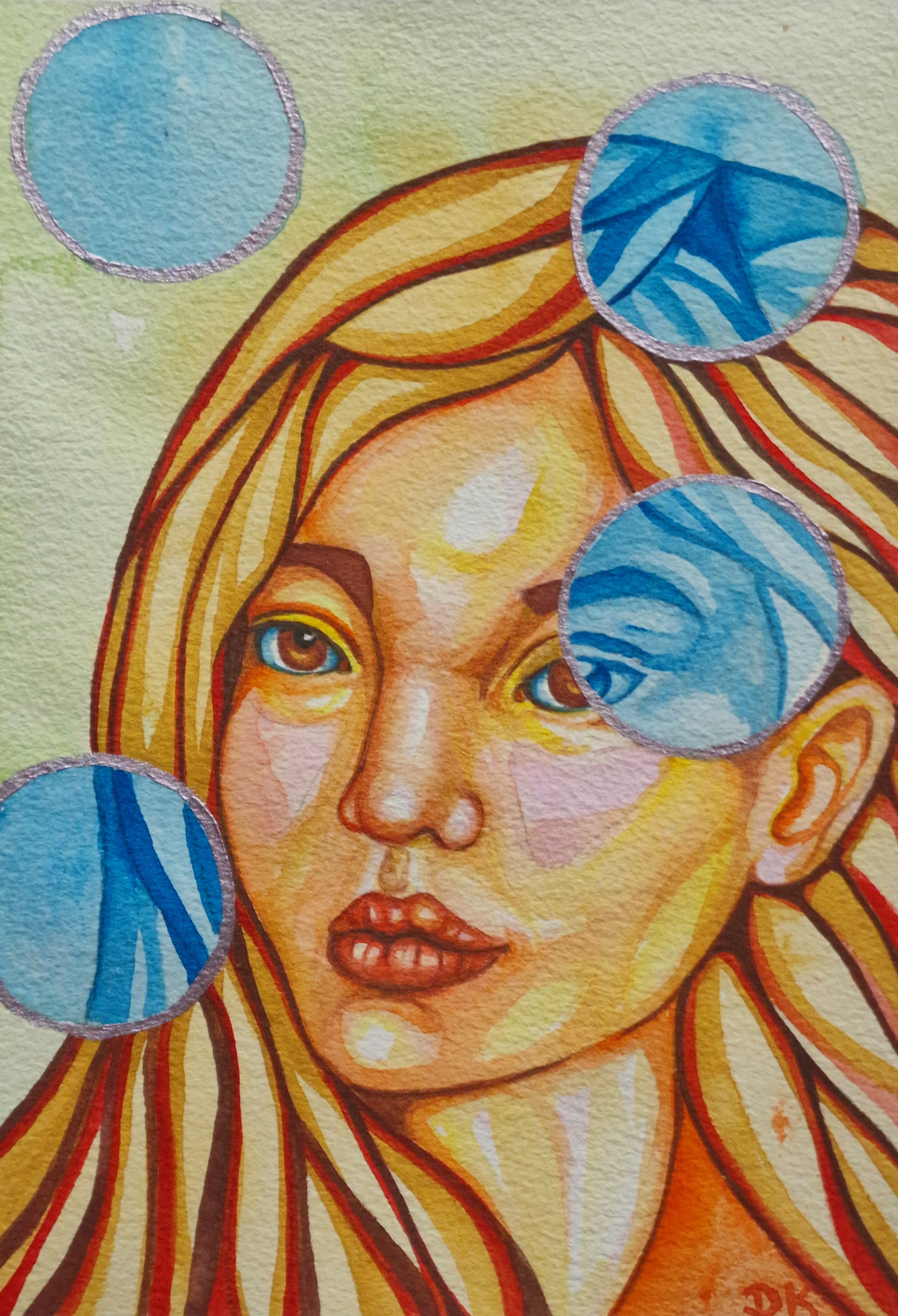 Na tym obrazie, który jest jak wyjęty z magicznego snu, widzimy subtelnie przedstawioną twarz kobiety, której włosy falują w rytmicznych pasmach złota i miedzi. Te barwy łączą się płynnie, tworząc ciepłą mozaikę. Wokół twarzy unoszą się niebieskie kółka przypominające bąbelki. Wyglądają tak, jakby skrywały małe tajemnice, każda z nich odbija odrobinę inny świat. Tło tchnie spokojem, z delikatnymi akcentami zieleni i błękitu, co nadaje całości lekko eteryczny nastrój. Akwarela jest częścią cyklu pt. "Szkiełka". Cztery portrety kobiece tworzące cykl „SZKIEŁKA” to poetycka medytacja nad percepcją, tożsamością i wewnętrznym światem. Każda twarz, zanurzona w miękkiej zieleni tła, zostaje przefiltrowana przez abstrakcyjne formy – okręgi, geometryczne wzory, świetliste refleksy – niczym przez szkiełka mikroskopu lub kalejdoskopu. Te wizualne przesłony nie zasłaniają, lecz odsłaniają: emocje, wspomnienia, fragmenty duszy. Kolorystyka jest intensywna, niemal pulsująca – ciepłe tonacje włosów kontrastują z chłodnymi błękitami i bielą ornamentów. Każda postać zachowuje indywidualny wyraz, a jednocześnie wpisuje się w wspólny rytm cyklu: spojrzenie przez pryzmat, który zniekształca, ale też pogłębia widzenie. Akwarela została namalowana na dobrej jakości papierze o gramaturze 300. Obszar zamalowany tworzy prostokąt o wymiarach 23x16 cm.