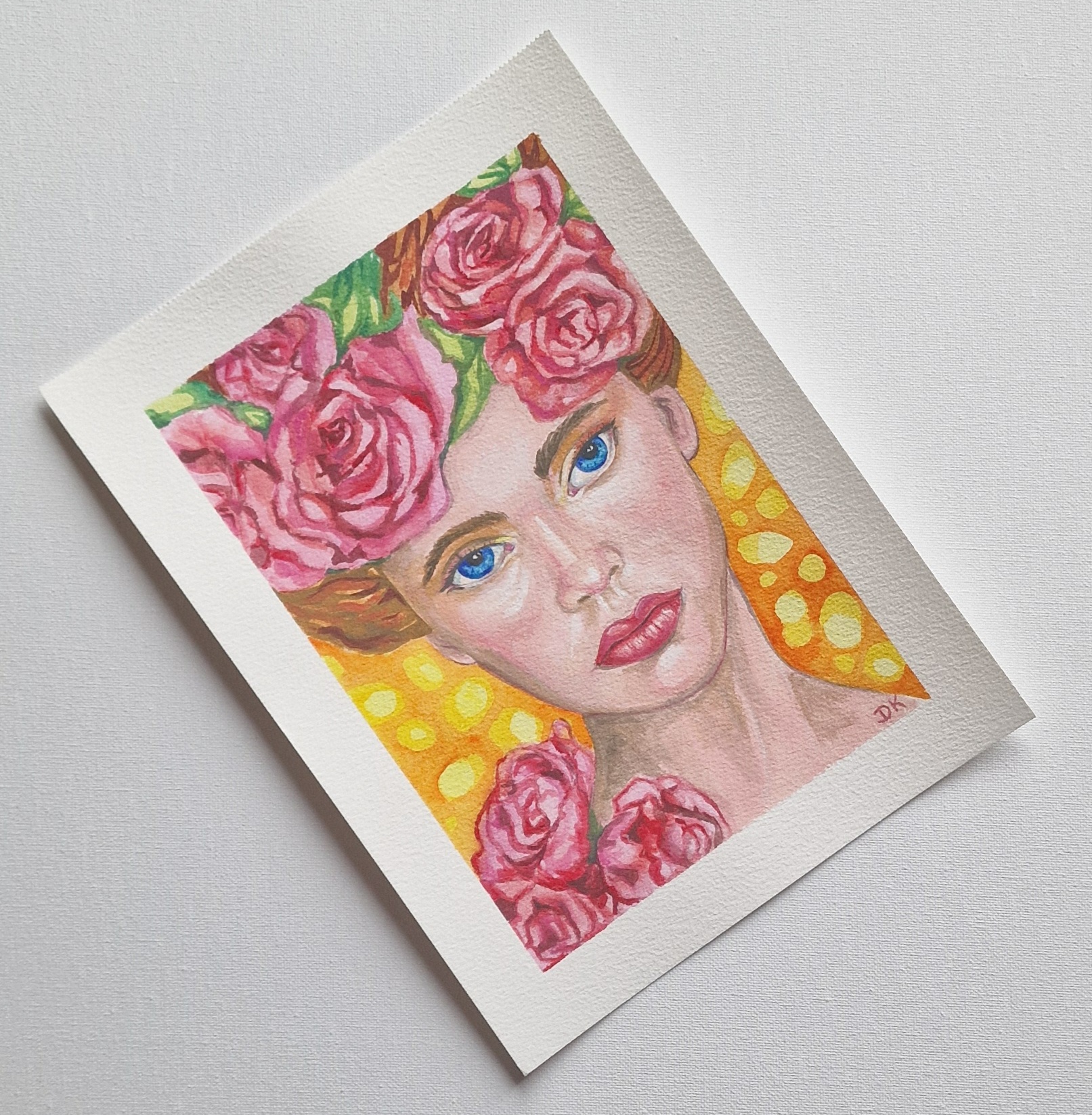 Na obrazie widzimy portret kobiety otoczonej bogactwem barw, które od razu przyciągają wzrok. Głęboki niebieski jej oczu kontrastuje z intensywną czerwienią róż wplecionych we włosy. Tło w odcieniach żółci i pomarańczu dodaje całości żywiołowości, nadając kompozycji dynamiczny charakter. Czuje się tu nieco tajemniczy nastrój, jakbyśmy zaglądali w wir nieokiełznanej przyrody z odrobiną magii. Styl portretu przywodzi na myśl malarstwo impresjonistyczne, gdzie kolory i emocje grają pierwsze skrzypce. Technika akwareli, z charakterystycznym miękkim przechodzeniem kolorów, dodaje obrazu eteryczności. Patrząc na nią, ma się wrażenie, że zaraz wyszepta coś sekretnym głosem. Wow, wygląda jak księżniczka! Jakie emocje można tu poczuć? Dla mnie to jest jak eksplozja radości z nutą nostalgii. Każdy patrzący może poczuć coś zupełnie innego. Może to być chwila zadumy nad delikatnością piękna lub po prostu chwila radości z samego patrzenia. Ten obraz jest zachwycający i na pewno przyciąga uwagę na dłużej.