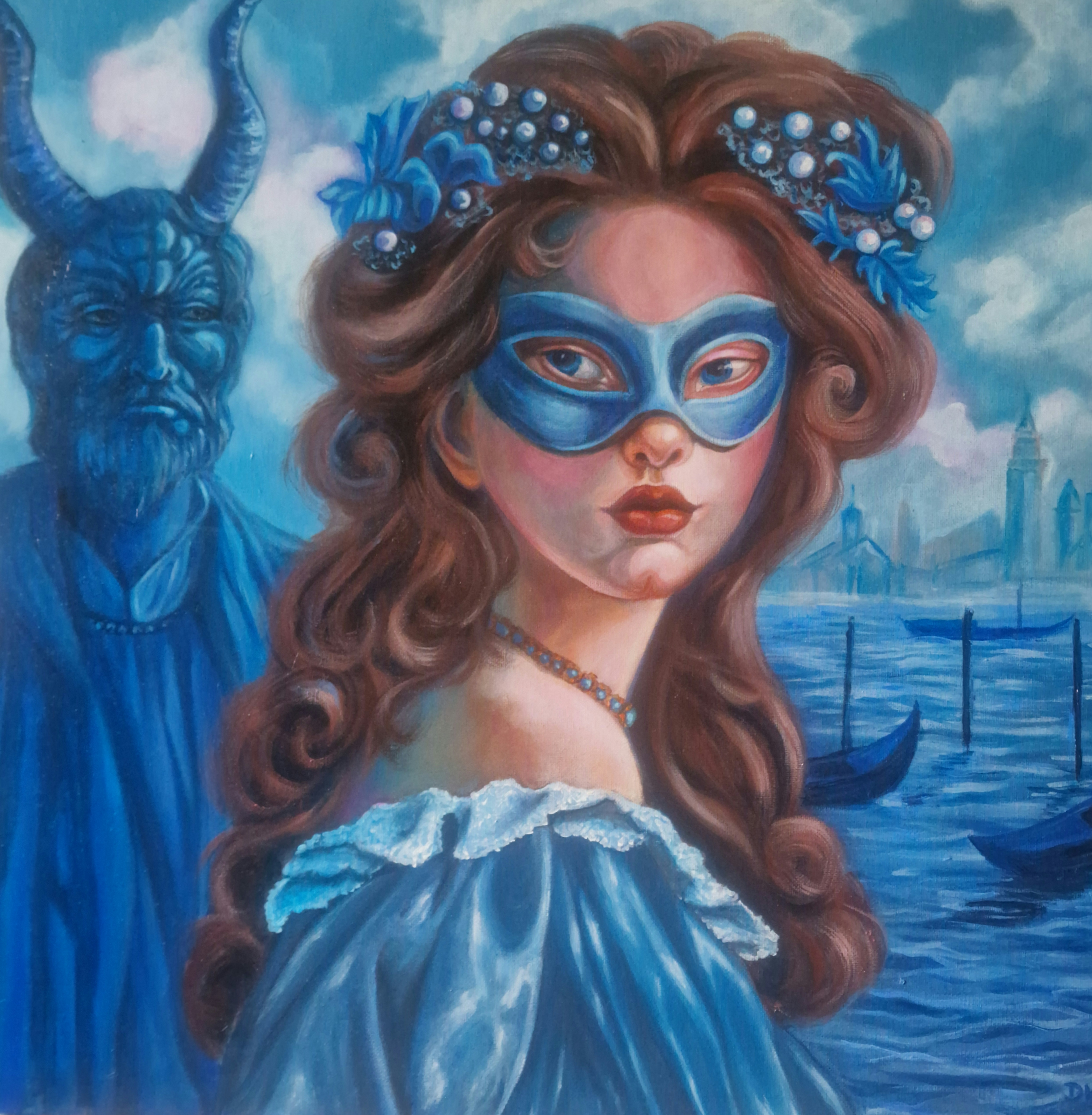 W tej kompozycji artystka splata elegancję z niepokojem, tworząc scenę jak z teatralnego snu. Kobieta w błękitnej masce, otulona perłami i kwiatami, zdaje się być zarówno uczestniczką karnawału, jak i jego ofiarą. Za jej plecami czai się postać o rogach – strażnik, cień, może echo mitologicznego Minotaura? Tło – Wenecja w tonacji błękitu – nie jest tylko miejscem, lecz stanem ducha: miastem, które śni, które pamięta, które ukrywa. Obraz balansuje między pięknem a grozą, między jawą a snem, zapraszając widza do własnej interpretacji.