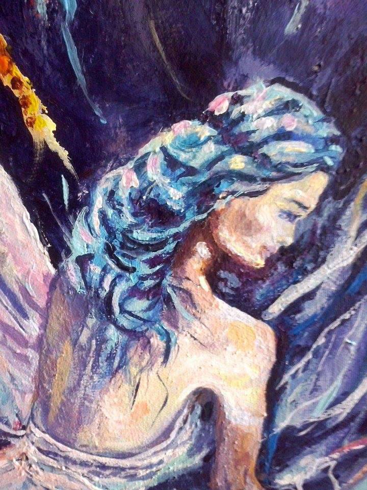 Na obrazie dominują intensywne, głęboko nasycone kolory. Fioletowe i niebieskie kwiaty zdają się tańczyć wśród zielonych, wijących się liści. Na ich tle wykańczają się błyski bieli i czerwieni, które nadają całości tajemniczy klimat. Obraz sprawia wrażenie zanurzonego w bajkowej aurze, pełnej życia i ruchu. Mimo odcieni ciemniejszych, emanuje radością i lekkością. Artysta użył dynamicznych pociągnięć pędzla, co nadaje pracy wrażenie ruchu i ulotności. Kompozycja przyciąga wzrok, kierując go ku środkowi największego kwiatu, wewnątrz którego zasiada postać przypominająca wróżkę, lekka jak piórko. Obraz może wywoływać w odbiorcy uczucia zachwytu i nostalgii, przypominając o dziecięcych marzeniach. To takie fairy-tale pośród realnego świata, pełne magii. Patrząc na tę scenę, można odnieść wrażenie, jakby artysta ukrył w nim jakąś tajemnicę do odkrycia. W człowieku budzi się pragnienie, by samemu wejść do tego zaczarowanego ogrodu. Uwielbiam takie obrazy, bo mogę w nich uciec. Mamo patrz, tam jest księżniczka w kwiatku!