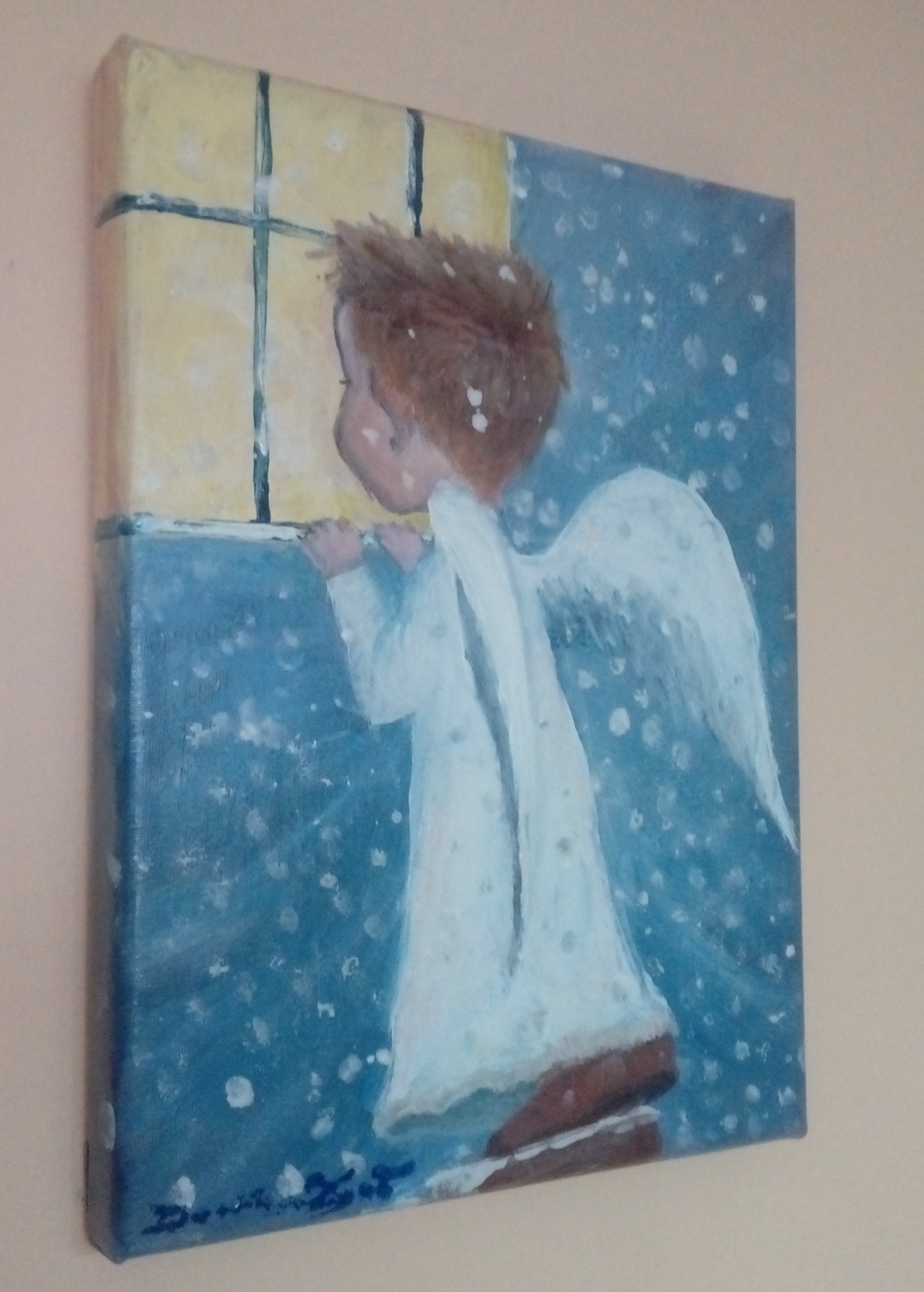 Na obrazie widzimy uroczego aniołka, patrzącego przez okno. Tło pełne jest delikatnych, niebieskich odcieni przeplatanych białymi płatkami śniegu, które nadają scenie zimowy klimat. Żółte światło za oknem kontrastuje z chłodnymi barwami, tworząc ciepłą poświatę, która przyciąga wzrok widza. Aniołek, ubrany w biel, ma miękkie, brązowe włosy i subtelnie zarysowane skrzydła. Atmosfera obrazu emanuje spokojem i czułością, przypominając o magii świątecznych dni. Jednocześnie można poczuć delikatny powiew melancholii tej zimowej nocy, jakby aniołek tęsknił za czymś nieosiągalnym. Artysta zastosował technikę malarstwa akrylowego, co nadaje dziełu miękkość i lekko rozmyte kontury, wrażenie nieuchwytności momentu. Obraz może wywoływać u odbiorcy emocje ciepła i nostalgii, a także skłaniać do refleksji nad własnym wewnętrznym światłem. Może też przywołać wspomnienia z dzieciństwa o niecierpliwym czekaniu na pierwszą gwiazdkę. Hmm, ciekawy jest ten magic winter feeling. Może aniołek chce być tam w środku, gdzie jest cieplutko, pomyślało dziecko. Choć to tylko obraz, łatwo jest do niego wracać myślami, przypominając sobie te drobne chwile spokoju i magii w śnieżną noc. Taki mały, a robi duże wrażenie.