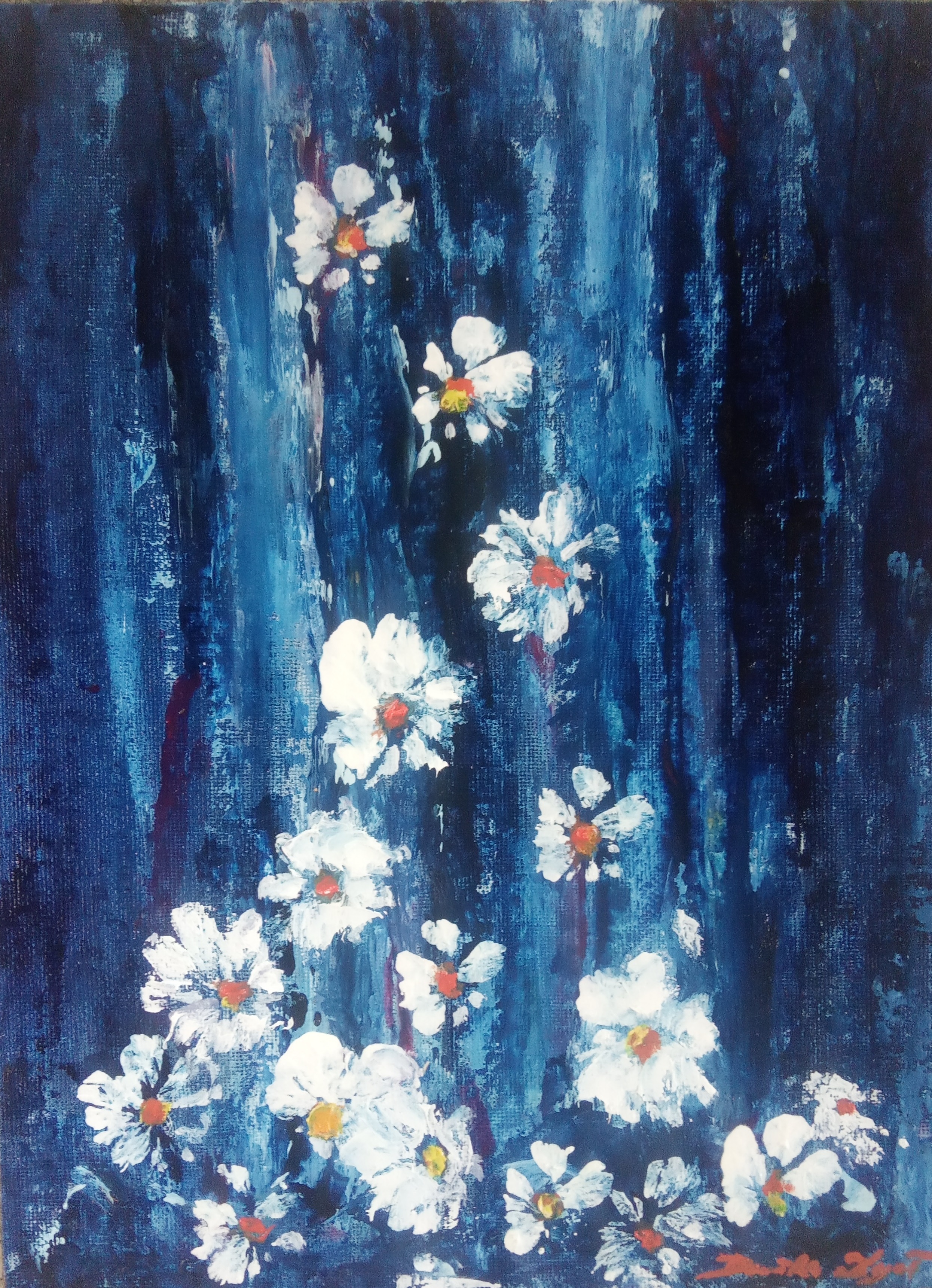 Obraz pokazuje urokliwą kompozycję białych kwiatów na tle intensywnej, ciemnoniebieskiej przestrzeni, która przypomina aksamitne nocne niebo. Kwiaty, rozrzucone jakby przypadkiem, emanują delikatnością, a ich płatki malowane są impastem, co nadaje im faktury i życia. Ta gra kolorów, od ciemnych, głębokich odcieni niebieskiego, przez subtelne przejścia w jaśniejsze tony, tworzy magiczną i tajemniczą aurę. Czujesz, jakbyś patrzył na ogród w blasku księżyca. Styl jest trochę impressionistyczny, a jednak z nutką ekspresjonizmu, gdzie każdy pociągnięcie pędzla wydaje się być emocjonalnym wyrazem artysty. Można się w środku tego dzieła zgubić i odnaleźć na nowo. Dla dziecka: te kwiatki wyglądają jakby tańczyły. Całość maluje obraz spokoju i refleksji, skłaniając do zanurzenia się w marzeniach i wspomnieniach. Może wtedy pojawią się pytania o ulotność życia, ale i jego piękno. Warto na chwilę się zatrzymać i just feel the moment.