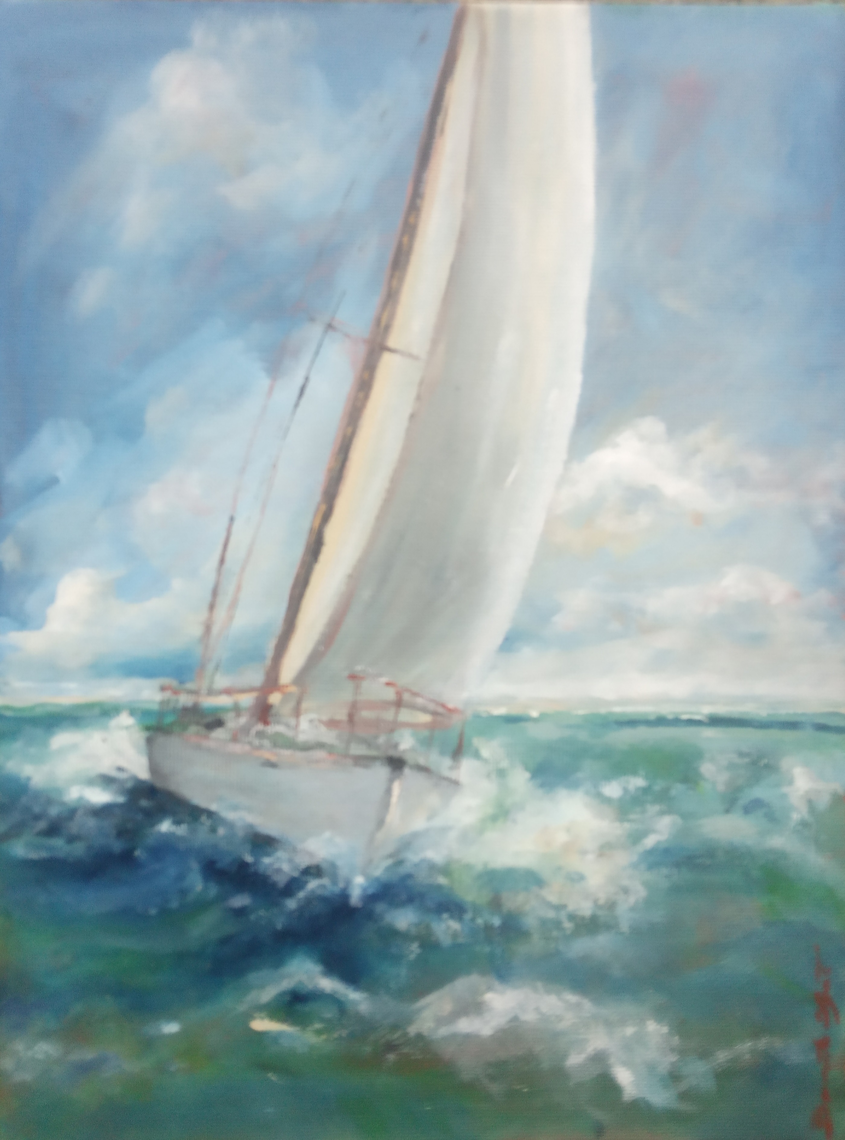 Obraz przedstawia majestatyczny jacht, który stawia czoła wzburzonemu morzu. W centrum uwagi znajduje się potężny maszt i napięty żagiel, który zdaje się chwytac każdy podmuch wiatru. Kolory są intensywne; błękit nieba kontrastuje z głębokim granatem wody, tworząc dynamiczną kompozycję pełną życia. Płótno emanuje atmosferą przygody i nieskrępowanej wolności. Czuć wiatr we włosach i słoną bryzę na twarzy! Artysta użył szerokich, energetycznych pociągnięć pędzla, które dodają obrazowi ruchu i ekspresji. Styl dzieła jest zdecydowanie impresjonistyczny, a faktura farby wprowadza ciekawą grę światła i cienia. Obraz może budzić nostalgię za letnimi dniami i beztroską. Jest w tym jakaś magiczna siła, feel the freedom. Patrząc na obraz, można niemal usłyszeć plusk fal. Mam ochotę wsiąść na ten jacht i ruszyć w nieznane. Obraz uchwycił chwilę, której nie da się zapomnieć, pełną emocji i ruchu. To jak spełnienie marzeń o dalekich podróżach.