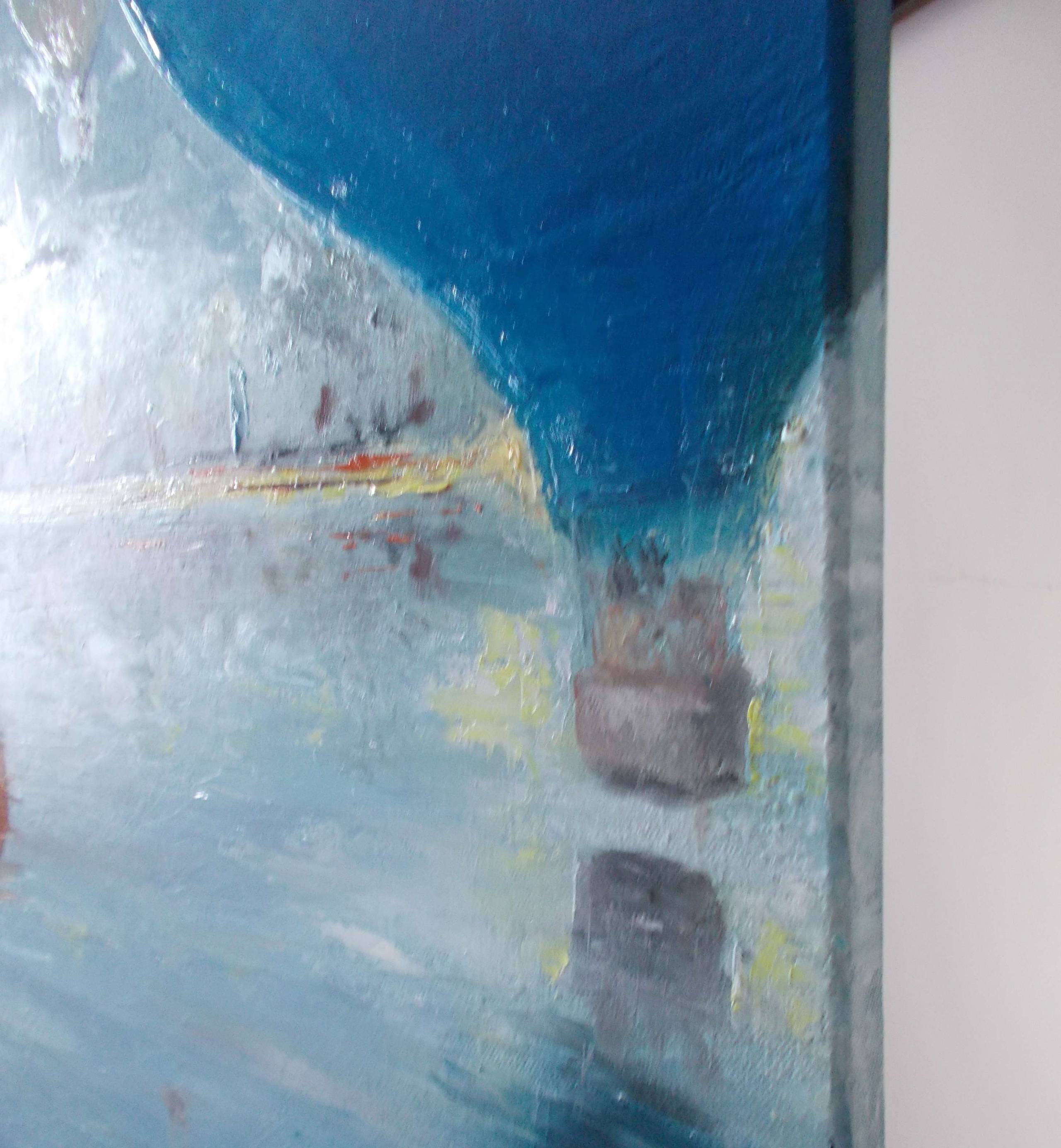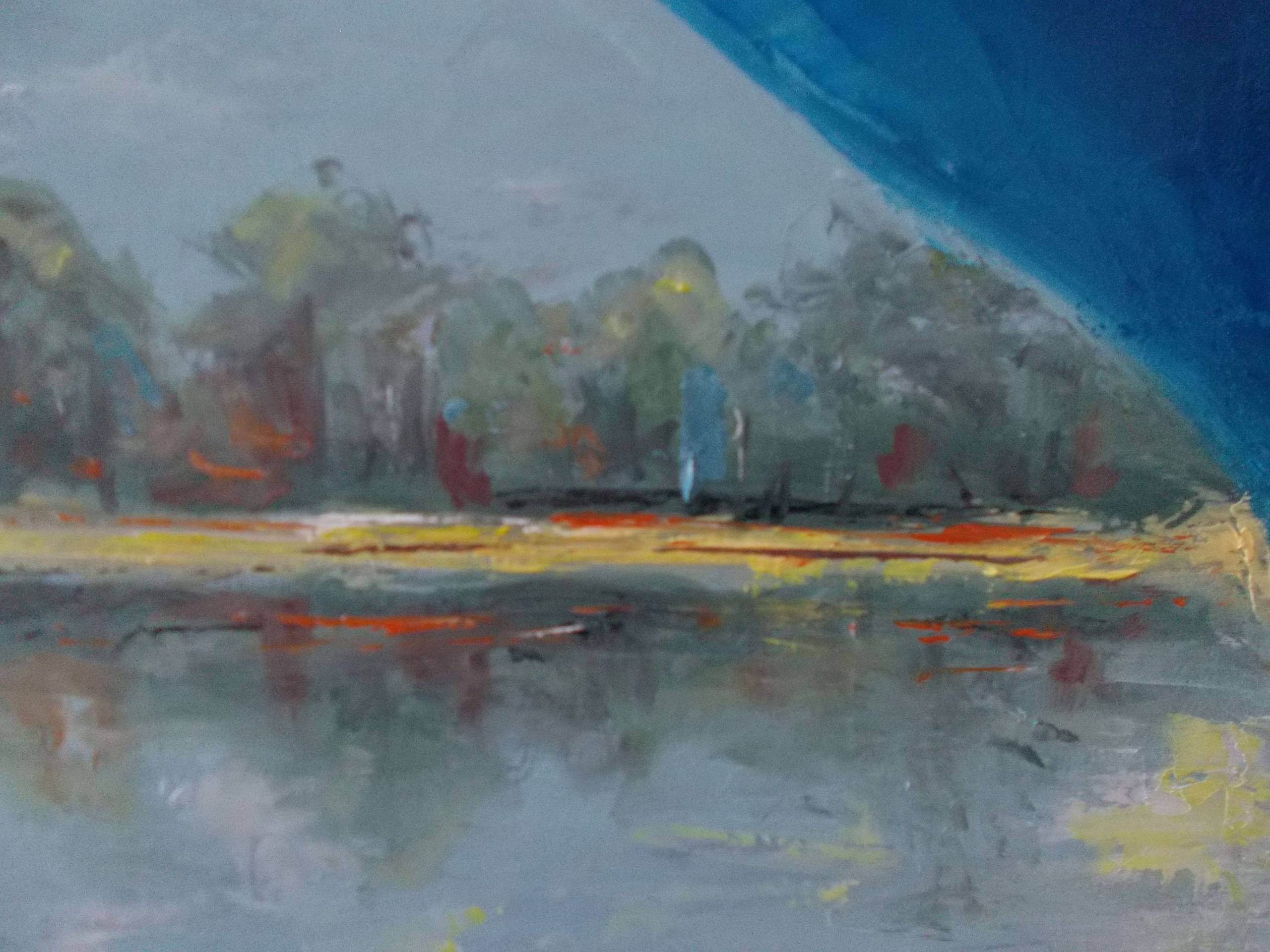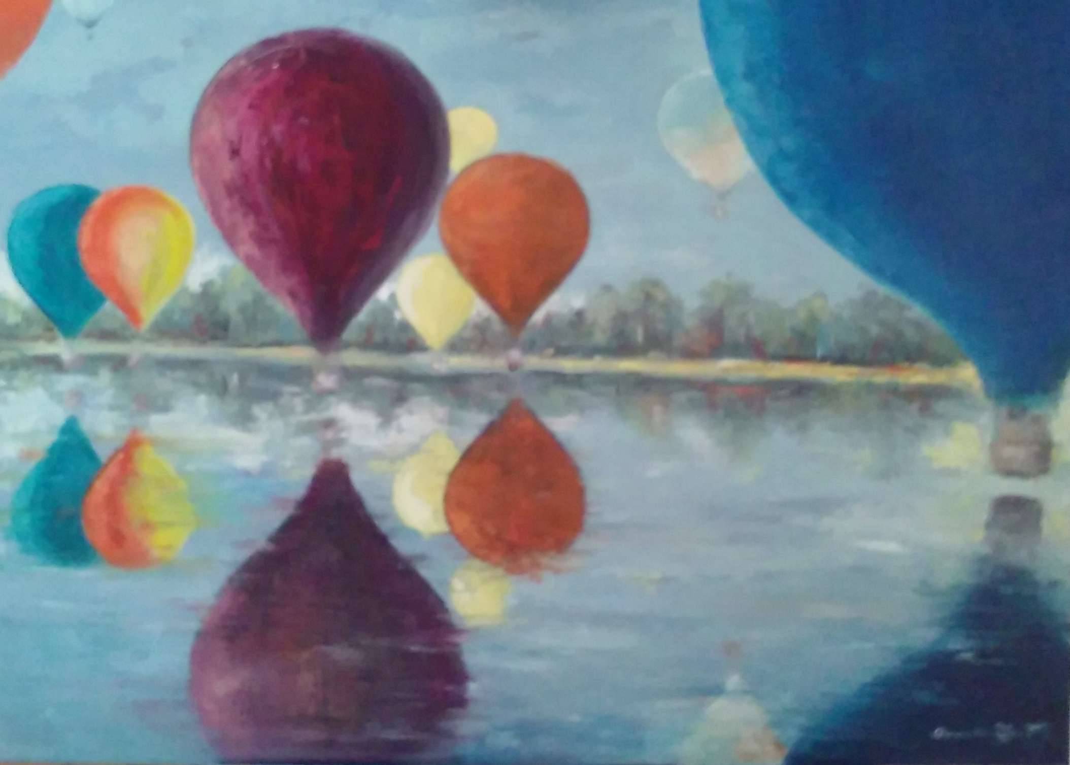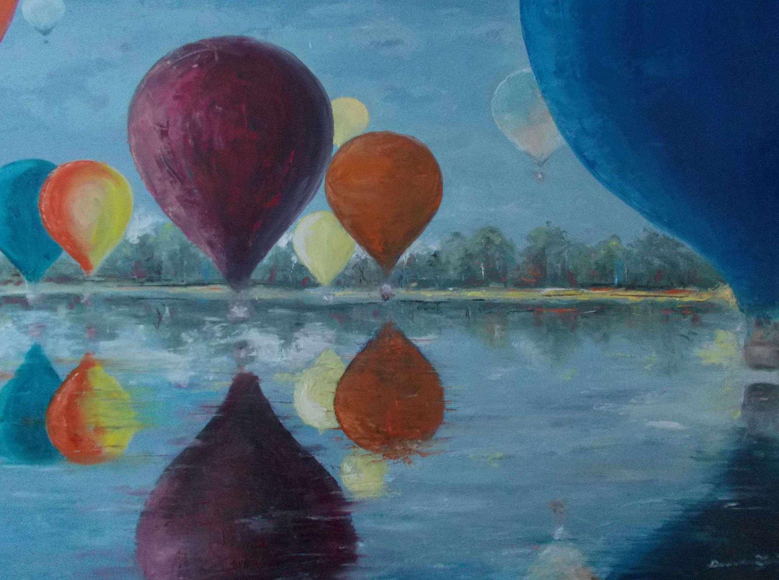 Obraz przedstawia kolorowe balony unoszące się nad spokojnym jeziorem. Paleta barw wybucha żywymi odcieniami czerwieni, niebieskiego, pomarańczowego i żółtego. Kształty balonów są kuliste, co nadaje im lekkości w kompozycji. W tle majaczą delikatne szarości, które podkreślają błękit nieba. Obraz emanuje spokojem i sielankowym nastrojem, jakby czas stanął w miejscu. Artyska, stosując technikę impasto, wprowadził grubą warstwę farby, tworząc fakturę dodająca głębi. Czucie wolności bije z każdej plamy koloru. Ktoś może się poczuć "on top of the world" patrząc na te balony. Wyobrażam sobie, że beztroski wiatr szepteri ze wszystko jest możliwe. Aż chce się zanurzyć w to nieskończone niebo, poczuć to powietrze. „Chciałbym tam pójść i zobaczyć te balony na żywo!”, powiedziałby mały odkrywca w kapeluszu. Obraz przynosi wspomnienia beztroskich dni i sprawia, że serce bije szybciej z tęsknotą za przygodą. To takie chwile, które sprawiają, że czujemy się naprawdę wolni. Po prostu piękne.
