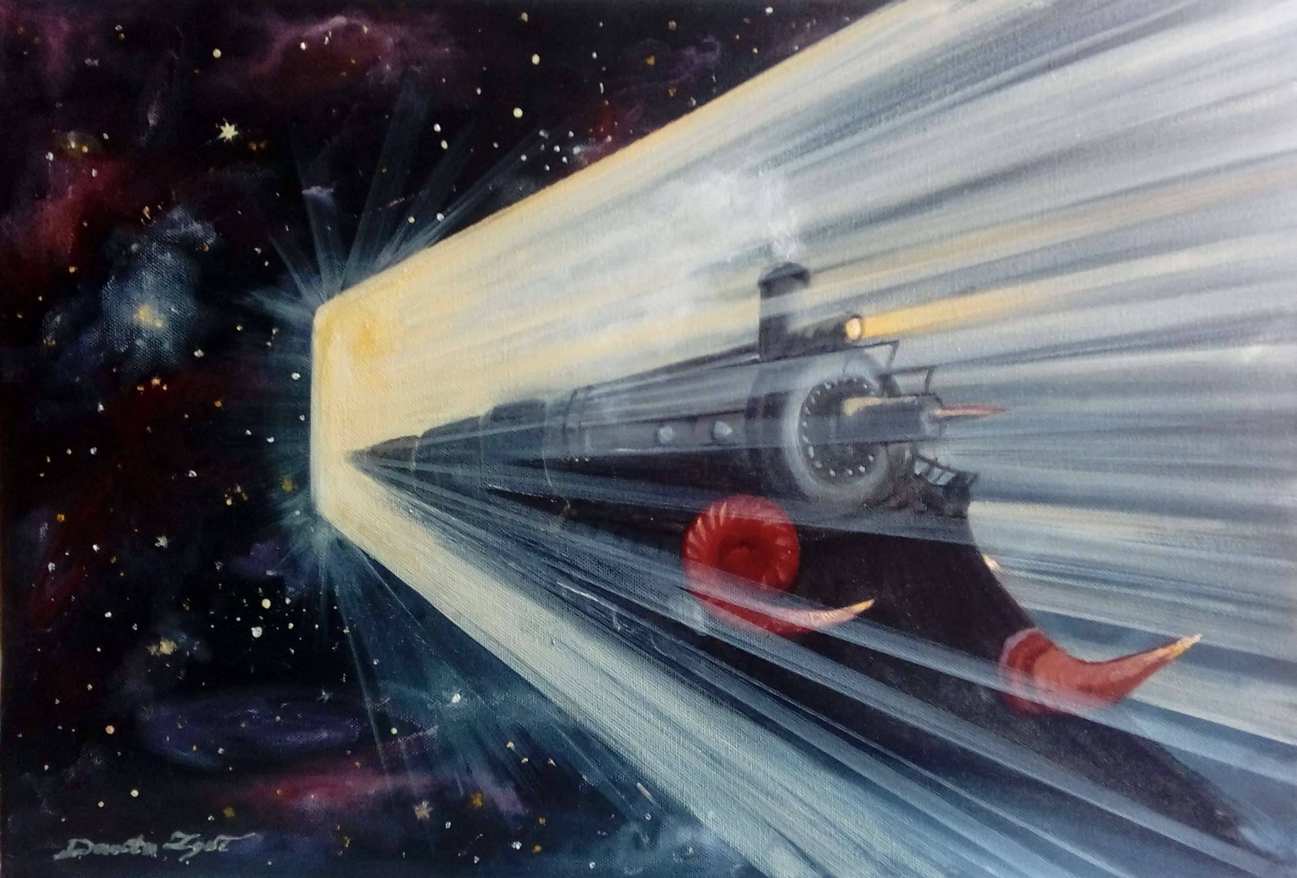 Obraz przedstawia niesamowity pociąg sunący przez kosmos, a jego ogromna lokomotywa przemyka przez roziskrzoną przestrzeń niczym magiczny statek. Kolory użyte przez artystę - głęboki granat, czerń i jaskrawa biel - tworzą surrealistyczną kompozycję, która przyciąga wzrok. Kształty są dynamiczne, pełne energii, a linie świetlne wyglądają jakby przecinały wszechświat. Nastrój tego dzieła emanuje niesamowitością i tajemnicą, przyprawiając niejednego widza o dreszcze ekscytacji. Artysta zastosował technikę mieszanych pociągnięć pędzla, co nadaje obrazowi niepowtarzalną teksturę. Light streaming through the painting sprawia wrażenie, że pociąg przekracza granice czasu i przestrzeni. Obraz ten pomaga odbiorcom wejść w świat marzeń i nieograniczonej wyobraźni. Możnaby się nawet poczuć jak dziecko, które eksploruje galaktykę. "Wow, pociąg lata w kosmosie!" powiedziałby mały chłopiec. Ta wizja z pewnością może zainspirować do refleksji nad tym, co jest możliwe, jeśli tylko uwolnimy nasze umysły. A może to metafora podróży poprzez życie, gdzie każda stacja to nowa przygoda? Trudno powiedzieć, ale na pewno patrzenie na ten obraz wywołuje falę emocji - od zdumienia po głęboki spokój ducha.