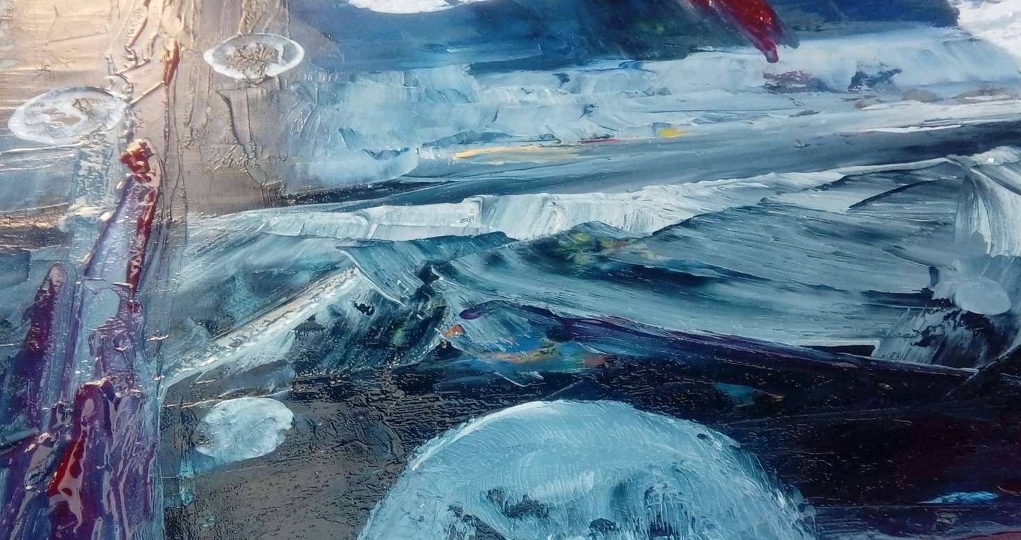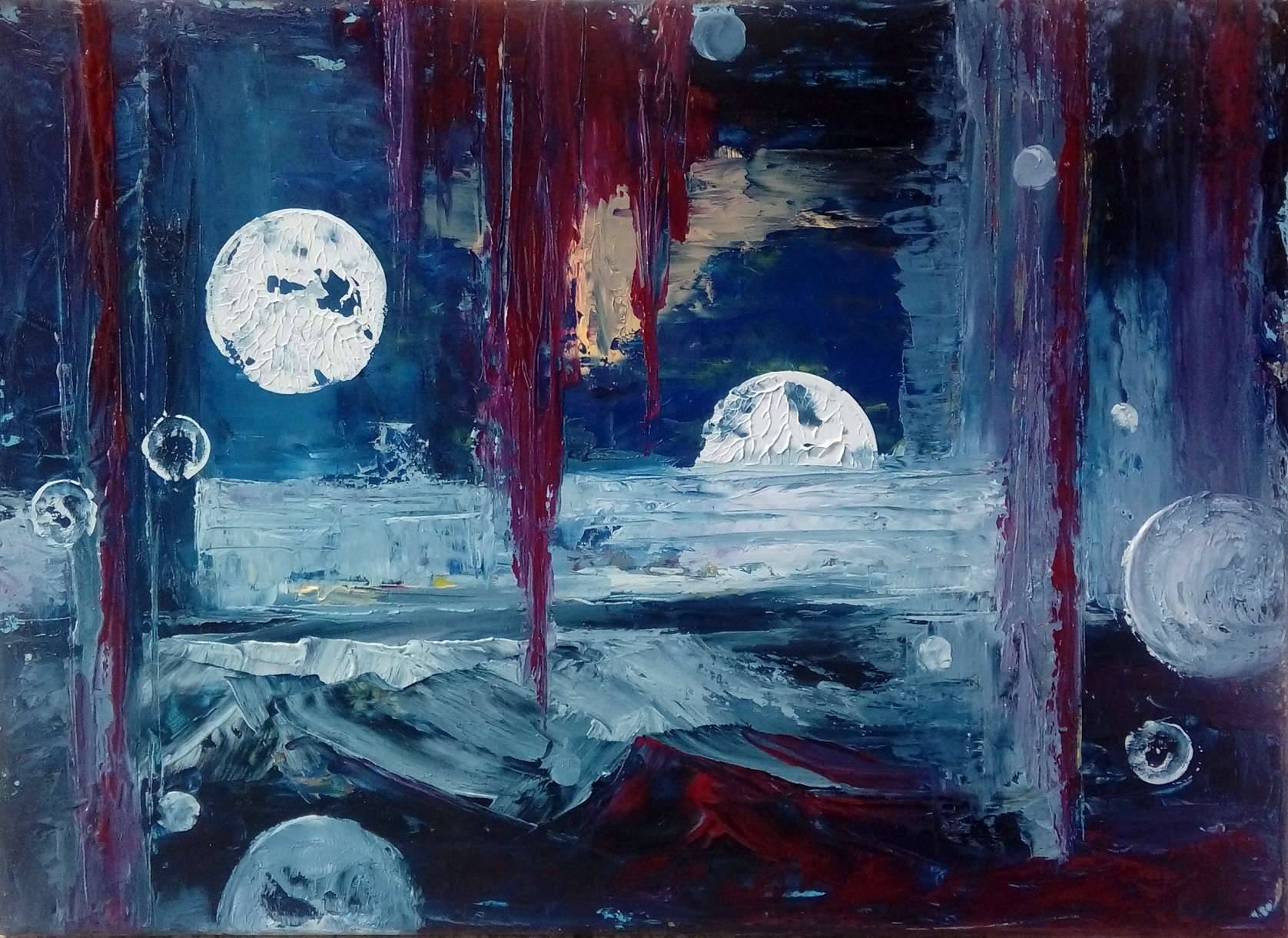 Na obrazie dominuje ciemna paleta barw – głównie głęboki granat, czerwień i biel. Kolory te splatają się w abstrakcyjnej kompozycji, tworząc iluzję kosmicznej przestrzeni. Duża biała kula, przypominająca księżyc, przyciąga wzrok. Obraz ma w sobie coś magicznego i tajemniczego. Wiszące czerwone smugi czy pociągnięcia pędzla zdają się być jakby krwią w zawieszeniu. Emanuje z niego pewna melancholia, ale też coś w rodzaju fascinating spokoju. Artystyczne techniki są tu śmiałe – wyraziste pociągnięcia pędzla, teksturowe powierzchnie. Dla mnie, ten obraz jest jak marzenie widziane przez pryzmat przestrzeni międzygwiezdnej. Może wywoływać refleksję nad nieskończonością i kruchością naszego istnienia. Dziecko powiedziałoby pewnie, że to kosmos, bo są śliczne kuleczki. I właśnie takie emocje – od zachwytu po zadumę – mogą pojawić się u patrzącego. Ten obraz nie tylko pokazuje, ale i wciąga w swoje historie. Swoimi kolorami i formą, pozwala na chwilę zatrzymać się i zatracić w swym pięknie.
