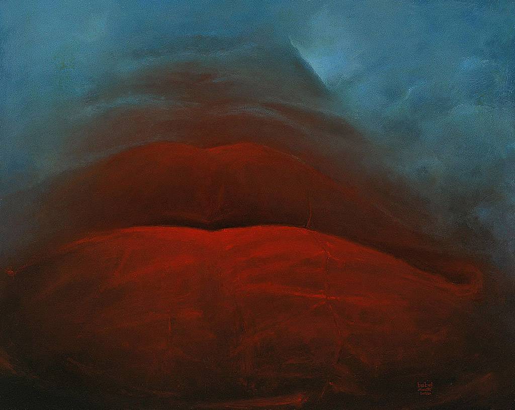 Na obrazie dominują intensywne, głębokie czerwienie przechodzące w ciemniejsze odcienie, kontrastujące z chłodnym błękitem w tle. Te kolory łączą się w sposób tajemniczy, tworząc niemalże surrealistyczną kompozycję. W centrum widzimy duże, abstrakcyjne kształty przypominające usta, co dodaje kompozycji elementu zmysłowości i niecodzienności. Atmosfera tego obrazu jest wręcz elektryzująca, pełna napięcia i niepewności. Artysta zastosował tutaj technikę malowania olejnego, dzięki czemu kolorystyka jest głęboka i nasycona. Emocje, jakie budzi, są mieszane – jednocześnie fascynuje i niepokoi. "Wow", może pomyśleć ktoś, patrząc na ten obraz w galerii. Interpretacje są różne – może przywodzić na myśl zarówno uczucie intensywnej namiętności, jak i otchłań nieznanego. Patrząc na te kolory, człowiek czuje, jakby artysta chciał nas zabrać w podróż po zakamarkach naszej własnej wyobraźni. Może to być równie dobrze portret marzenia lub samej tajemnicy. Dziecko powiedziałoby "To są bardzo duże usta". I trudno się z tym nie zgodzić.