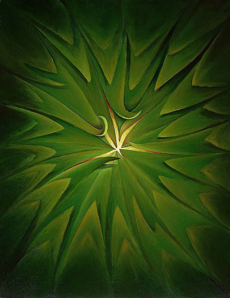 Na obrazie dominuje intensywna zieleń, od ciemnych do jasnych tonów, tworząc harmonijną grę świateł i cieni. Wszystko zdaje się wirować wokół centralnego punktu, pełnego żywej energii. Kształty przypominają liście lub płomienie, rozchodzące się promieniście od środka. Atmosfera jest tajemnicza i pełna dynamiki. Styl przypomina nieco surrealizm, choć technika olejna nadaje dziełu organiczności. Obraz emanuje czymś, co można by nazwać quiet intensity. Może budzić uczucie spokoju, ale też tchnąć pewną niepokojącą energią. Jak patrzę na ten obraz, czuję, że mógłby opowiadać o po prostu o naturze, o jej sile i pięknie. Czuję się trochę jak w środku zielonego lasu, gdzie wszystko żyje własnym rytmem. No wiesz, taki dziwny moment, kiedy twój umysł zaczyna podróże po zakamarkach lasu. Dzieło jest przemyślane i jednocześnie surowe w wyrazie. Dodaje otuchy i przypomina o harmonii, jaka w nas mieszka. Fascynuje mnie, jak coś tak prostego potrafi zadziałać na wyobraźnię. Gdybym był dzieckiem, powiedziałbym: "Mamoo, to wygląda jak magiczny liść, co tańczy na wietrze!". Wiesz co, czasem warto spojrzeć przez pryzmat dziecięcych oczu.