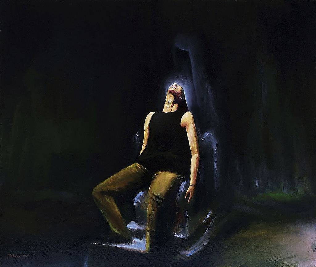 Obraz jest pełen ciemności i tajemnicy. Czarne tło dominuje, przyciągając wzrok do wyraźnie oświetlonej postaci w centrum. Jasne smugi światła tworzą wokół niej aurę niemal mistyczną. Postać, rozluźniona, z głową zadartą i ciałem w nieco zniekształconej pozycji, wygląda jakby była w transie albo odczuwała jakieś intensywne emocje. Kontrast pomiędzy ciemnym, prawie nieprzeniknionym tłem a jasnością bijącą od figury przywołuje uczucie napięcia. Wrażenie jest jakby surrealistyczne, jakby coś magicznego miało się wydarzyć. I ten nastrój... jest jak spokojne, ale zarazem niepokojące oczekiwanie. Artysta użył techniki chiaroscuro, by podkreślić dramatyzm sceny i skupić uwagę na centralnym motywie. A jak to jest dziwnie znajome, jakbyśmy wszyscy w swoim życiu byli taką postacią, zawieszoną pomiędzy światłem a ciemnością. Obraz skłania do refleksji nad stanem ducha, izolacją, może nawet cierpieniem. Mamo, ta postać wygląda jak duch w kimonie! Ekscytujący, a jednocześnie trochę straszny. Czujesz, jak serce nieco przyspiesza. Intrygująca gra światła i cienia adds depth to the narrative. Czy to, co widzimy, jest rzeczywistością czy snem? To pytanie pozostaje bez odpowiedzi. Każdy sam musi odkryć swoje znaczenie. Ten obraz pamiętajmy dłużej niż jeden dzień.