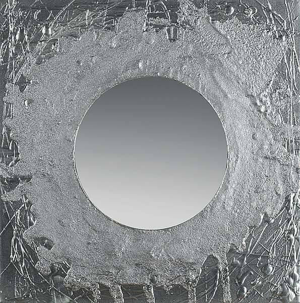 Obraz przedstawia hipnotyzującą kompozycję, w której dominuje centralny okrąg, przypominający powierzchnię księżyca. Szarości i srebra przeplatają się jakby ktoś rozrzucił pył księżycowy wokół doskonale wycentrowanego koła. Otaczająca struktura to plątanina grubych linii, przypominających skomplikowaną sieć pęknięć. Sprawia to wrażenie surowości i nieuporządkowania, jak splątane myśli w głowie. Nastrój dzieła jest spokojny, ale jednocześnie tajemniczy. To trochę jak oglądanie nieba w noc bezchmurną z domieszką niepokoju. Artysta zastosował technikę reliefu, dodając tekstury i głębi do swojego dzieła. Widać, że czerpał z estetyki brutalizmu; kanciaste, nieociosane formy sugerują pewien rodzaj pierwotnej energii. To takie wild, jakby wypowiedzieć w języku angielskim. Wygląda jak powierzchnia planety. Wzbudza poczucie zachwytu nad nieskończonością wszechświata i zarazem lekki lęk przed jego nieodgadnionością. Dzieło może budzić refleksję nad złożonością życia. Dla dziecka mogłoby to być po prostu: "To wielkie koło jest dziwne, ale fajne!" Patrząc na to dzieło, można niemal poczuć chłód kamienia i pustki kosmosu. Fascynujące, jak takie proste formy mogą krzyczeć swoją obecnością i zachęcać do kontemplacji. To naprawdę coś.