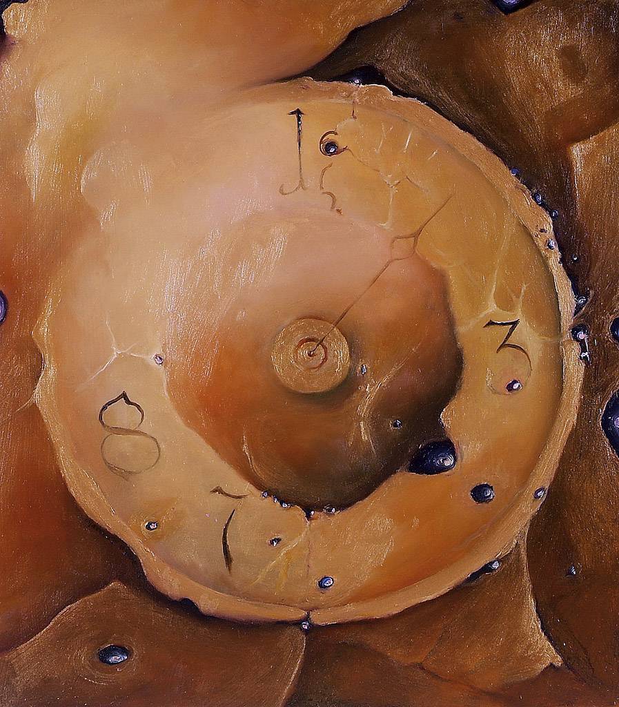 Obraz zachwyca ciepłymi odcieniami brązów i złota, tworzącymi organiczną spiralę przypominającą skalę czasu. Kolory są miękkie, subtelnie różnicują się między sobą, tworząc wrażenie harmonijnego chaosu. Artysta zastosował kompozycję inspirowaną naturą, z widocznymi pęknięciami i nieregularnymi kształtami, co nadaje całości głębi i tajemniczości. Spoglądając na obraz, można poczuć się delikatnie zagubionym, jakby czas wokół zaczął płynąć inaczej. Myślę sobie, że może tu chodzi o przemijanie, ale kto wie? Pędzlem artysta malował z emocją, co widać w każdej szczelinie powierzchni. Technika impasto dodaje faktury, przez co obraz staje się nie tylko widziany, ale także niemal odczuwalny dotykiem. Wow, jakbyś dotykał historii! Czuję spokój i refleksję, jakby zapraszał nas do głębszej medytacji nad upływem czasu. Niby zegar, a jednak taki inny, to jest naprawdę awesome! Obraz może budzić różne emocje – od zaskoczenia po zadumę, a każdy widz może odczytać w nim coś innego, co czyni go wyjątkowym dziełem sztuki w swej unikalnej formie.