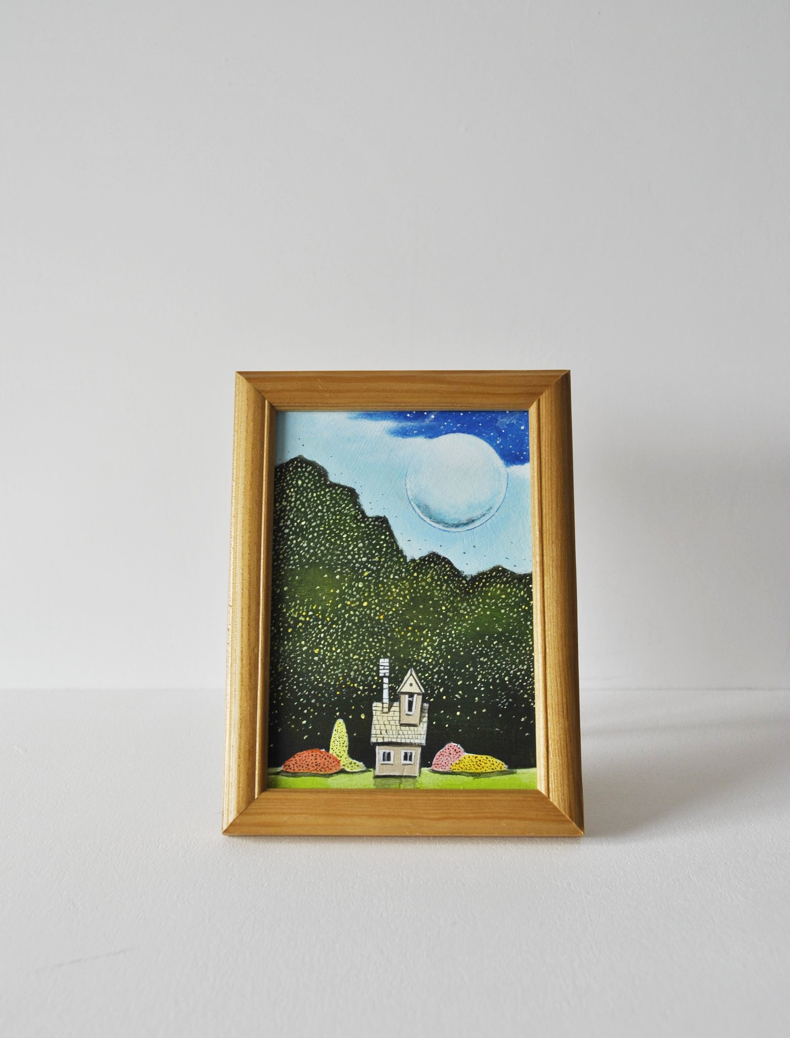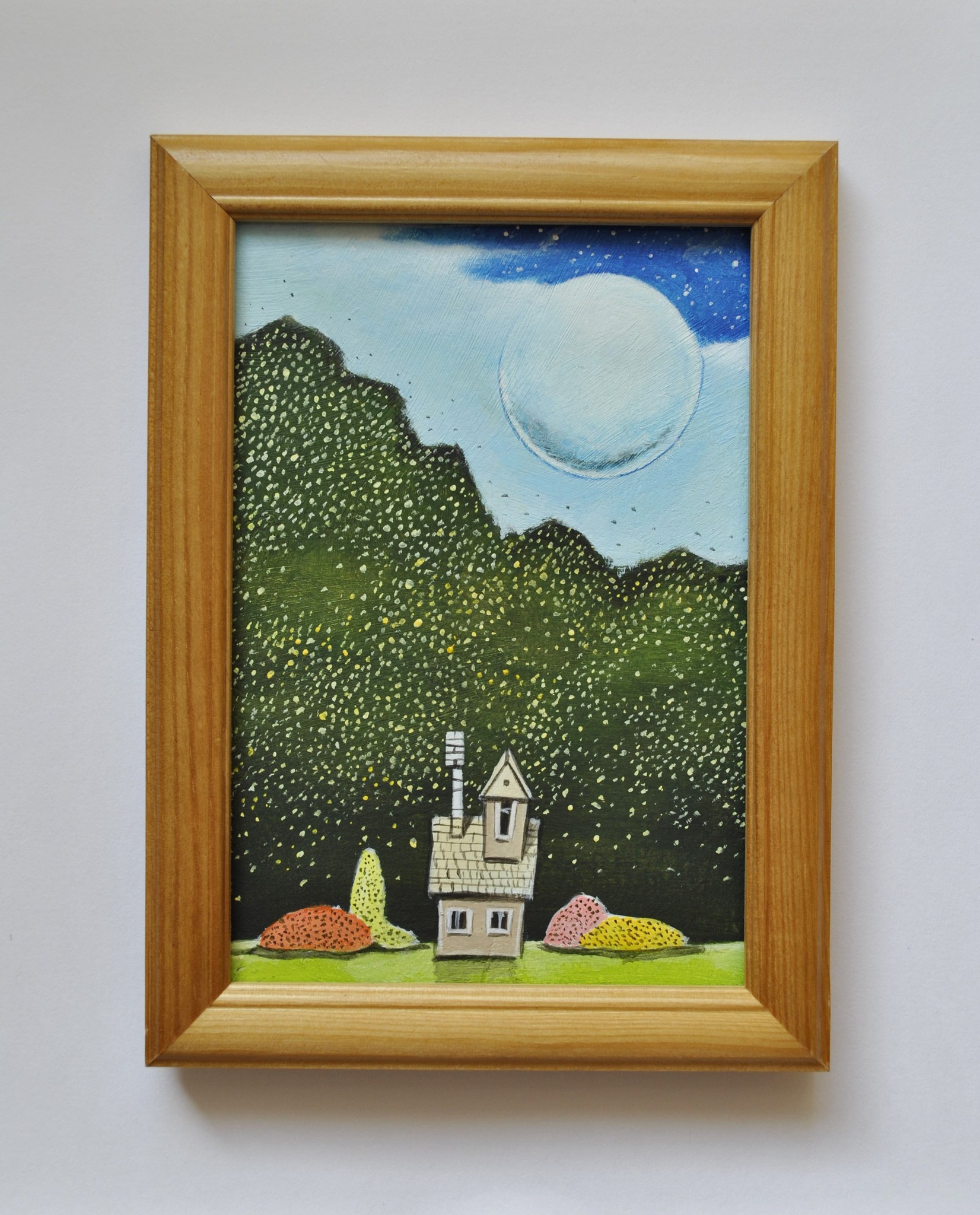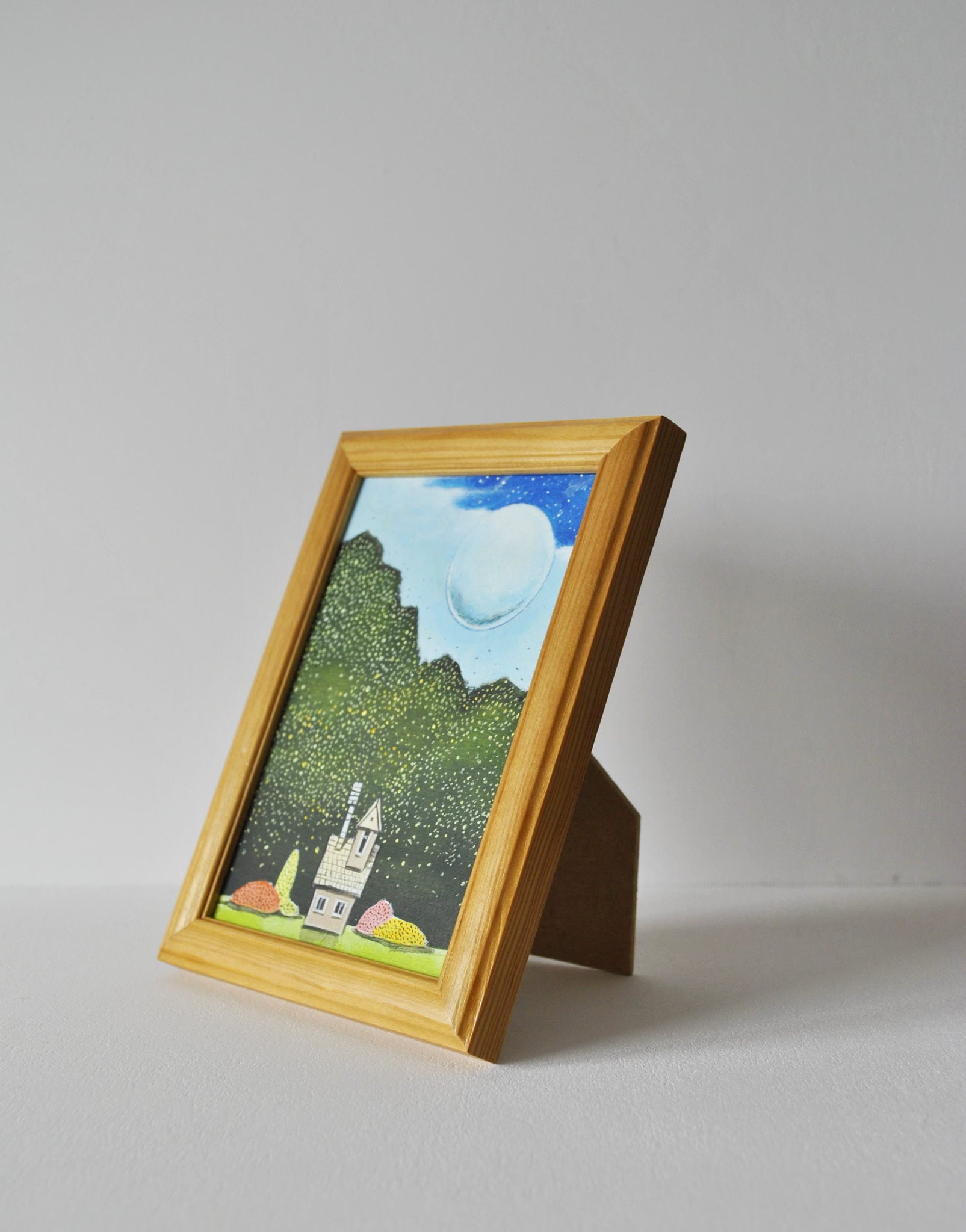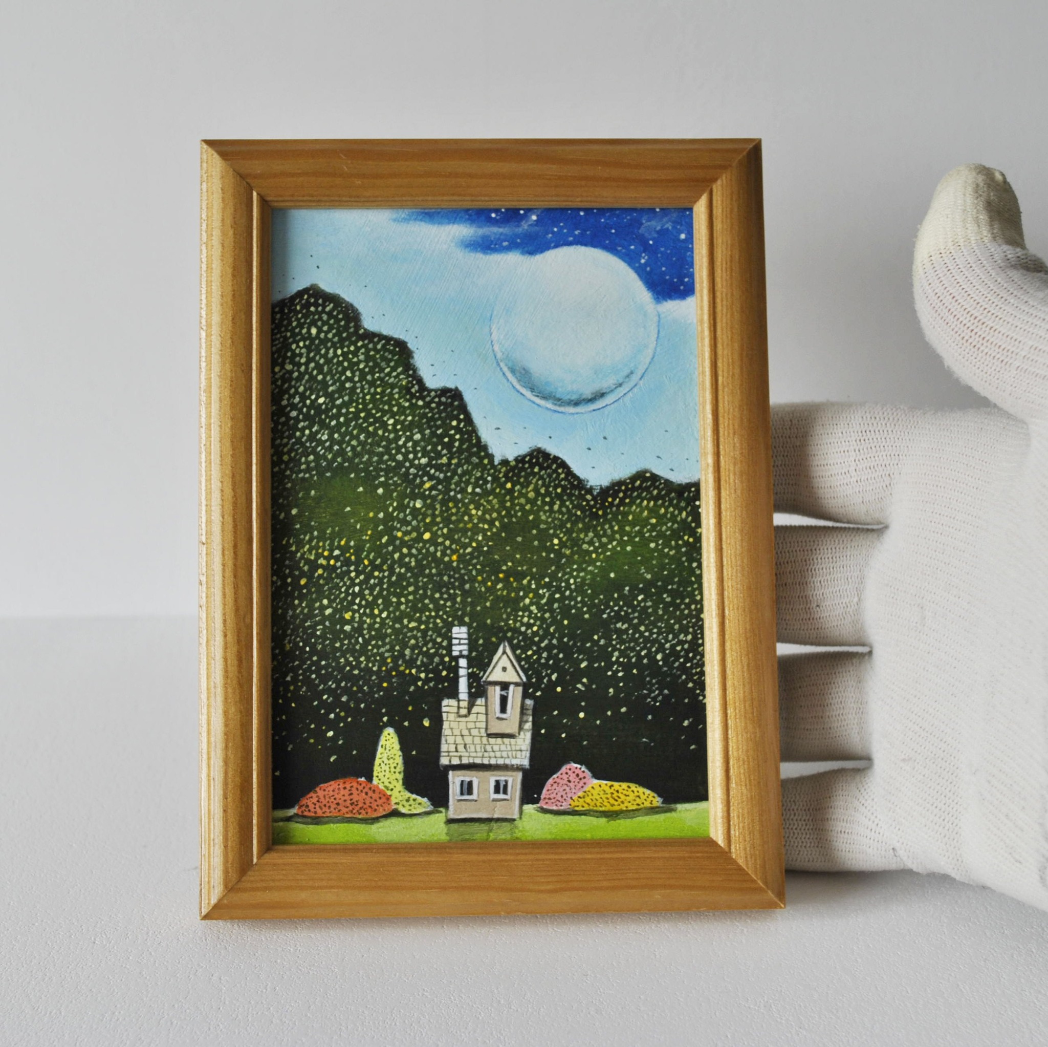Miniaturka namalowana została na płytce drewnianej w technice akrylowej, oprawiona jest w jasną drewnianą ramkę, posiada stojak/można ją postawić, sygnatura na odwrocie, zabezpieczona werniksem Winsor/Newton