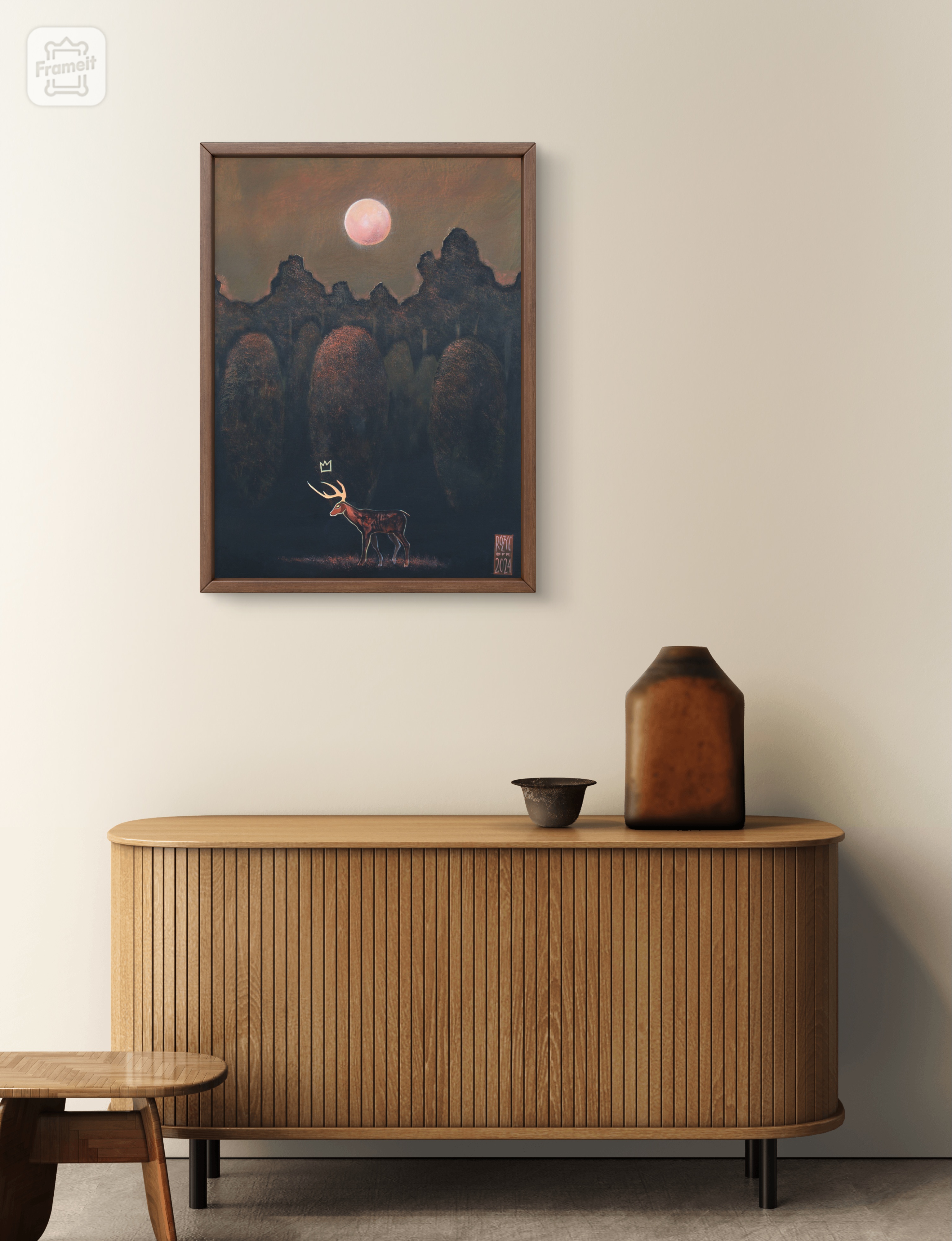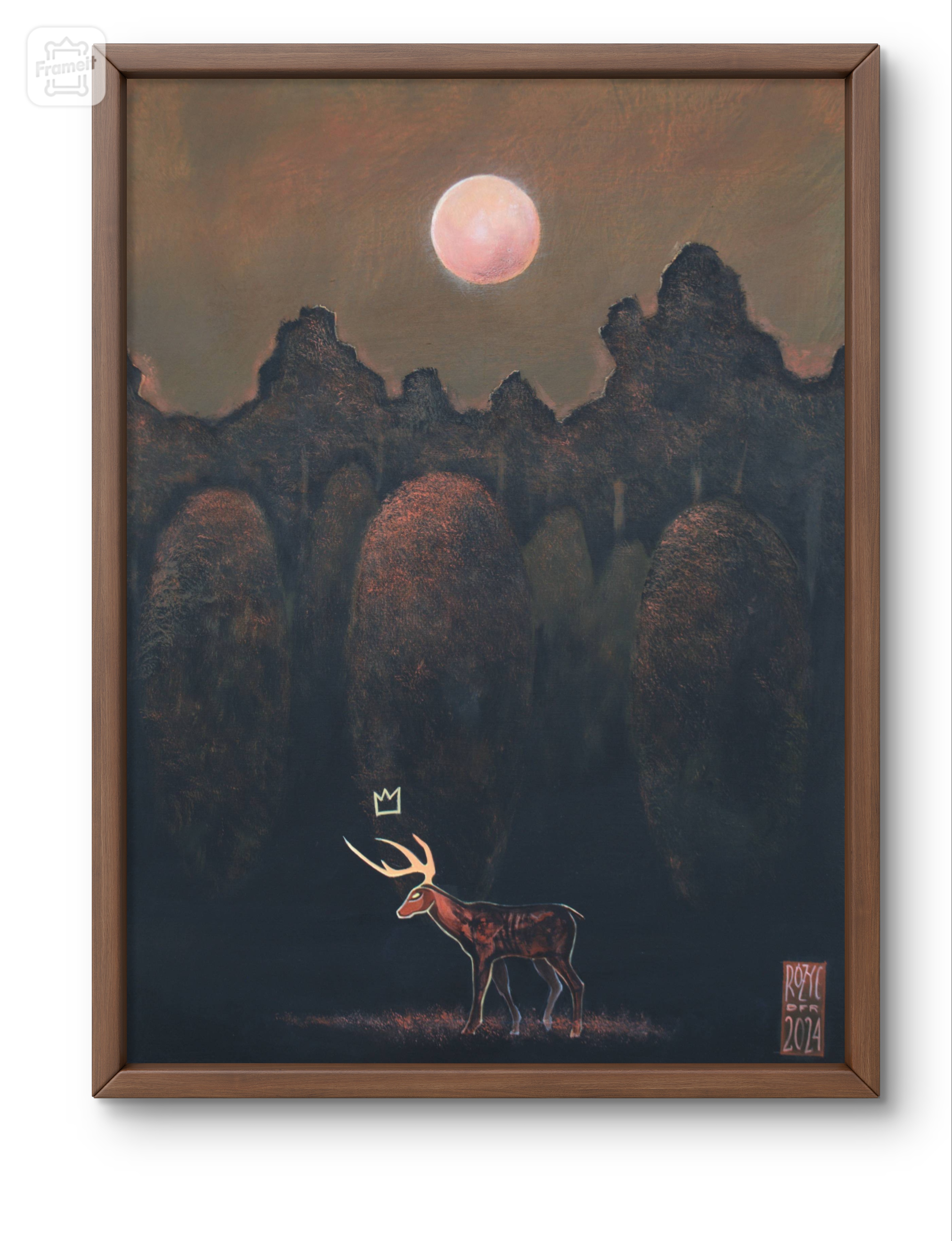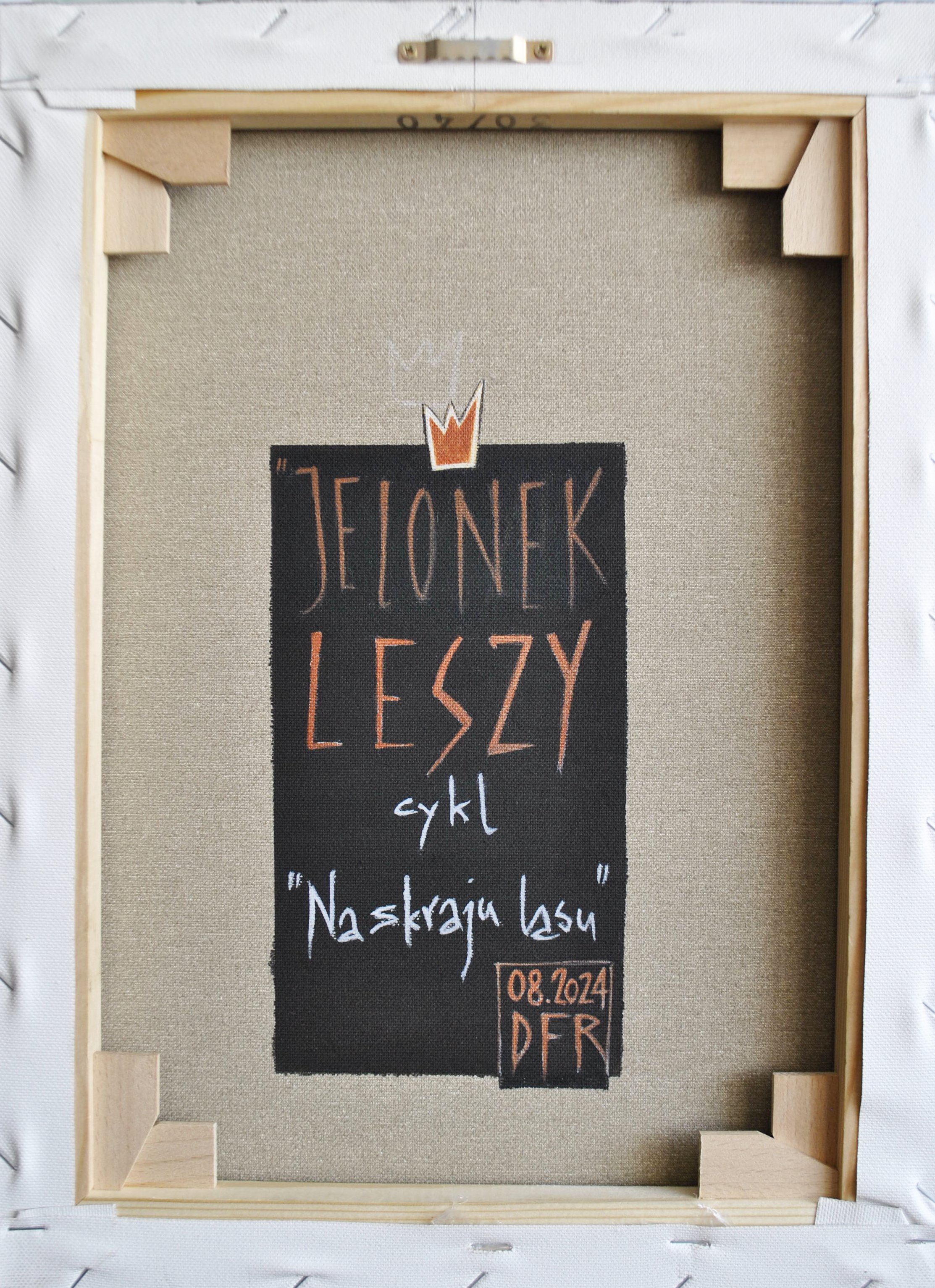 Obraz namalowany został w technice akrylowej na podobraziu bawełnianym, gruntowanym. Nieoprawiony/boki zamalowane na czarno/ramka w kolorze brązowym na życzenie-dodatkowy koszt 50pln. Obraz stanowi fragment cyklu ''Na skraju lasu''. Tematyką obrazu jest mitologiczna postać Leszego-pół Boga, pół demona, króla i opiekuna lasu oraz zwierząt leśnych.