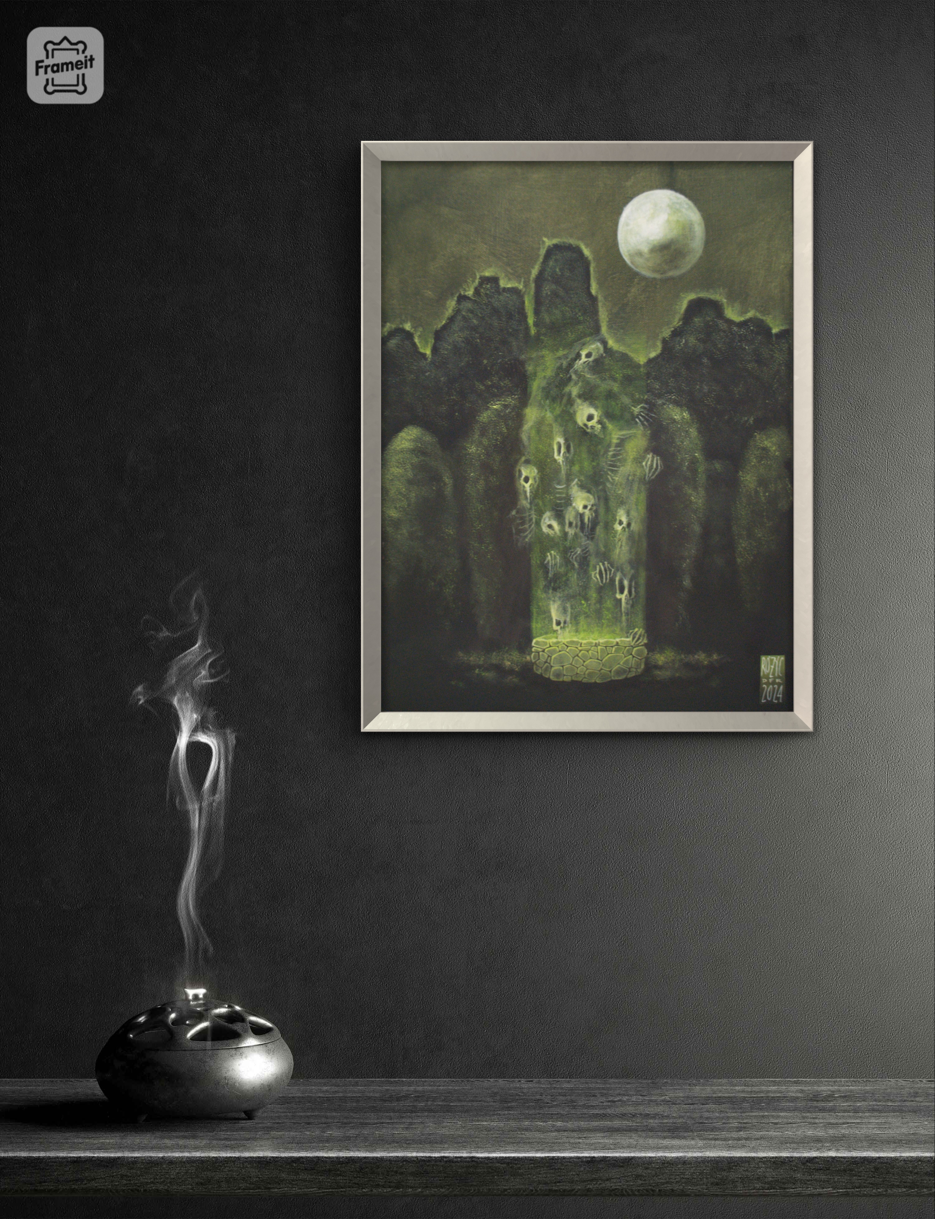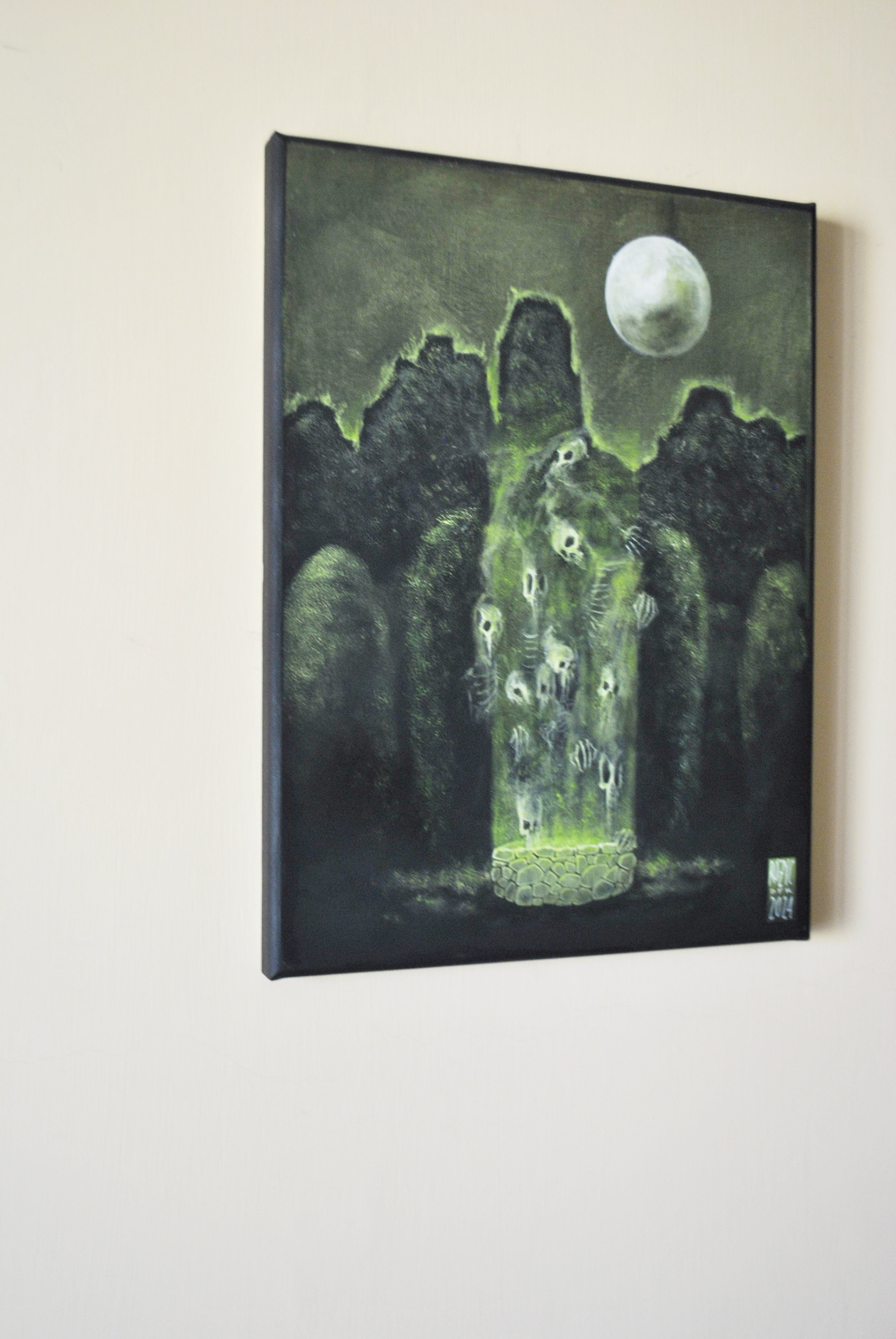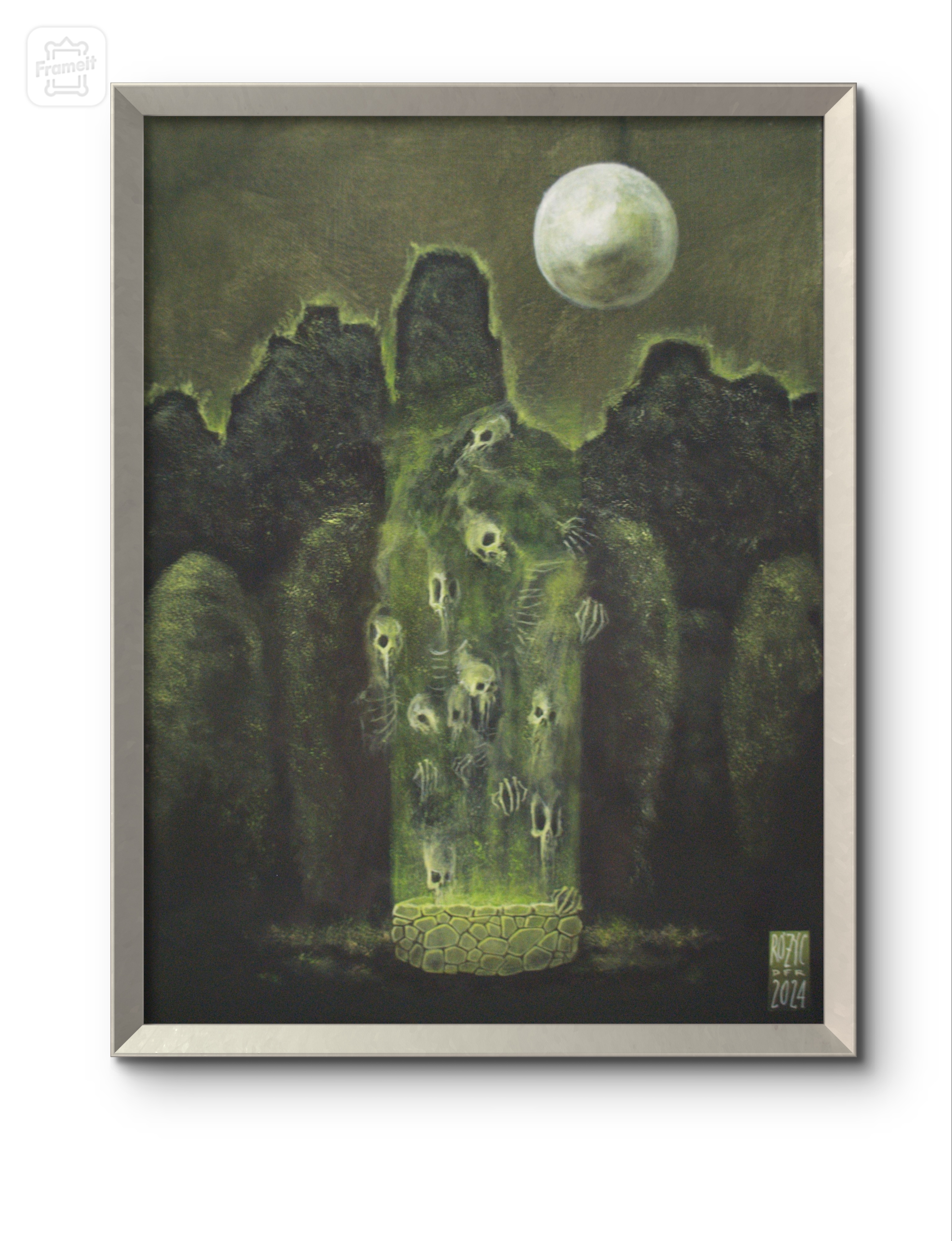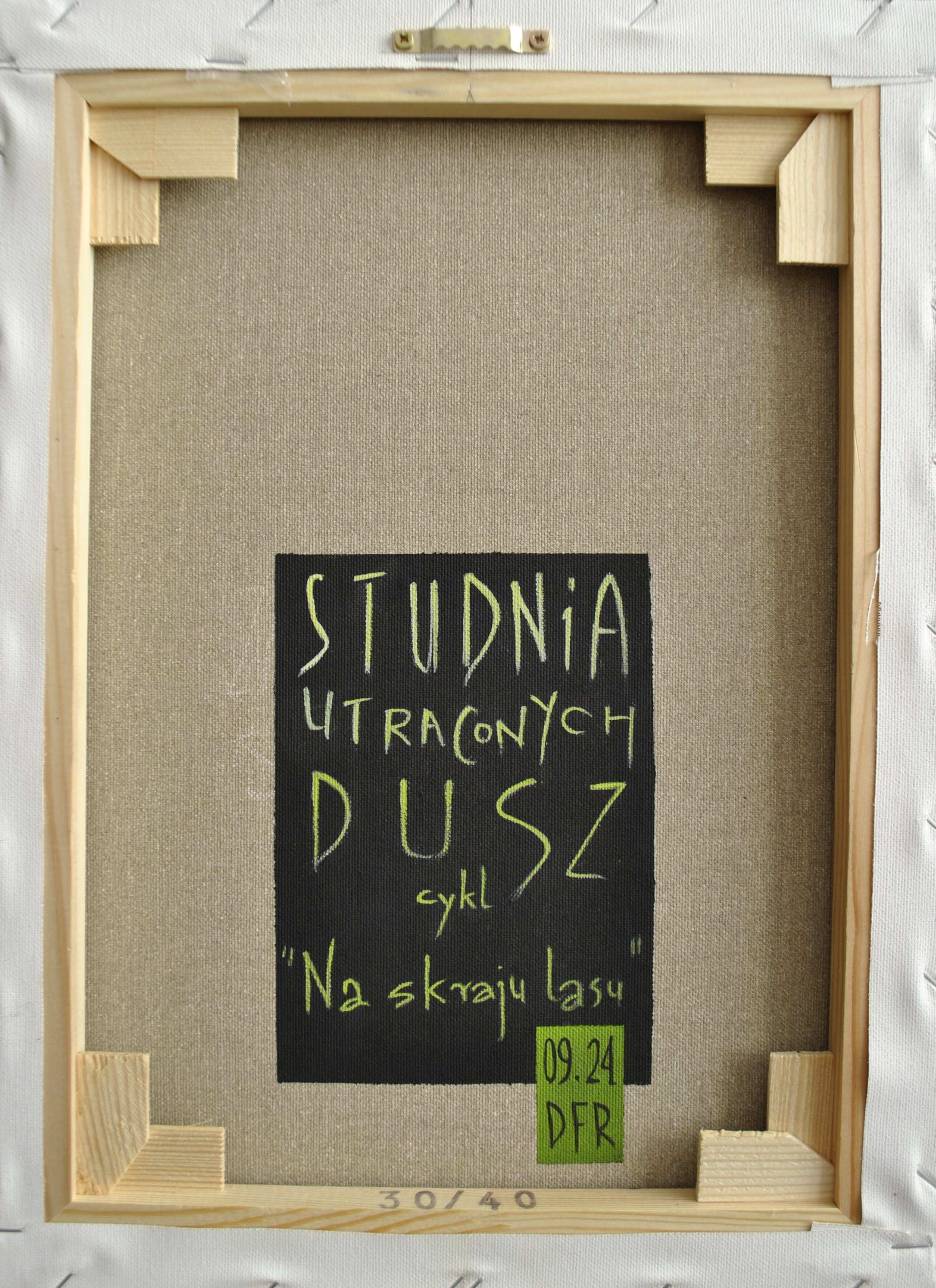 Obraz wykonany w technice akrylowej na podobraziu bawełnianym. Nieoprawiony/ramka na życzenie, zabezpieczony werniksem WINSOR/NEWTON. Posiada zawiesie/gotowy do zawieszenia na ścianie. Obraz stanowi fragment fantazyjnego cyklu ''Na skraju lasu''. Porusza temat mitologicznej STUDNI DUSZ/nie mylić z tą w Jerozolimie ;)