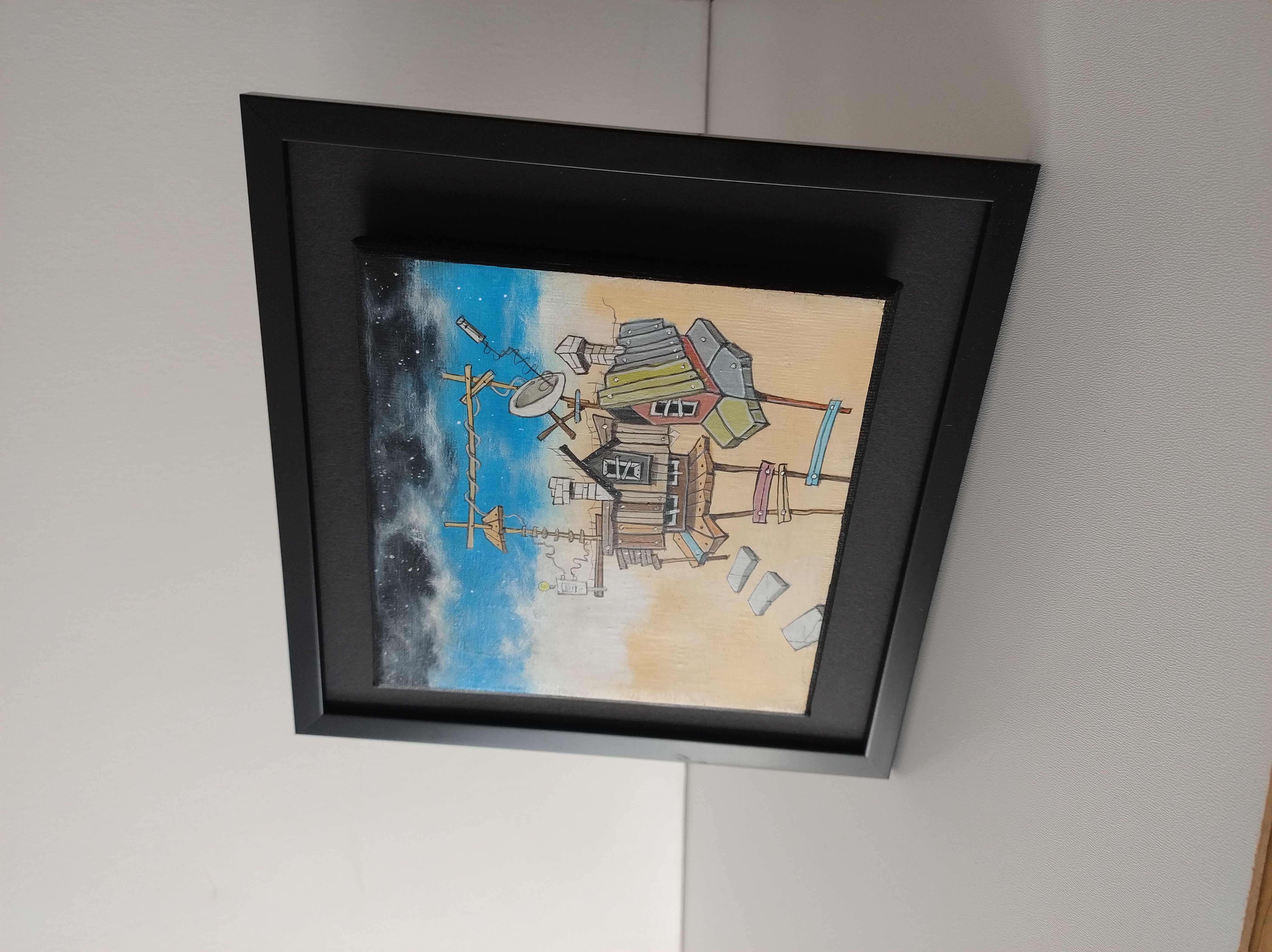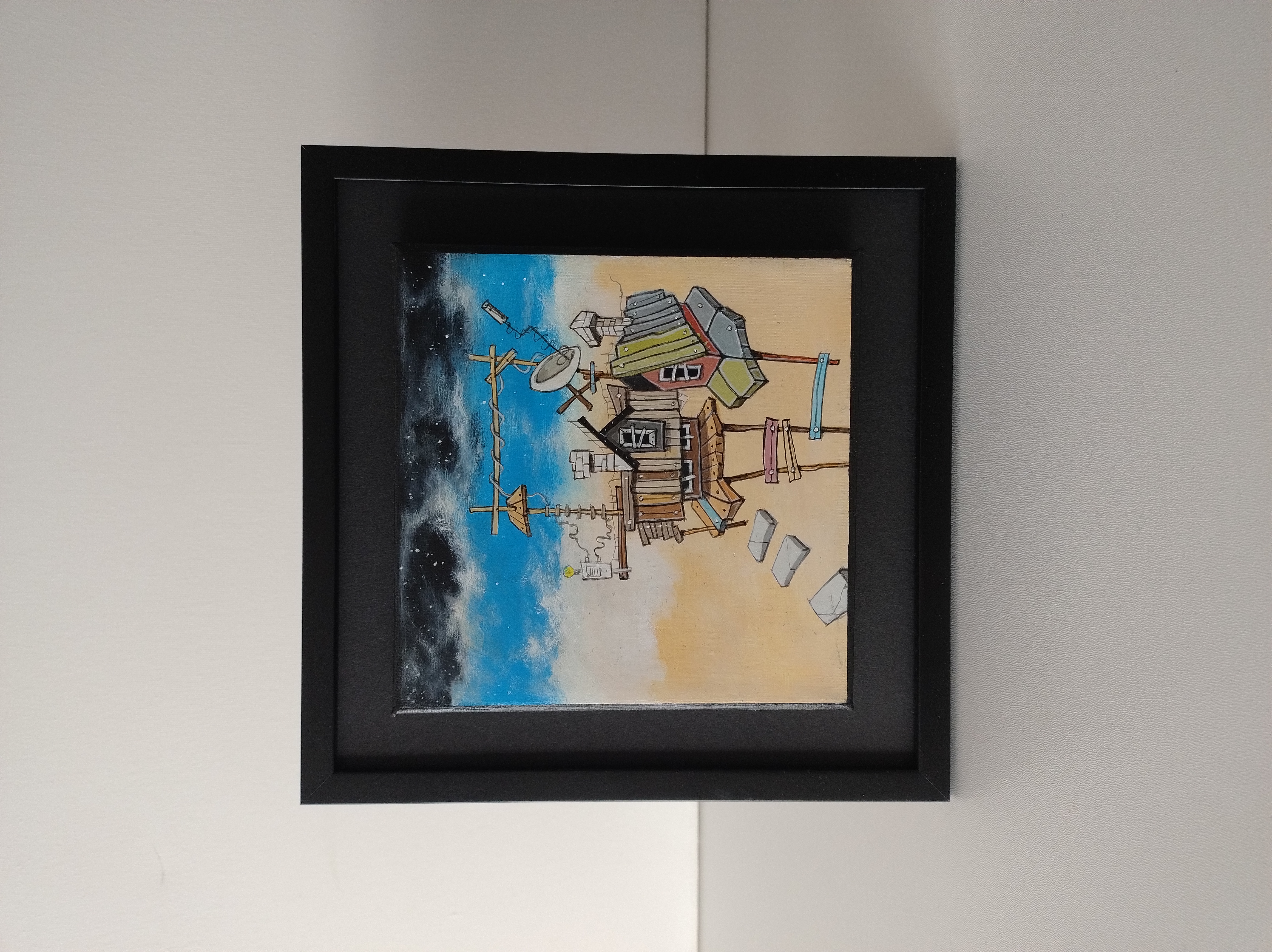 Miniaturka stanowi fragment serii ''Nie tak odległe..''. Wymiary płócienka: 15/15cm, ramka: 21/21cm. Namalowany został farbami akrylowymi na płótnie bawełnianym, zabezpieczony został werniksem Winsor/Newton/połysk.