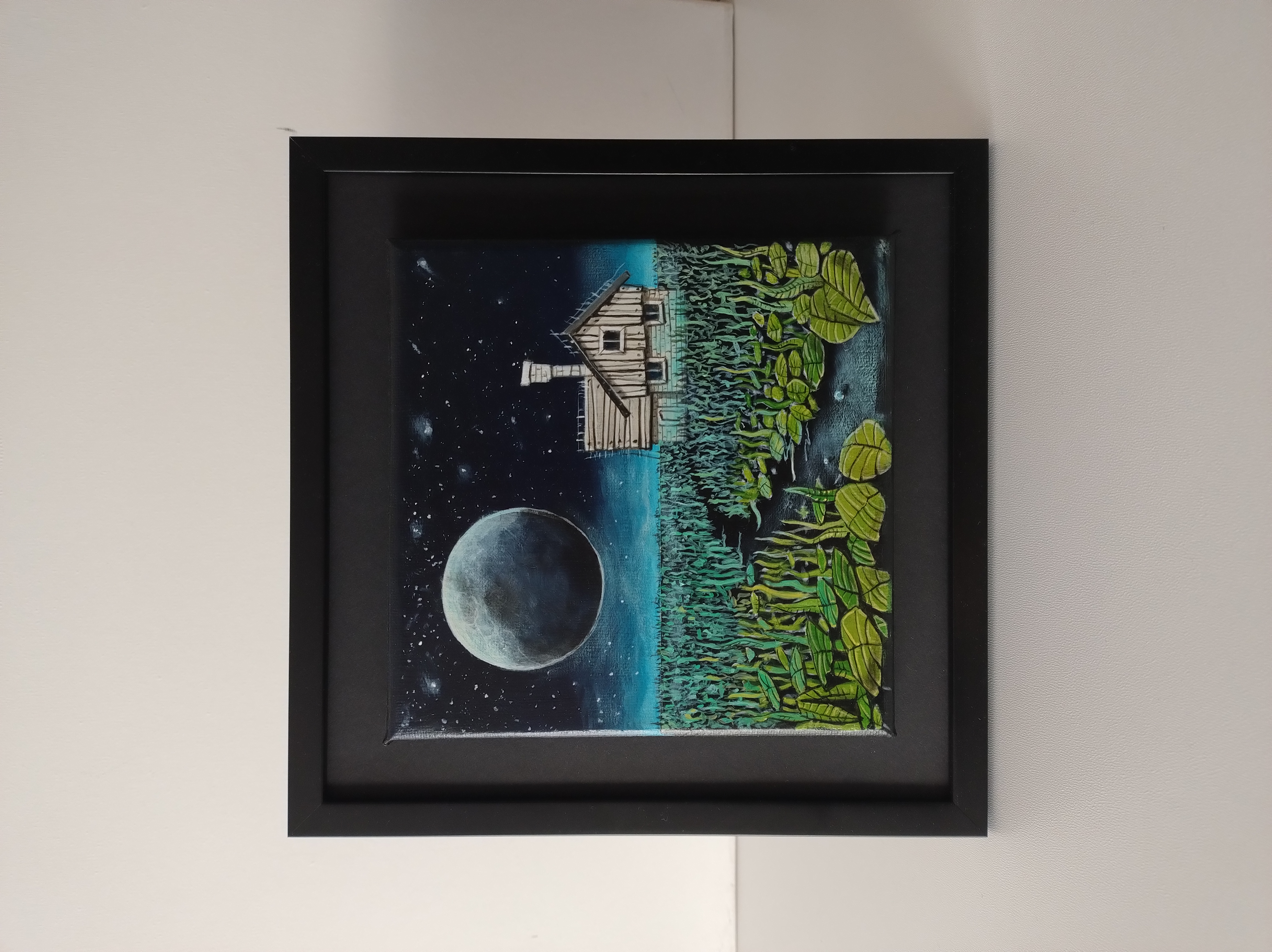 Miniaturka stanowi fragment serii ''Nie tak odległe.. ''Wymiary płócienka: 15/15cm, ramka: 21/21cm. Obrazek namalowany został farbami akrylowymi na płótnie bawełnianym, zabezpieczony werniksem Winsor/Newton/połysk.