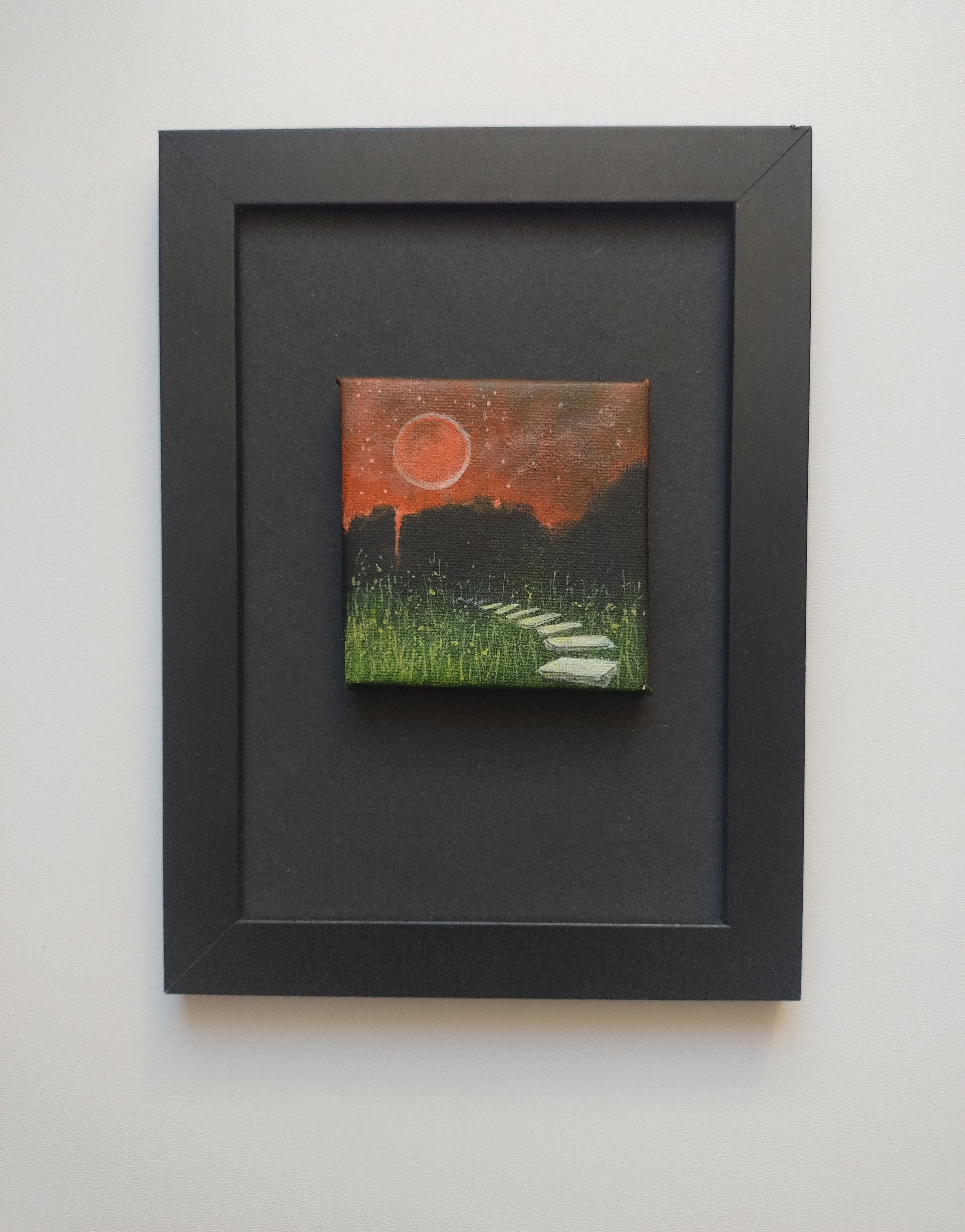 Miniaturka stanowi fragment serii ''Na skraju lasu''. Wymiary płócienka: 7/7cm, ramka: 21/15cm. Obrazek został namalowany farbami akrylowymi na płótnie bawełnianym, zabezpieczony werniksem Winsor/Newton/połysk.