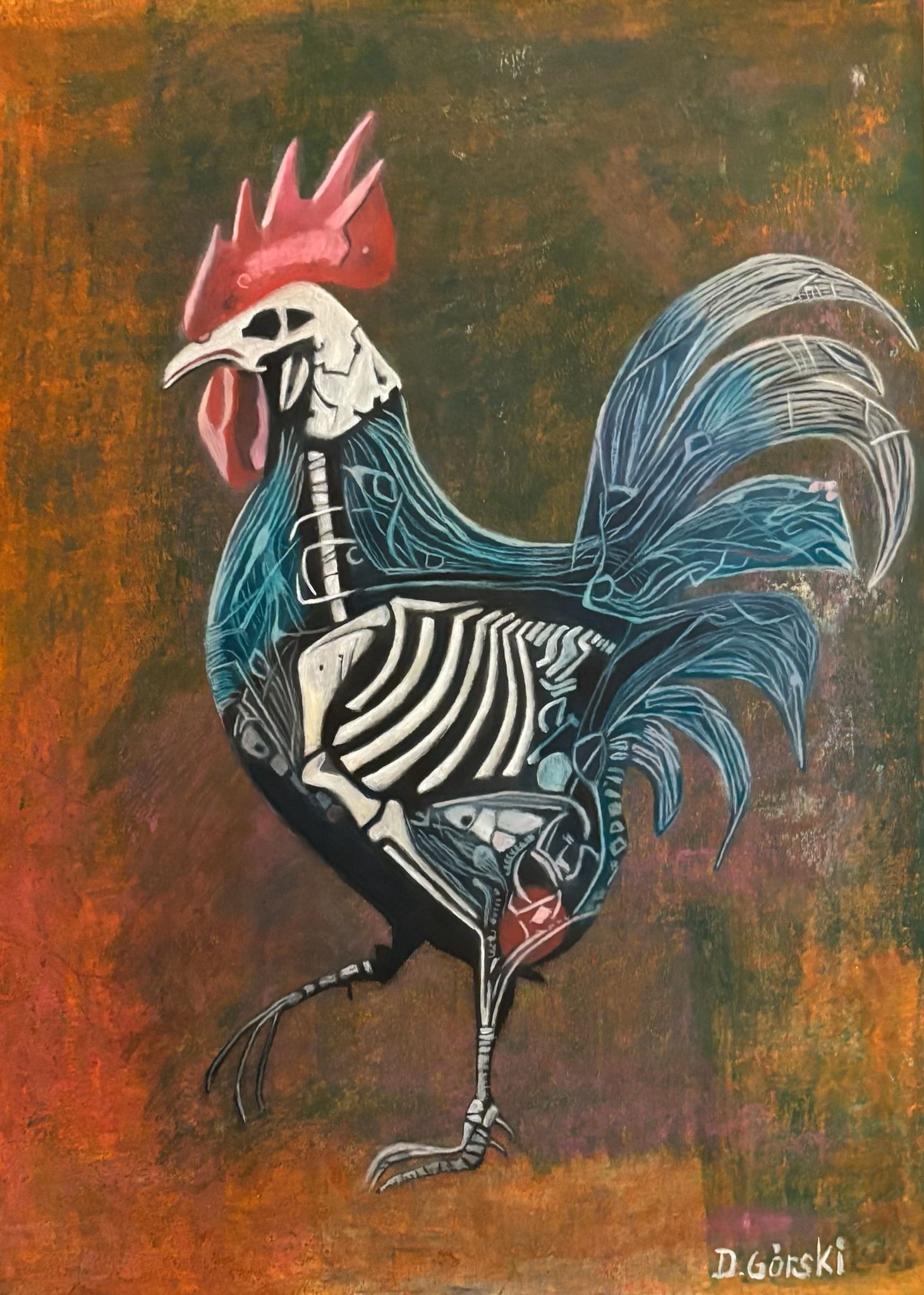 Na obrazie widzimy oryginalną kompozycję, na której centralną postacią jest kogut. Jego ciało jest ukazane w nietypowy sposób, jakby przezroczyste, ujawniając wewnętrzną strukturę kości. Bieli kości kontrastuje z żywymi kolorami niebieskości i czerwieni, które dodają energii i dynamiki. Tło jest utrzymane w ciepłych, ziemistych odcieniach brązu i zieleni, co nadaje całemu dziełu tajemniczy vibe. Obraz emanuje zaskakującym połączeniem lekkości i powagi. Styl artystyczny jest odważny, niemal surrealistyczny, z wyraźnymi liniami i wyrafinowanymi detalami, które przyciągają wzrok. Technika artysty zdaje się oscylować między realizmem a abstrakcją, co czyni ten obraz intrygującym. Wywołuje ciekawość i pewną refleksję nad kruchością życia, choć z drugiej strony, dzieci mogą powiedzieć: "ten kogut wygląda jak robot!" Patrząc na niego, można poczuć pewną fascynację procesami zachodzącymi w naturze. Dzieło prowokuje do zastanowienia się nad wewnętrzną budową stworzeń i pięknem strukturalnym. A wszystko to z delikatnym poczuciem humoru i surrealistycznym twistem.