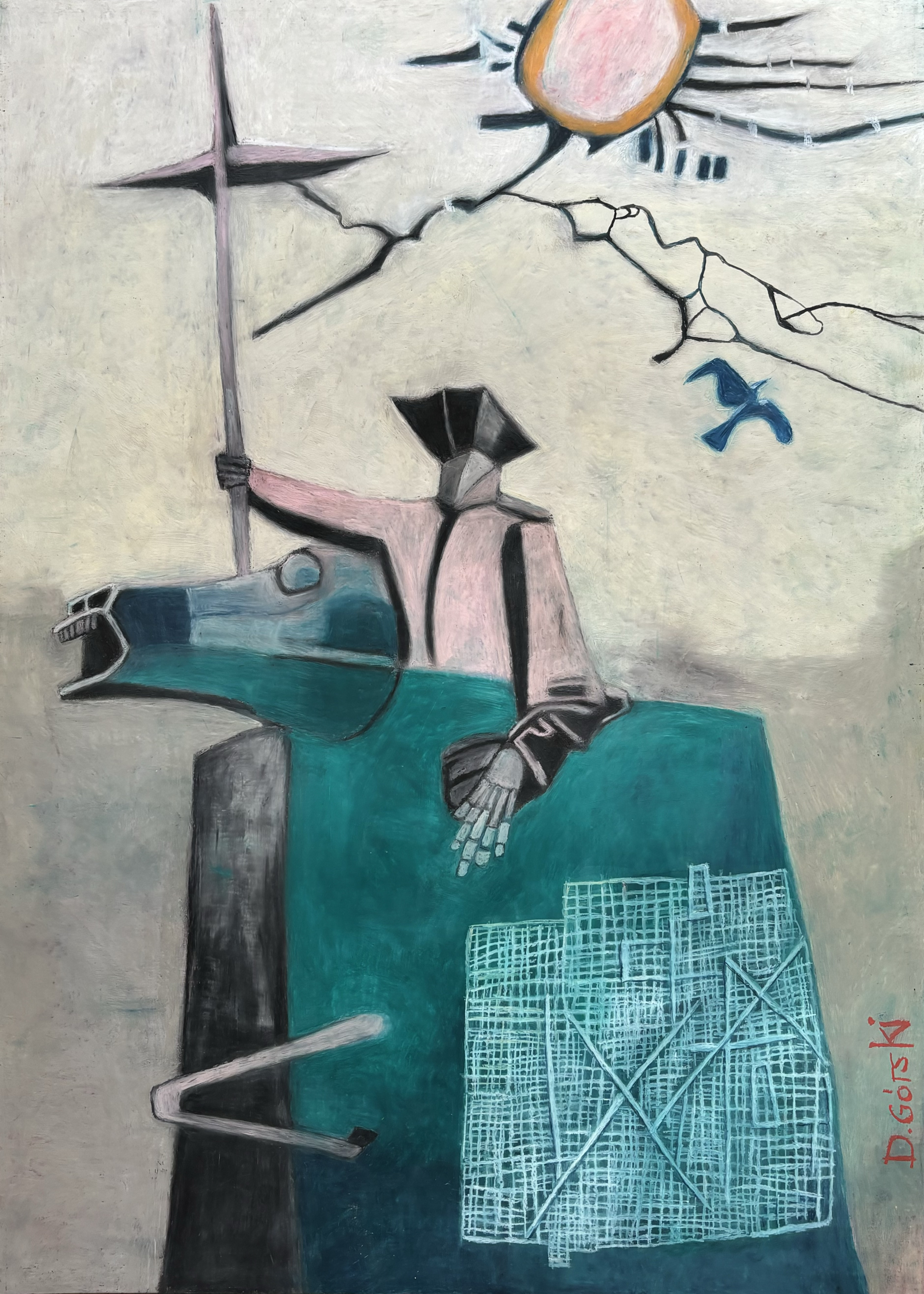 Obraz emanuje tajemniczą aurą, na której tle dominuje postać rycerza na czarnym rumaku. Kompozycja jest minimalistyczna, z dominującymi turkusowymi i szarymi barwami. Rycerz trzyma długą, wygiętą lancę, której czubek zdaje się przecinać niebo, przypominającym graffiti. Kanciasta sylwetka jeźdźca kontrastuje z organicznymi liniami tła, gdzie można dostrzec słońce niczym z dziecięcego rysunku. Całość nadaje surrealistycznego charakteru. Moim zdaniem artysta zastosował technikę olejną z elementami kubizmu, co widać w płaskich geometrycznych kształtach. Nastrój jest melancholijny, ale z nutką buntu. Można poczuć echo nostalgii, jakby rycerz był symbolem zagubionego czasu. Dzieło wywołuje uczucie niepokoju, zmuszając do zadumy nad samotnością bohatera. Jeden z ptaków na obrazku zdaje się lecieć beztrosko, dmuchając w twist of freedom. Dziecko mogłoby powiedzieć: "Patrz mamo, ten pan ma dziwny kapelusz!" Często zastanawiam się, jaka historia kryje się za taką nietypową sceną. Czy to opowieść o niemożliwych marzeniach? Obraz obudził we mnie wiele emocji, od uśmiechu po refleksję o sztuce jako wyrazie wolności.