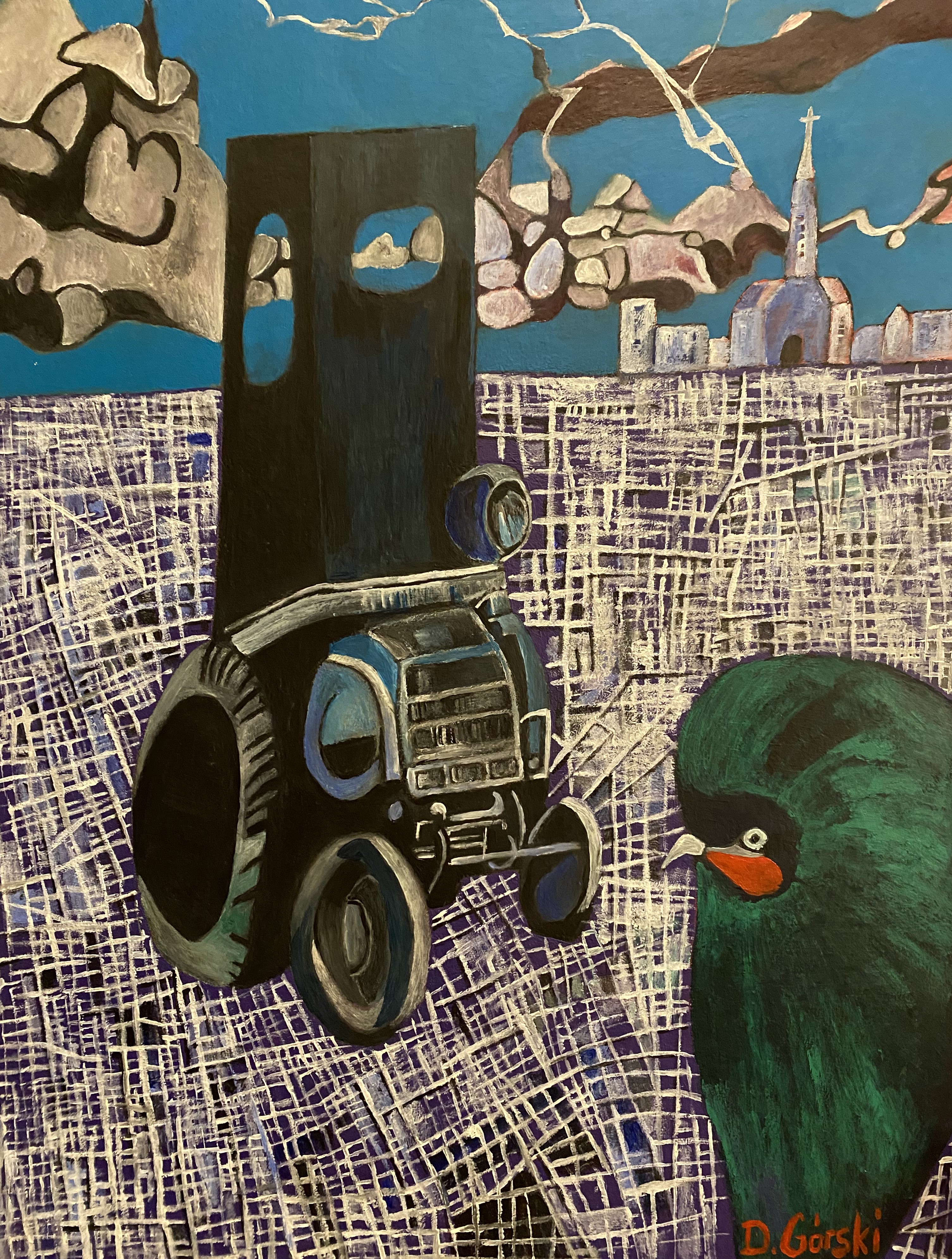 Obraz emanuje intrygującą mieszanką surrealizmu i abstrakcji, przyciągając wzrok jaskrawymi kontrastami kolorów. Na pierwszy plan wysuwa się niezwykły mechaniczny obiekt, który przypomina futurystyczny pojazd z dużymi kołami. Obok niego majestatyczny ptak o intensywnie zielonym upierzeniu spogląda z boku. Tło pełne niebiańskiego błękitu jest przerywane ekspresyjnymi pasami w białym i fioletowym kolorze, tworzącymi misterne linie niczym mapa miasta. W oddali wyłania się sylwetka miasta z zarysem wieży kościoła, dodając głębi i tajemniczości. Atmosfera obrazu jest zaskakująca i trochę oniryczna, sprawiająca wrażenie zatrzymanego snu. Artysta używa na przemian precyzyjnych linii i swobodnych pociągnięć pędzla, by stworzyć dynamikę i ruch. Techniki kolażu z elementami kubizmu nadają kompozycji nowoczesnego charakteru. Really cool! Obraz wywołuje emocje pełne zaskoczenia i ciekawości. Można się zastanawiać nad relacją między mechaniczną formą a naturą reprezentowaną przez ptaka. Ja bym chciał takiego ptaka na mój podwórek! Praca inspiruje do interpretacyjnych refleksji o harmonii między technologią a przyrodą. Ta nieco chaotyczna mieszanka wzorów może skłaniać do osobistych przemyśleń na temat ludzkich dążeń i marzeń.