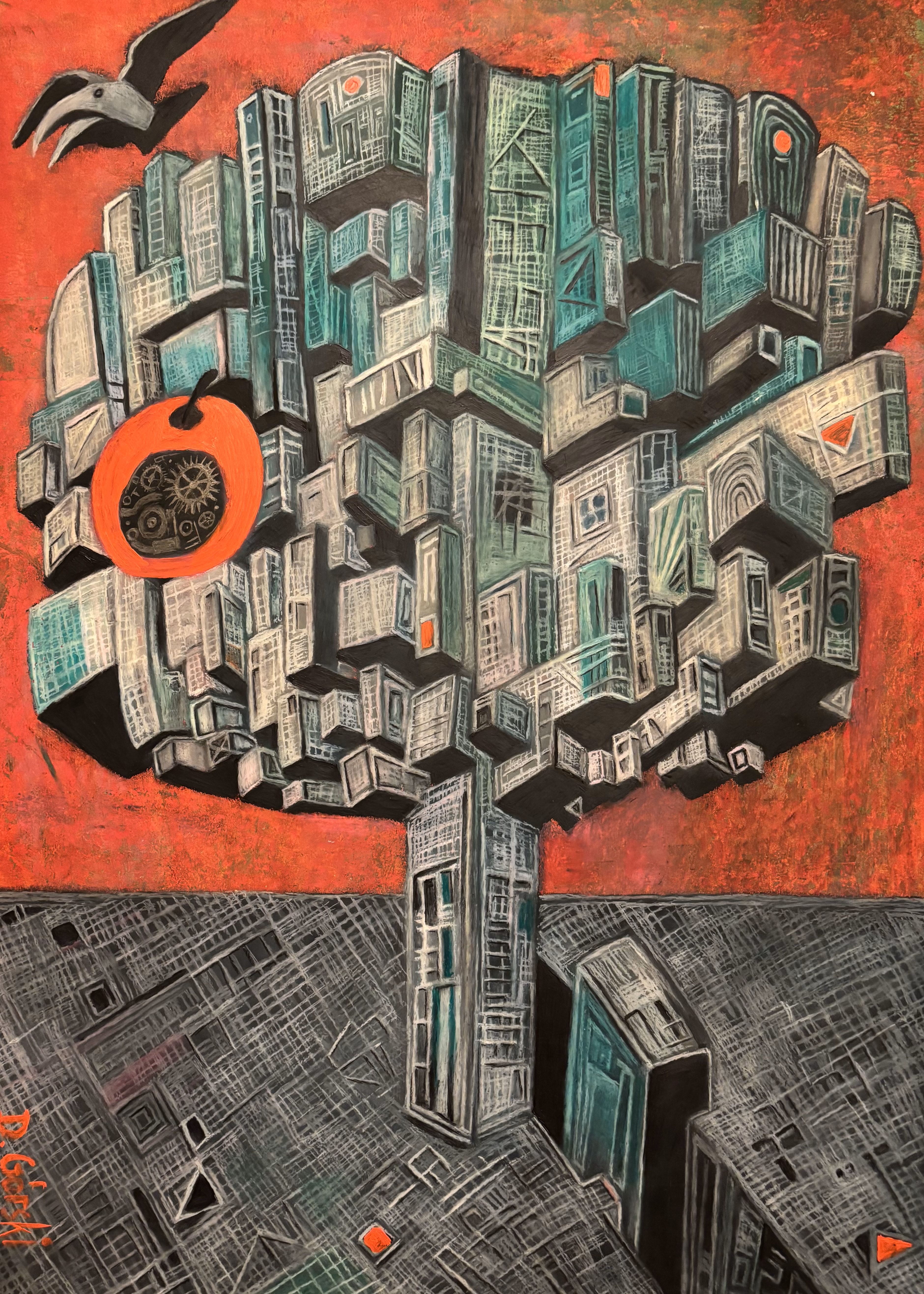 Obraz przedstawia niesamowitą kompozycję, która na pierwszy rzut oka przypomina drzewo zbudowane z bloków lub budynków. Dominuje tutaj jasnozielony turkus, który kontrastuje z intensywnym, ciepłym tłem o barwie czerwonego pomarańczu. Linie są ostre i geometryczne, co nadaje całości strukturalnego charakteru, jakby miasto przybrało postać drzew. W prawym górnym rogu przelatuje czarny ptak, a u góry gałęzi duży owoc przypomina pomarańczowy zębaty mechanizm - trochę jak w zegarku, co może symbolizować przemijanie czasu. Artystycznie jest to połączenie surrealizmu i abstrakcji. Widoczne są też elementy kubistyczne w formie sześciennych brył. To, co wyłania się z obrazu, to intrygujący nastrój – trochę tajemniczy, trochę niepokojący. Czy to miasto ma swoje korzenie? A może to wizja przyszłości, gdzie natura i urbanizm łączą się w jedno? Myślę, że jest to idealny przykład "thinking outside the box". Patrząc głębiej, urządzenie na drzewie może wywoływać refleksję o symbiozie natury i technologii, o tym jak jedno wpływa na drugie. Można się też zastanawiać, co czyni to drzewo tak wyjątkowym. Kolory są na granicy chaosu, ale tworzą harmonijną całość. Jak dla mnie, ten obraz po prostu żyje. A może to miasto w przyszłości, gdzie ludzie mieszkają na drzewach? Fascynujące i pełne możliwości do interpretacji.