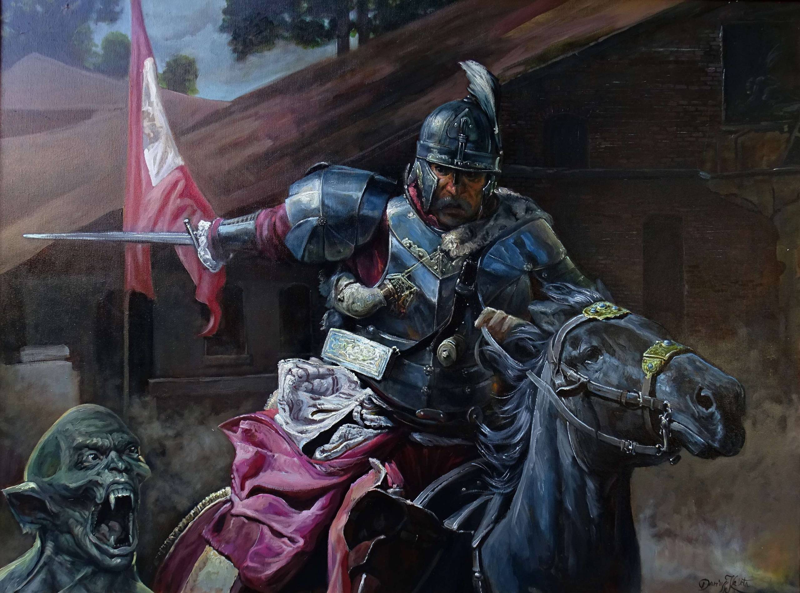 Na obrazie widzimy wojownika w pełnym pancerzu, dynamicznie wysuniętego na przód na czarnym rumaku. Kolory są intensywne, przeważają ciemne tony metalu jego zbroi, które kontrastują z bogatą czerwienią materiału opływającego jego postać. W tle wyłania się budynek z cegły, a nad wszystkim powiewa flaga dodającej dramatyzmu scenie. Wyraz twarzy wojownika mówi: jestem gotowy na wszystko. Atmosfera obrazu jest napięta i pełna dramatyzmu. To jak chwila przed wielkim starciem. Styl artysty przypomina barokowe malarstwo, z naciskiem na detale i grę światłocieniem. Technika zdaje się mieszać realistyczne szczegóły z pewną dozą fantazji. Jest w tym coś magicznego! Patrząc na obraz, można poczuć respekt do odwagi i determinacji wojownika, ale też strach, bo z boku wyłania się przerażająca bestia. Dla 7-letniego dziecka: "To wygląda jak bajka o rycerzu!" Może wywołać w nas refleksję o walce, nie tylko tej fizycznej, ale też życiowej. I think, że artysta chciał pokazać, jak każdy z nas jest czasem wojownikiem.