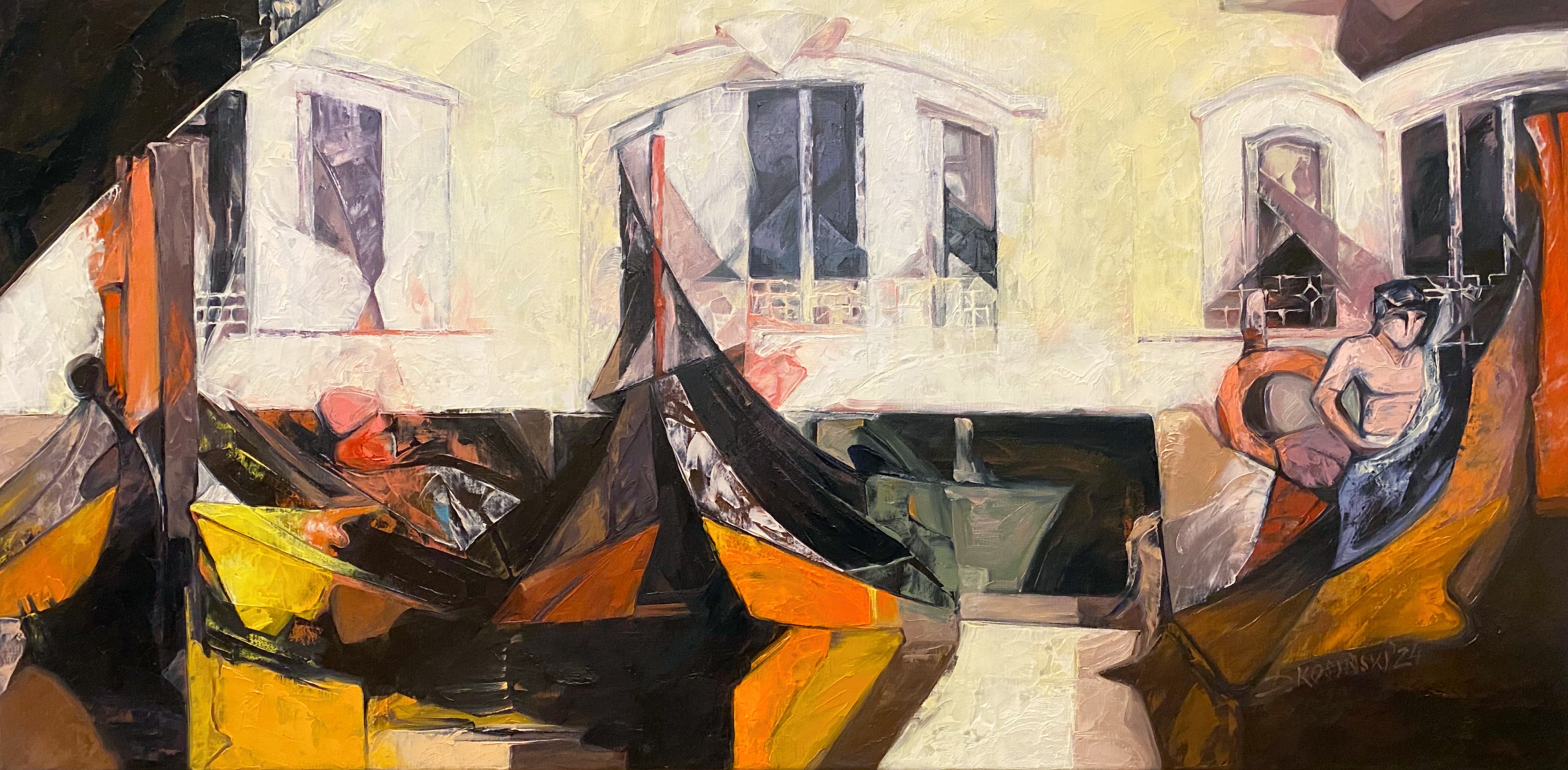 Obraz przedstawia gąszcz gondoli na tle jasnej fasady budynku, gdzie dominuje intensywny żółty kolor przeplatający się z głęboką czernią i ciepłymi odcieniami pomarańczu. Kompozycja dynamiczna, przypomina żywy szum miejskiego kanału, gdzie linie poszczególnych łodzi chaotycznie przecinają się, tworząc niemal abstrakcyjną mozaikę kształtów. Chłodna biel budynku w kontraście z ciepłymi tonami łodzi nadaje dziełu harmonijny balans, emanujący spokojem mimo chaosu form. Atmosfera obrazu jest jak sobotnia wycieczka do parku – pełna energii, jednocześnie zaprasza do refleksji nad przepływem czasu i miejscem człowieka w tym zgiełku. Artysta posługuje się techniką impasto, nanosząc grubą warstwę farby, co dodaje obrazowi tekstury i głębi. Pędzel jest swobodny, niemal jakby innym dłoń ją prowadziła, co nadaje dziełu element spontaniczności. Obraz wywołuje mieszane emocje – z jednej strony fascynacja i zachwyt nad ulotnością chwili, z drugiej nostalgia za miejscami gdzie czas płynie wolniej. Look at this! Tak jak mówi 7-letnie dziecko z iskrą w oku, obraz bawi się naszą percepcją i wyobraźnią. Patrząc na niego, trudno nie poczuć się choć przez chwilę częścią tej wizualnej symfonii światła i koloru.