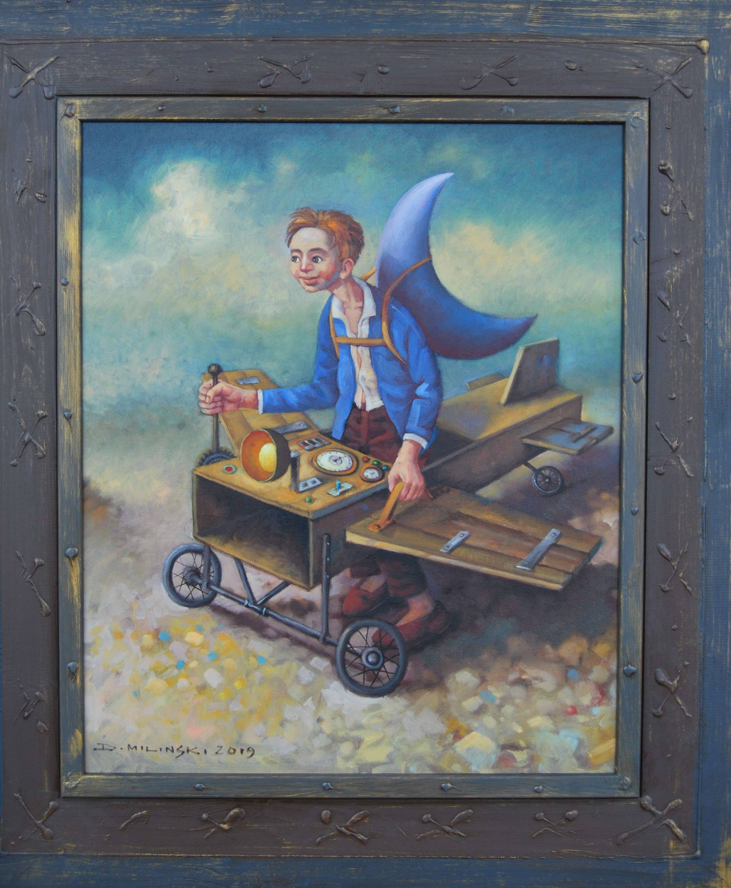 Obraz przedstawia chłopca z ogromnym marzeniem o lataniu. Kolory są wyraźne, dominują błękity, brązy i zielenie, które tworzą niemalże surrealistyczną scenerię. Jest on ubrany w niebieską marynarkę, a na plecach ma przymocowane wielkie skrzydło, przypominające trochę płetwę rekina. To wprowadza element dziecięcej fantazji i swoistego "adventure". W rękach trzyma drążek sterowy, stojąc obok prymitywnej konstrukcji przypominającej wózek na kółkach z przyrządami. Scena zanurzona jest w lekko mistycznej mgiełce, co podkreśla ten magiczny nastrój. Na pierwszy rzut oka technika artystyczna wydaje się być mieszanką realizmu z pewnymi elementami bajkowości. Pociągnięcia pędzla są precyzyjne, a jednocześnie pełne swobody – artysta bawi się formą i kolorem, tworząc ten dreamlike świat. Może to prowokować odbiorcę do refleksji na temat dziecięcych marzeń i ich nieograniczoności. Kiedy patrzę na ten obraz, przypomina mi się czas, gdy byłem dzieckiem i marzyłem o niemożliwych rzeczach. Wzbudza we mnie nostalgię za tymi chwilami, kiedy wszystko wydawało się możliwe. Chłopięca determinacja mówi: "I'm not afraid to dream big". Patrząc na tę scenę, aż chce mi się powiedzieć: "Wow, ale super skrzydła!" Atmosfera obrazu jest pogodna, pełna nadziei i niewinności, jak typowe marzenia małego odkrywcy.