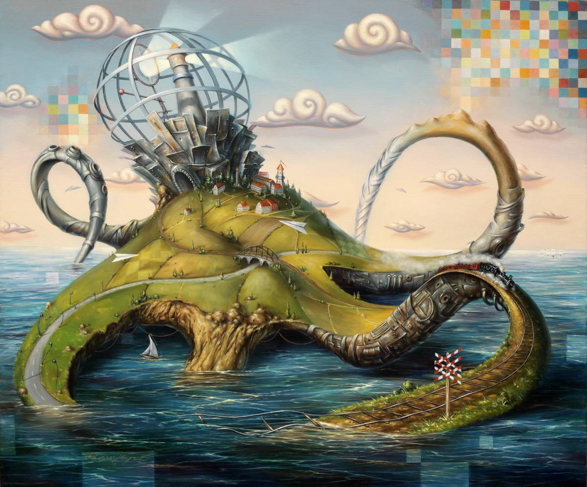 Na obrazie widać surrealistyczny pejzaż, w którym wyspa unosi się na niebieskiej tafli oceanu. Wyspa ma kształt gigantycznej kałamarnicy z wielkimi mackami i pokryta jest soczyście zielonymi polami. W środku wyspy wznosi się konstrukcja przypominająca futurystyczne miasto, oplecione metalowymi pierścieniami. Kolory są żywe: dominują zielenie, błękity i srebrzyste szarości. Atmosfera jest nieco tajemnicza, pełna intrygi. Jakbyśmy wpadli do innego świata, gdzie prawa fizyki się nie liczą. Styl obrazu jest zdecydowanie magiczny, z nutką absurdu. Technika artysty łączy realizm z elementami fantastycznych pejzaży. Emocje, które budzi ten obraz, to głównie zdumienie i ciekawość. Kto by pomyślał, że kałemarnica może być wyspą? Jakie przygody można by tam przeżyć! Może obraz ma na celu przypomnienie, że w życiu zawsze jest miejsce na odrobinę magic. Ta mieszanka realnych i nierealnych elementów tworzy unikatowe doświadczenie, zachęcając widza do refleksji nad otaczającym światem i jego nieskończonymi możliwościami.