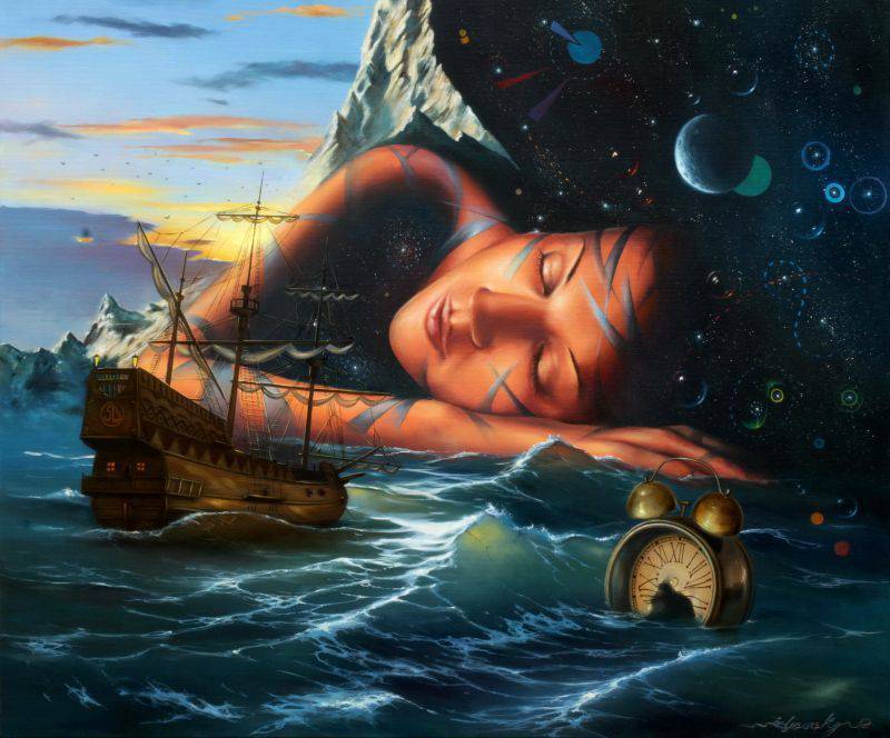 Oto niezwykły obraz, który przenosi nas w magiczny świat snów i wyobraźni. Dominują tu głębokie odcienie granatu i błękitu oceanu, które współgrają z ciemnym, rozgwieżdżonym niebem. Środek kompozycji zdobi spokojna twarz śpiącej osoby, wtulonej w fale, niczym kołdra z morskiej piany. Statek w lewym rogu zdaje się płynąć wśród gwiazd i planet, jakby podróżował między wymiarami. Obok, gigantyczny, pokręcony zegar przypomina, że czas w tym świecie ma własne prawa. Atmosfera obrazu emanuje fantazją i spokojem, jakby opowieścią z książki dla dzieci. Styl artysty, przypominający realise w surrealizmie, mistrzowsko łączy oniryczne motywy z rzeczywistością. To niezwykłe dzieło wywołuje w widzu refleksję nad naturą snów i naszą zdolnością do marzeń. Patrząc na to, aż chce się powiedzieć „wow!”. Maluch w środku mówi „ale to fajne!” Ten kawałek sztuki to prawdziwe “dreamscape” i zachęca do podróży w głąb własnej wyobraźni.