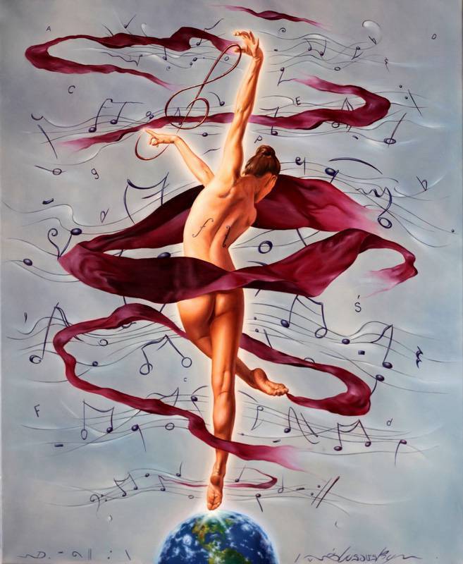 Na tym obrazie widzimy tancerkę unoszącą się nad kulą ziemską, oplecioną wstęgą w głębokim odcieniu burgunda. Jej ciało jest wygięte w eleganckim tańcu, jakby próbowała dotknąć muzyki wirującej wokół niej. Nuty i linie melodyczne płyną przez tło, tworząc wrażenie ruchu oraz harmonii. Tancerka zdaje się być one with the music. Kolory są żywe, dominują ciepłe tony skóry artystki oraz chłodne błękity kuli ziemskiej. Atmosfera jest pełna magii i lekkości, wprowadzając widza w stan uniesienia. Styl przypomina surrealizm, łącząc realistyczne detale z fantastycznymi elementami. Artysta zastosował precyzyjne pociągnięcia pędzla, by oddać dynamikę ruchu. Może kojarzyć się to z uczuciem uwolnienia i radości tańca oraz pasji. Obraz ten może wywołać poczucie zachwytu i refleksji nad istotą sztuki oraz jej wpływem na ludzką duszę. Wow, mogłabym tańczyć cały dzień!