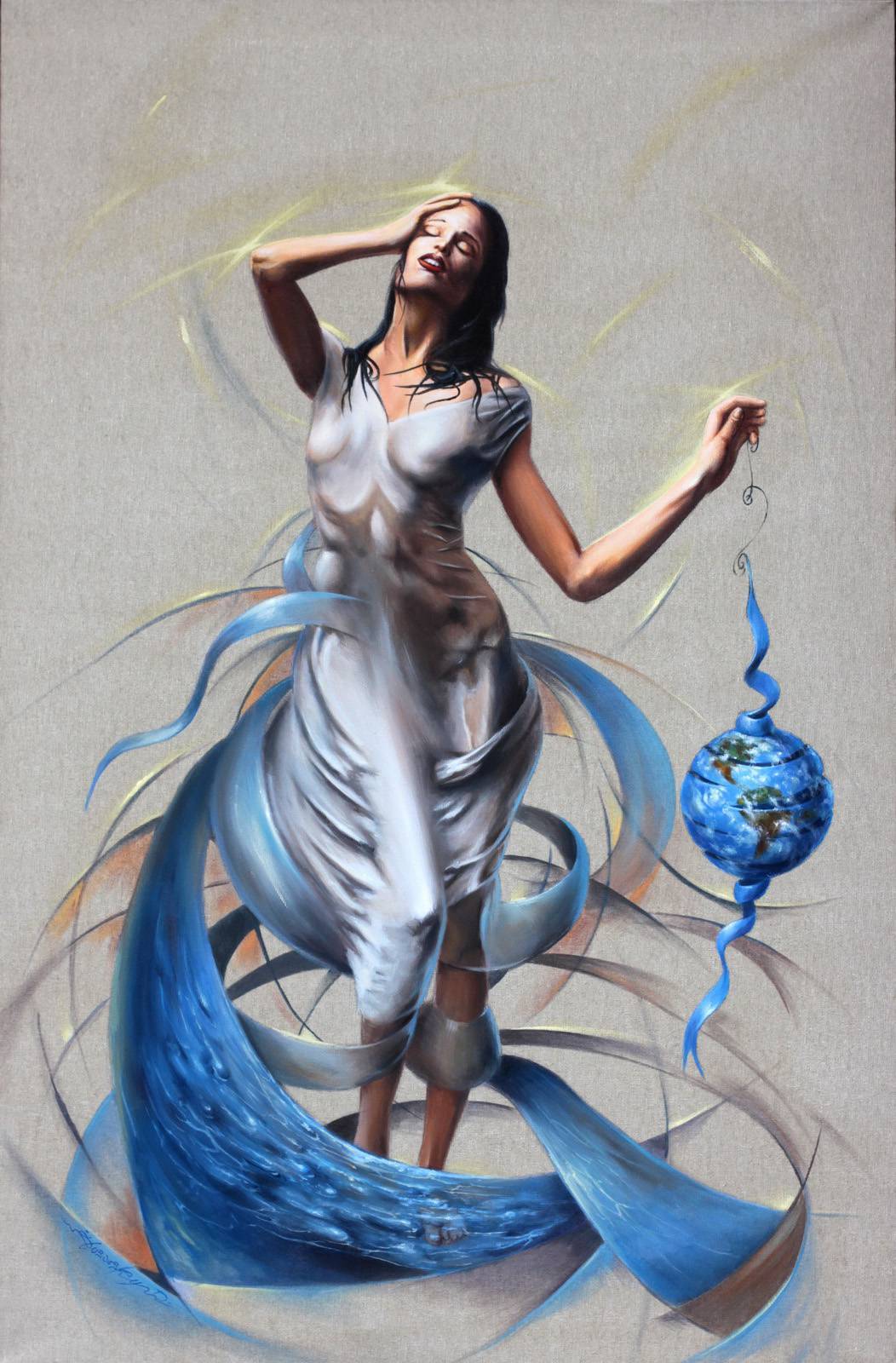 Na obrazie widzimy postać kobiety unoszącej się w otoczeniu falujących, niebieskich wstęg. Całość wypełnia miękka paleta barw, z dominacją błękitów i ziemistych tonów, które pięknie kontrastują z jej jasną suknią. Kompozycja zdaje się tańczyć, kształty są płynne, niemal magiczne, co nadaje dziełu dynamicznego charakteru. Kobieta ma subtelny wyraz twarzy, jakby tkwiła w głębokiej zadumie lub śnie. Atmosfera emanuje spokojem i nostalgią, a jednocześnie dodaje nutę tajemniczości. Artysta użył delikatnych pociągnięć pędzlem, co nadaje teksturze miękkości i finezji. Patrząc na ten obraz, czuje się pewną tęsknotę. Stop trying to stop looking at it. Jest w tym coś urzekającego, coś, co pobudza wyobraźnię. Mały glob ziemski zawieszony na niebieskiej wstążce dodaje elementu symboliki - może troska o planetę w rękach kobiety. Obraz może wywołać refleksję nad naszym miejscem we wszechświecie. To jak sen, który przenosi do innej rzeczywistości. Fajnie by było zostać przyjacielem tej pani. Dzieło zachwyca swoją lekkością, a zarazem powagą, wciąga w swój świat i zaprasza do głębszej kontemplacji.