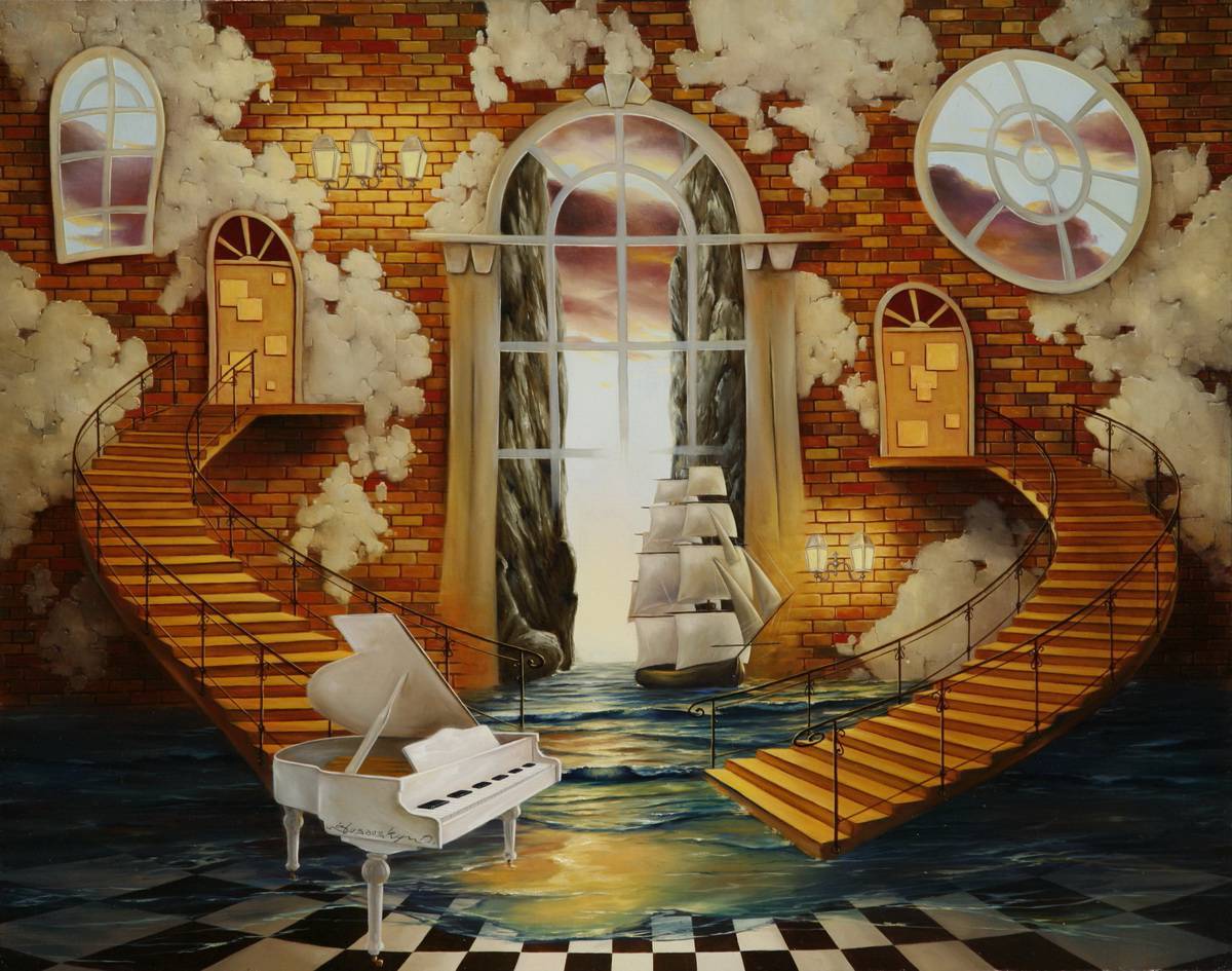 Obraz emanuje niezwykłą magią, łącząc elementy realne z tymi rodem z marzeń. Na pierwszy plan wysuwa się biały fortepian ustawiony na podłodze w szachownicę, który zdaje się prowokować dźwiękiem nieskończone melodie. W tle rozpościerają się kręte schody, wijące się pośród ceglastych ścian. Ich ciepłe, żółto-brązowe barwy wprowadzają przytulną, choć tajemniczą atmosferę. W centralnej części obrazu dominują ogromne okna z widokiem na zamglone morze, przez które majestatycznie płynie żaglowiec. Całość komponuje się niczym surrealistyczny sen, gdzie rzeczywistość przecina się z wyobraźnią. Obraz utrzymany jest w stylu surrealizmu, gdzie artysta bawi się perspektywą, tworząc iluzję i oniryczny klimat. Emocje? No, U mnie to aż dech zapiera! Patrząc na to wszystko, można poczuć nostalgiczną tęsknotę za nieznanym. To trochę jak wejść do fantastycznej, sweet krainy pełnej cudów. Każdy detal, od przetartych cegieł po łagodny blask lamp, dodaje dziełu głębi, której nie da się opisać jednym słowem.