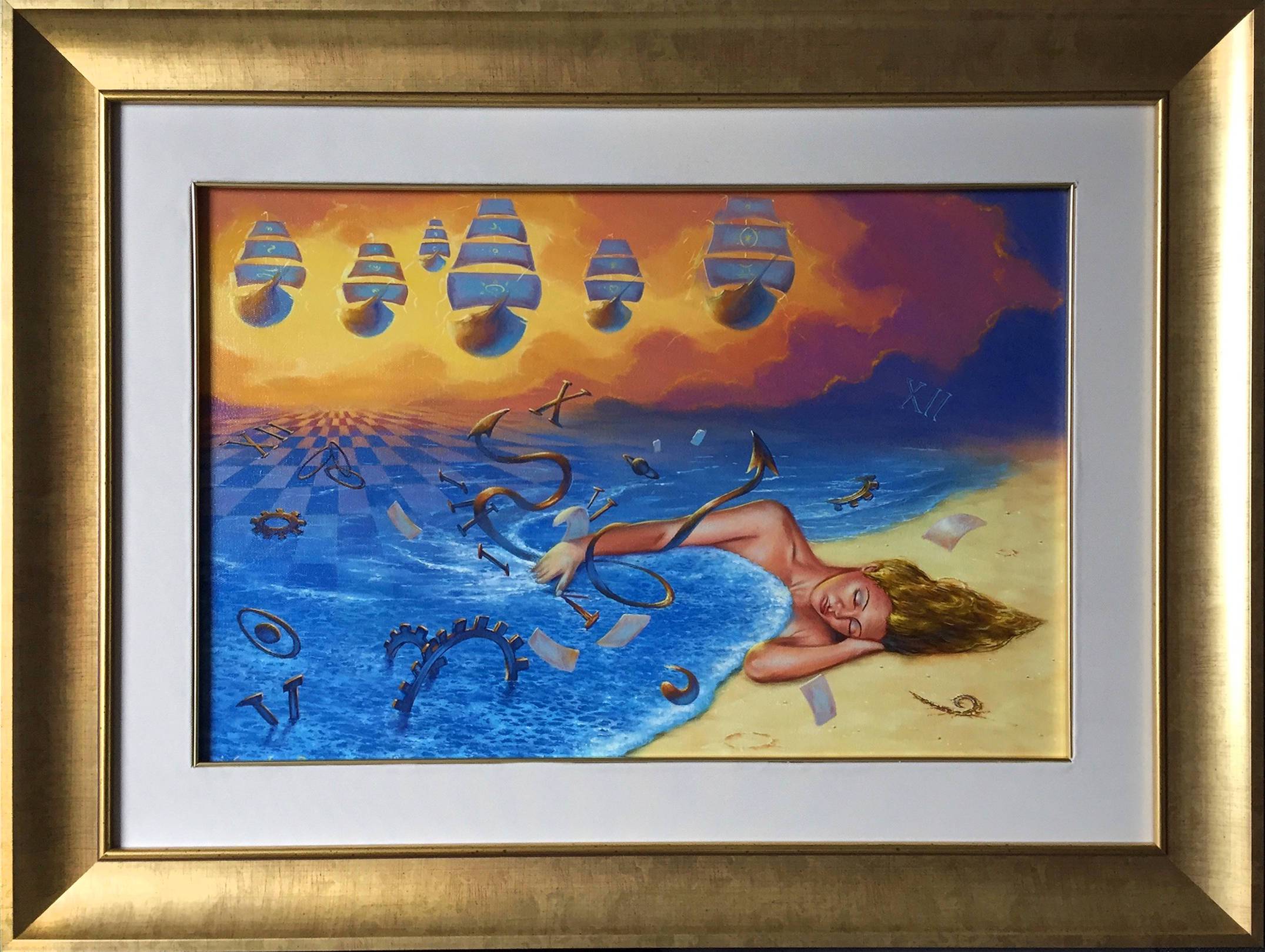Obraz to intrygująca kompozycja surrealistyczna, w której żywe kolory odgrywają kluczową rolę. Zorza w odcieniach pomarańczu i fioletu zapełnia tło, a błękitna woda płynnie łączy się z piaskiem, tworząc harmonijną całość. Kształty unoszących się statków wydają się być odrealnione, jakby zawieszone pomiędzy snem a jawą, co nadaje obrazowi aurę tajemnicy. Atmosfera obrazu to mieszanka spokoju i niepokoju. Jest w tym coś idyllicznego, ale też jakby surreal myśli przychodzą na myśl. Malownicze elementy zdają się być zanurzone w marzeniu sennym, co może wywoływać uczucia zadumy i refleksji. Styl obrazu przypomina nadrealizm, z użyciem technik malarskich, które podkreślają detale i głębię kolorów. Patrząc na ten obraz, można poczuć się jakby wciąganym w jego tajemniczy świat. Wywołuje on emocje związane z odkrywaniem nieznanego, jak podczas czytania książki z niekończącą się fabułą. To takie "wow", jakbyś odkrywał inną rzeczywistość. W obrazie jest też coś z dziecięcej naiwności, z którą siedmiolatek mógłby powiedzieć: "Hej, czy te statki naprawdę latają?". Fascynujący i zaskakujący, ten obraz pozostawia wiele miejsca na interpretacje i osobiste refleksje o pograniczu jawy i marzeń.