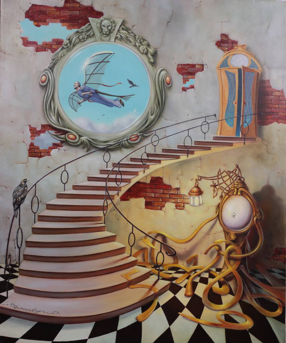 Obraz, który widzimy, to prawdziwy rollercoaster dla naszych oczu. Dominują tu ciepłe brązy i kremowe odcienie, które kontrastują z błękitem nieba w okrągłym oknie na ścianie. W centrum uwagi znalazły sie kręcone schody, które wyglądają jak wyjęte prosto z baśniowej opowieści. Czarno-biała szachownica na podłodze dodaje całości surrealistycznego charakteru. To jak sen na jawie. Atmosfera obrazu jest jednocześnie spokojna i niepokojąca. Mamy poczucie, jakby czas płynął tu inaczej, powoli i tajemniczo. Artysta zastosował techniki olejne, które nadają głębi i wyrazistości wszystkim elementom. To takie dreamy i nierealne. Moje serce bije szybciej na myśl, co kryje się za tamtymi drzwiami. Może inny świat! Ta scena wzbudza ciekawość i zachwyt, prawda? Wywołuje też refleksje o podróży i odkrywaniu nieznanego. Patrzę na to dzieło i myślę sobie: "Wow, chciałbym tam być!" A tamten człowiek w oknie, czy on naprawdę lata? Jak ptak, po prostu fruwa. Dzieło to łączy w sobie elementy realizmu z magią snu, co sprawia, że każdy detal ożywa w naszych myślach. Fascynujące, jak sztuka potrafi zabrać nas w tak odległe światy.